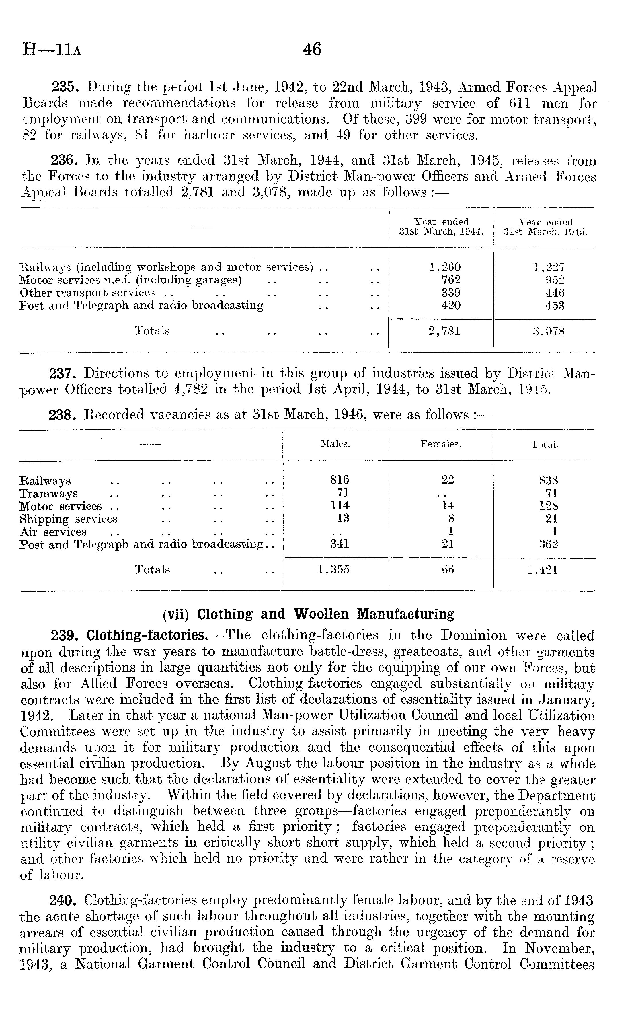 235. During the period Ist June, 1942, to 22nd March, 1943, Aimed Forces Appeal Boards made recommendations for release from military service of 611 men for employment on transport and communications. Of these, 399 were for motor transport, 82 for railways, 81 for harbour services, and 49 for other services. 236. In the years ended 31st March, 1944, and 31st March, 1945, releases from the Forces to the industry arranged by District Man-power Officers and Armed Forces Appeal Boards totalled 2,781 and 3,078, made up as follows