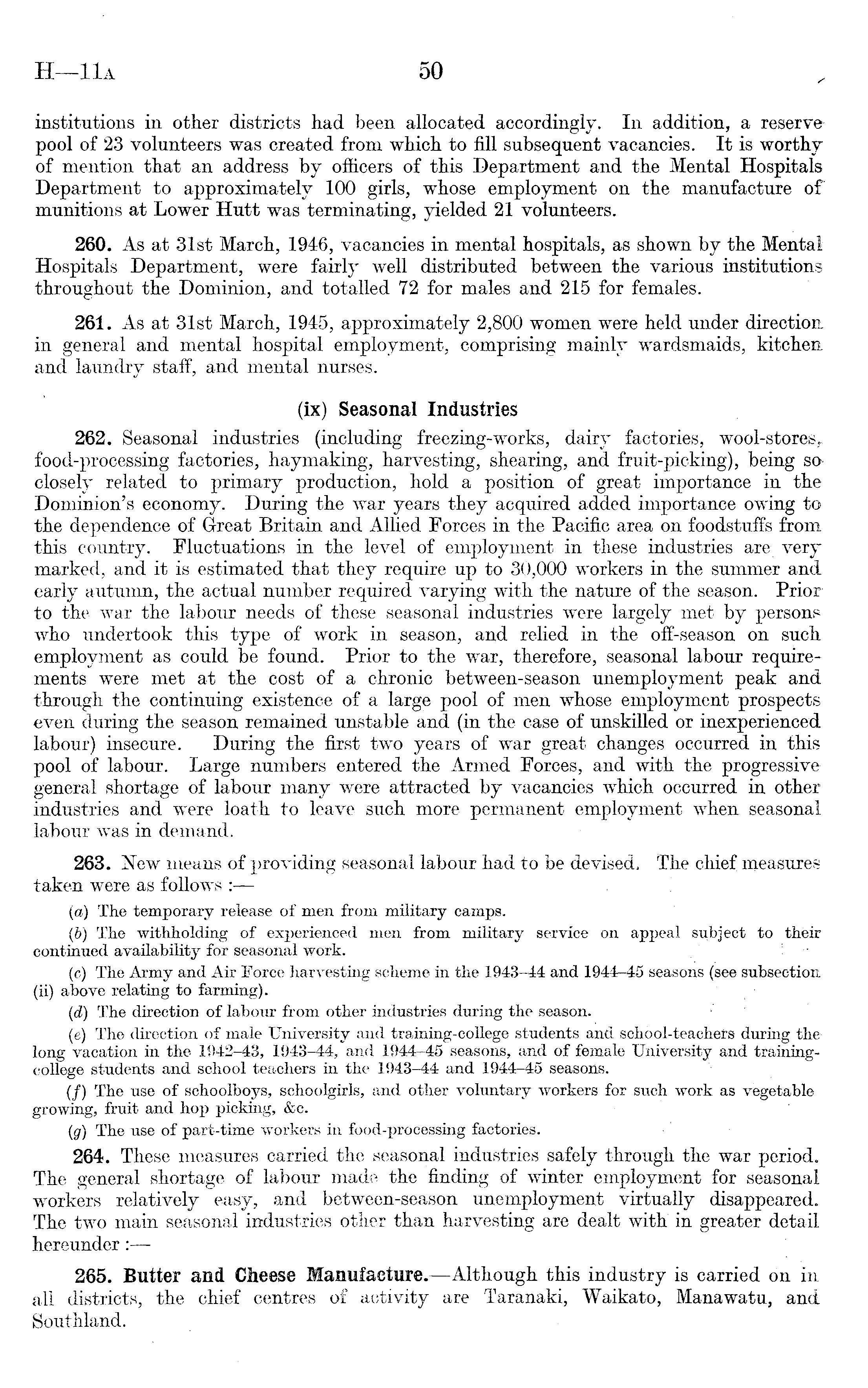 institutions in other districts had been allocated accordingly. In addition, a reserve pool of 23 volunteers was created from which to fill subsequent vacancies. It is worthy of mention that an address by officers of this Department and the Mental Hospitals Department to approximately 100 girls, whose employment on the manufacture of munitions at Lower Hutt was terminating, yielded 21 volunteers. 260. As at 31st March, 1946, vacancies in mental hospitals, as shown by the Mental Hospitals Department, were fairly well distributed between the various institutions throughout the Dominion, and totalled 72 for males and 215 for females. 261. As at 31st March, 1945, approximately 2,800 women were held under direction, in general and mental hospital employment, comprising mainly wardsmaids, kitchen and laundry staff, and mental nurses. (ix) Seasonal Industries 262. Seasonal industries (including freezing-works, dairy factories, wool-stores,, food-processing factories, haymaking, harvesting, shearing, and fruit-picking), being so closely related to primary production, hold a position of great importance in the Dominion's economy. During the war years they acquired added importance owing to the dependence of Great Britain and Allied Forces in the Pacific area on foodstuffs from this country. Fluctuations in the level of employment in these industries are very marked, and it is estimated that they require up to 30,000 workers in the summer and early autumn, the actual number required varying with the nature of the season. Prior to the war the labour needs of these seasonal industries were largely met by persons who undertook this type of work in season, and relied in the off-season on such employment as could be found. Prior to the war, therefore, seasonal labour requirements were met at the cost of a chronic between-season unemployment peak and through the continuing existence of a large pool of men whose employment prospects even during the season remained unstable and (in the case of unskilled or inexperienced labour) insecure. During the first two years of war great changes occurred in this pool of labour. Large numbers entered the Armed Forces, and with the progressive general shortage of labour many were attracted by vacancies which occurred in other industries and were loath to leave such more permanent employment when seasonal labour was in demand. 263. New means of providing seasonal labour had to be devised. The chief measures taken were as follows : (a) The temporary release of men from military camps. (b) The withholding of experienced men from military service on appeal subject to their continued availability for seasonal work. - (c) The Army and Air Force harvesting scheme in the 1943-44 and 1944-45 seasons (see subsection (ii) above relating to farming). (d) The direction of labour from other industries during the season. (e) The direction of male University and training-college students and school-teachers during the long vacation in the 1942-43, 1943-44, and 1944-45 seasons, and of female University and trainingcollege students and school teachers in the 1943-44 and 1944-45 seasons. (/) The use of schoolboys, schoolgirls, and other voluntary workers for such work as vegetable growing, fruit and hop picking, &c. (g) The use of part-time workers in food-processing factories. 264. These measures carried the seasonal industries safely through the war period. The general shortage of labour made the finding of winter employment for seasonal workers relatively easy, and between-season unemployment virtually disappeared. The two main seasonal industries other than harvesting are dealt with in greater detail hereunder: — 265. Butter and Cheese Manufacture.—Although this industry is carried on in all districts, the chief centres of activity are Taranaki, Waikato, Manawatu, and Southland.