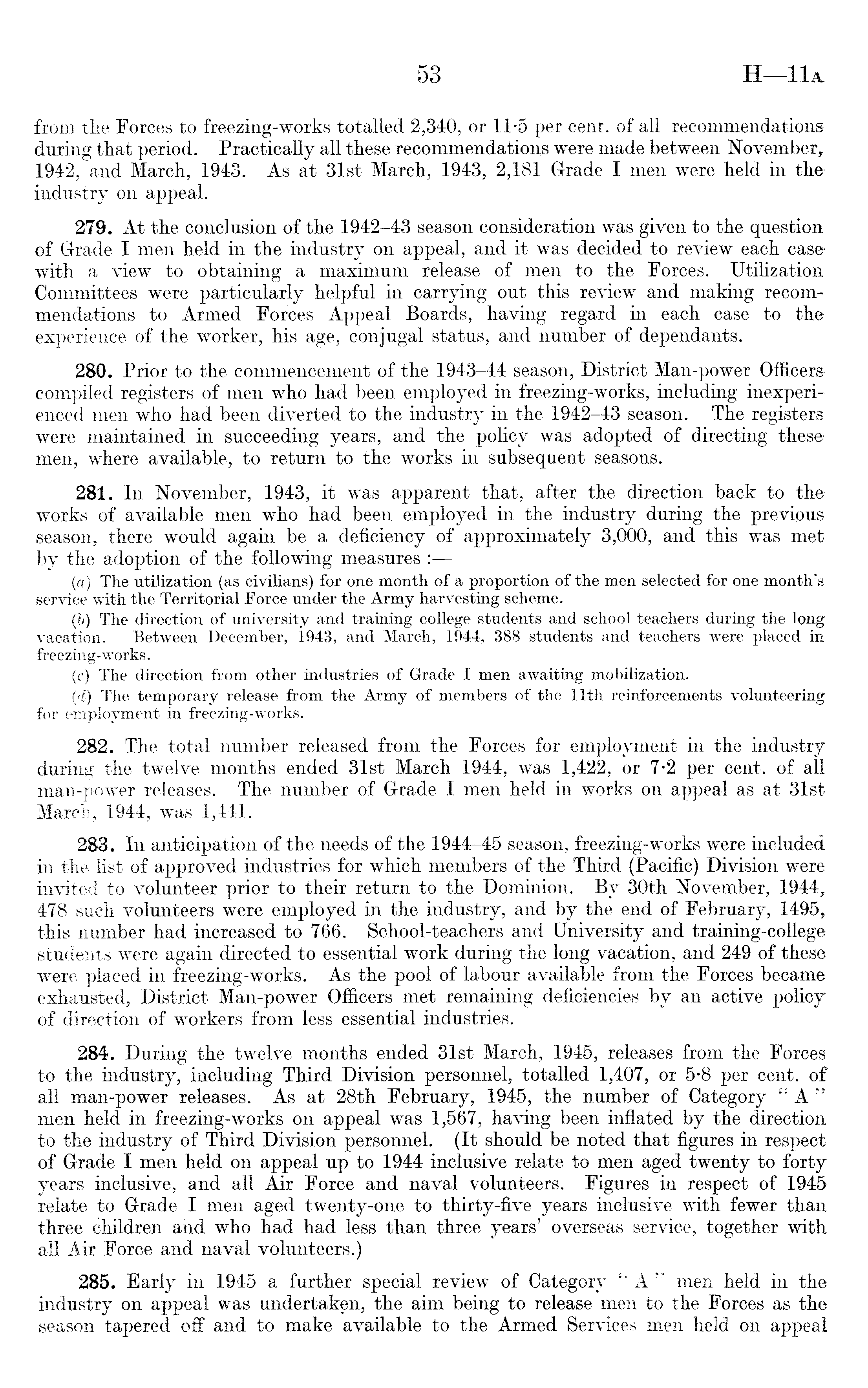 from the Forces to freezing-works totalled 2,340, or 11-5 per cent, of all recommendations during that period. Practically all these recommendations were made between November, 1942, and March, 1943. As at 31st March, 1943, 2,181 Grade I men were held in the industry on appeal. 279. At the conclusion of the 1942-43 season consideration was given to the question of Grade I men held in the industry on appeal, and it was decided to review each case with a view to obtaining a maximum release of men to the Forces. Utilization: Committees were particularly helpful in carrying out this review and making recommendations to Armed Forces Appeal Boards, having regard in each case to the experience of the worker, his age, conjugal status, and number of dependants. 280. Prior to the commencement of the 1943-44 season, District Man-power Officers compiled registers of men who had been employed in freezing-works, including inexperienced men who had been diverted to the industry in the 1942-43 season. The registers were maintained in succeeding years, and the policy was adopted of directing these men, where available, to return to the works in subsequent seasons. 281. In November, 1943, it was apparent that, after the direction back to the works of available men who had been employed in the industry during the previous season, there would again be a deficiency of approximately 3,000, and this was met by the adoption of the following measures : (a) The utilization (as civilians) for one month of a proportion of the men selected for one month's service with the Territorial Force under the Army harvesting scheme. (b) The "direction of university and training college students and school teachers during the long vacation. Between December, 1943, and March, 1944, 388 students and teachers were placed in freezing-works. (c) The direction from other industries of Grade I men awaiting mobilization. (d) The temporary release from the Army of members of the 11th reinforcements volunteering for employment in freezing-works. 282. The total number released from the Forces for employment in the industry during the twelve months ended 31st March 1944, was 1,422, or 7-2 per cent, of all man-power releases. The number of Grade I men held in works on appeal as at 31st March, 1944, was 1,441. 283. In anticipation of the needs of the 1944-45 season, freezing-works were included in the list of approved industries for which members of the Third (Pacific) Division were invited to volunteer prior to their return to the Dominion. By 30th November, 1944, 478 such volunteers were employed in the industry, and by the end of February, 1495, this number had increased to 766. School-teachers and University and training-college students were again directed to essential work during the long vacation, and 249 of these were placed in freezing-works. As the pool of labour available from the Forces became exhausted, District Man-power Officers met remaining deficiencies by an active policy of direction of workers from less essential industries. 284. During the twelve months ended 31st March, 1945, releases from the Forces to the industry, including Third Division personnel, totalled 1,407, or s*B per cent, of all man-power releases. As at 28th February, 1945, the number of Category "A " men held in freezing-works on appeal was 1,567, having been inflated by the direction to the industry of Third Division personnel. (It should be noted that figures in respect of Grade I men held on appeal up to 1944 inclusive relate to men aged twenty to forty years inclusive, and all Air Force and naval volunteers. Figures in respect of 1945 relate to Grade I men aged twenty-one to thirty-five years inclusive with fewer than three children aiid who had had less than three years' overseas service, together with all Air Force and naval volunteers.) 285. Early in 1945 a further special review of Category £; A " men held in the industry on appeal was undertaken, the aim being to release men to the Forces as the season tapered off and to make available to the Armed Services men held on appeal