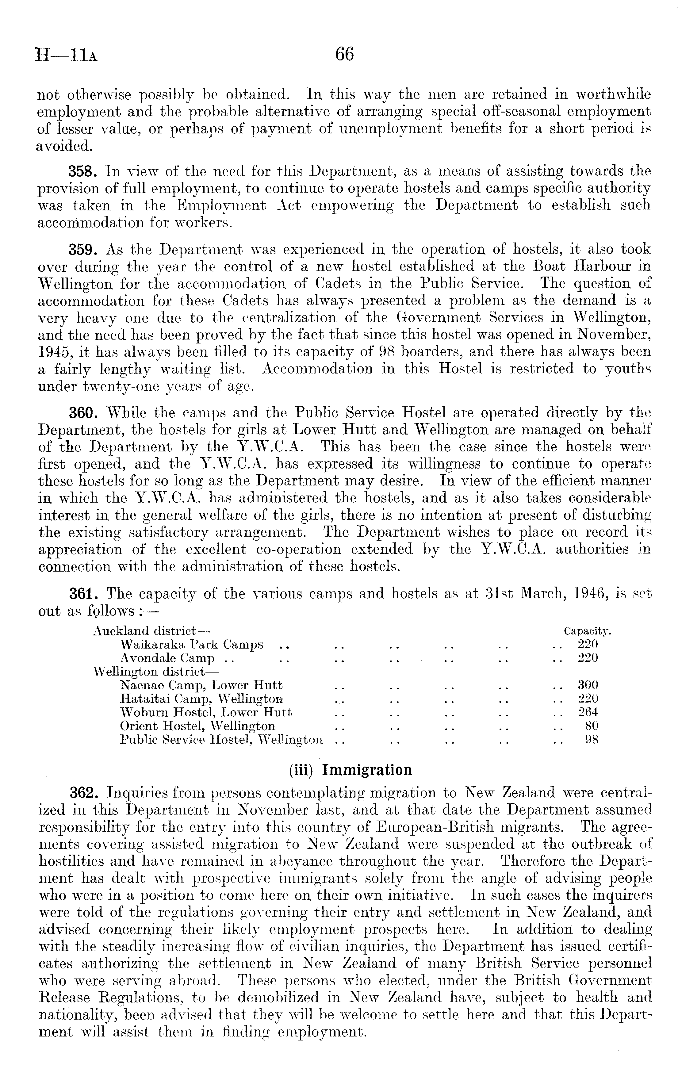 not otherwise possibly be obtained. In this way the men are retained in worthwhile employment and the probable alternative of arranging special off-seasonal employment of lesser value, or perhaps of payment of unemployment benefits for a short period is avoided. 358. In view of the need for this Department, as a means of assisting towards the provision of full employment, to continue to operate hostels and camps specific authority was taken in the Employment Act empowering the Department to establish such accommodation for workers. 359. As the Department was experienced in the operation of hostels, it also took over during the year the control of a new hostel established at the Boat Harbour in Wellington for the accommodation of Cadets in the Public Service. The question of accommodation for these Cadets has always presented a problem as the demand is a very heavy one due to the centralization of the Government Services in Wellington, and the need has been proved by the fact that since this hostel was opened in November, 1945, it has always been filled to its capacity of 98 boarders, and there has always been a fairly lengthy waiting list. Accommodation in this Hostel is restricted to youths under twenty-one years of age. 360. While the camps and the Public Service Hostel are operated directly by the Department, the hostels for girls at Lower Hutt and Wellington are managed on behalf of the Department by the Y.W.C.A. This has been the case since the hostels were first opened, and the Y.W.C.A. has expressed its willingness to continue to operate these hostels for so long as the Department may desire. In view of the efficient manner in which the Y.W.C.A. has administered the hostels, and as it also takes considerable interest in the general welfare of the girls, there is no intention at present of disturbing the existing satisfactory arrangement. The Department wishes to place on record its appreciation of the excellent co-operation extended by the Y.W.C.A. authorities in connection with the administration of these hostels. 361. The capacity of the various camps and hostels as at 31st March, 1946, is set out as fallows : Auckland district — Capacity. Waikaraka Park Camps .. .. .. .. .. .. 220 Avondale Camp .. .. .. .... .. .. 220 Wellington district— Naenae Camp, Lower Hutt .. .. .. .. .. 300 Hataitai Camp, Wellington ... .. .. .. .. 220 Woburn Hostel, Lower Hutt .. .. .. .. .. 264 Orient Hostel, Wellington .. .. .. .. .. 80 Public Service Hostel, Wellington .. .. .. .. .98 (iii) Immigration 362. Inquiries from persons contemplating migration to New Zealand were centralized in this Department in November last, and at that date the Department assumed responsibility for the entry into this country of European-British migrants. The agreements covering assisted migration to New Zealand were suspended at the outbreak of hostilities and have remained in abeyance throughout the year. Therefore the Department has dealt with prospective immigrants solely from the angle of advising people who were in a position to come here on their own initiative. In such cases the inquirers were told of the regulations governing their entry and settlement in New Zealand, and advised concerning their likely employment prospects here. In addition to dealing with the steadily increasing flow of civilian inquiries, the Department has issued certificates authorizing the settlement in New Zealand of many British Service personnel who were serving abroad. These persons who elected, under the British Government Release Regulations, to be demobilized in New Zealand have, subject to health and nationality, been advised that they will be welcome to settle here and that this Department will assist them in finding employment.