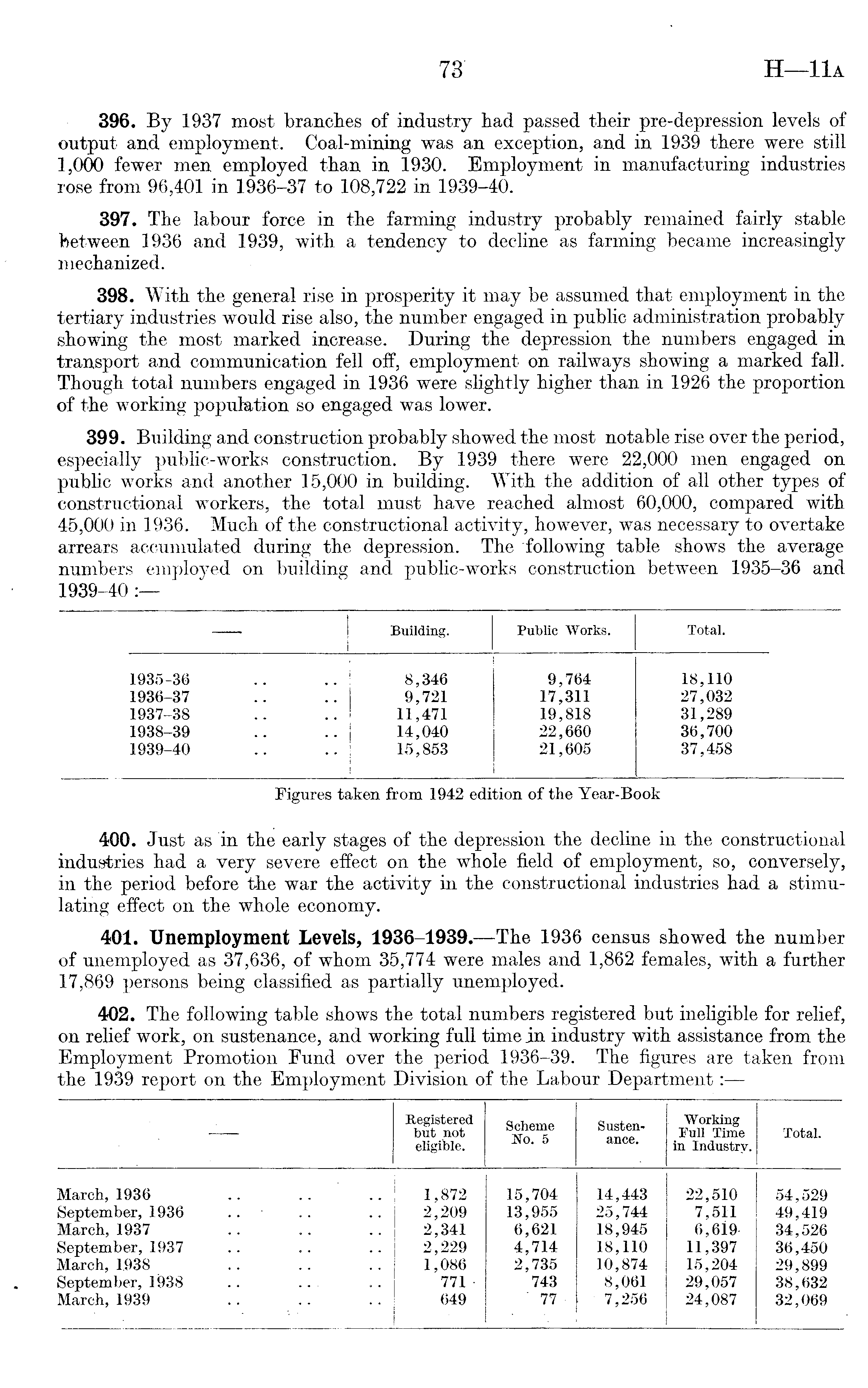 396. By 1937 most branches of industry had passed their pre-depression levels of output and employment. Coal-mining was an exception, and in 1939 there were still 1,000 fewer men employed than in 1930. Employment in manufacturing industries rose from 96,401 in 1936-37 to 108,722 in 1939-40. 397. The labour force in the farming industry probably remained fairly stable between 1936 and 1939, with a tendency to decline as farming became increasingly mechanized. 398. With the general rise in prosperity it may be assumed that employment in the tertiary industries would rise also, the number engaged in public administration probably showing the most marked increase. During the depression the numbers engaged in transport and communication fell off, employment on railways showing a marked fall. Though total numbers engaged in 1936 were slightly higher than in 1926 the proportion of the working population so engaged was lower. 399. Building and construction probably showed the most notable rise over the period, especially public-works construction. By 1939 there were 22,000 men engaged on public works and another 15,000 in building. With the addition of all other types of constructional workers, the total must have reached almost 60,000, compared with 45,000 in 1936. Much of the constructional activity, however, was necessary to overtake arrears accumulated during the depression. The following table shows the average numbers employed on building and public-works construction between 1935-36 and 1939-40