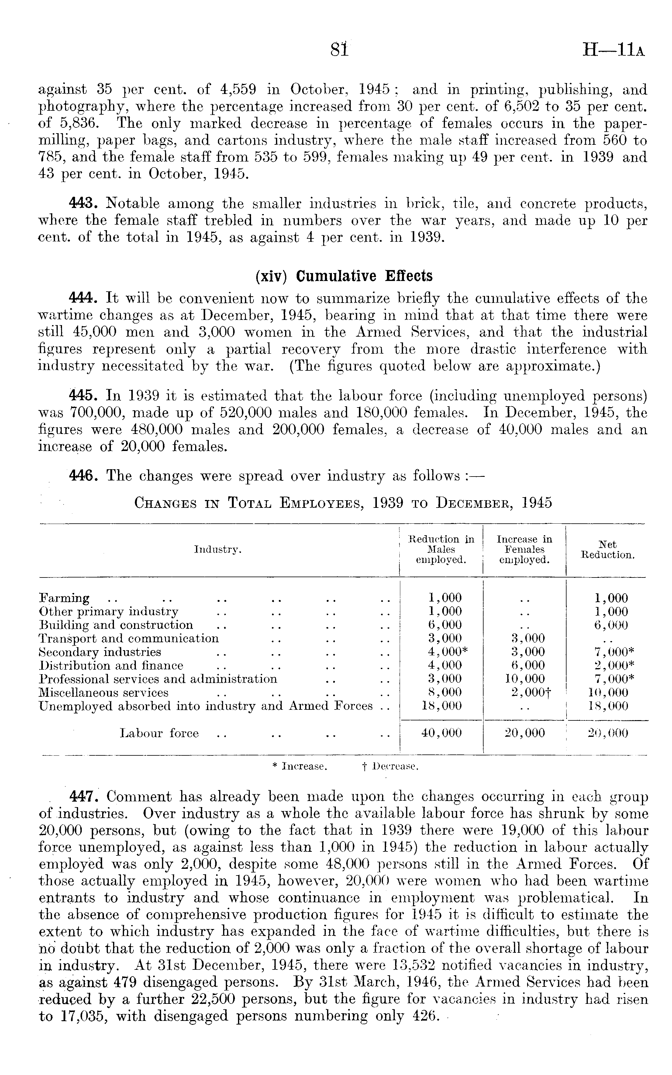 against 35 per cent, of 4,559 in October, 1945 ; and in printing, publishing, and photography, where the percentage increased from 30 per cent, of 6,502 to 35 per cent, of 5,836. The only marked decrease in percentage of females occurs in the papermilling, paper bags, and cartons industry, where the male staff increased from 560 to 785, and the female staff from 535 to 599, females making up 49 per cent, in 1939 and 43 per cent, in October, 1945. 443. Notable among the smaller industries in brick, tile, and concrete products, where the female staff trebled in numbers over the war years, and made up 10 per cent, of the total in 1945, as against 4 per cent, in 1939. (xiv) Cumulative Effects 444. It will be convenient now to summarize briefly the cumulative effects of the wartime changes as at December, 1945, bearing in mind that at that time there were still 45,000 men and 3,000 women in the Armed Services, and that the industrial figures represent only a partial recovery from the more drastic interference with industry necessitated by the war. (The figures quoted below are approximate.) 445. In 1939 it is estimated that the labour force (including unemployed persons) was 700,000, made up of 520,000 males and 180,000 females. In December, 1945, the figures were 480,000 males and 200,000 females, a decrease of 40,000 males and an increase of 20,000 females. 446. The changes were spread over industry as follows :