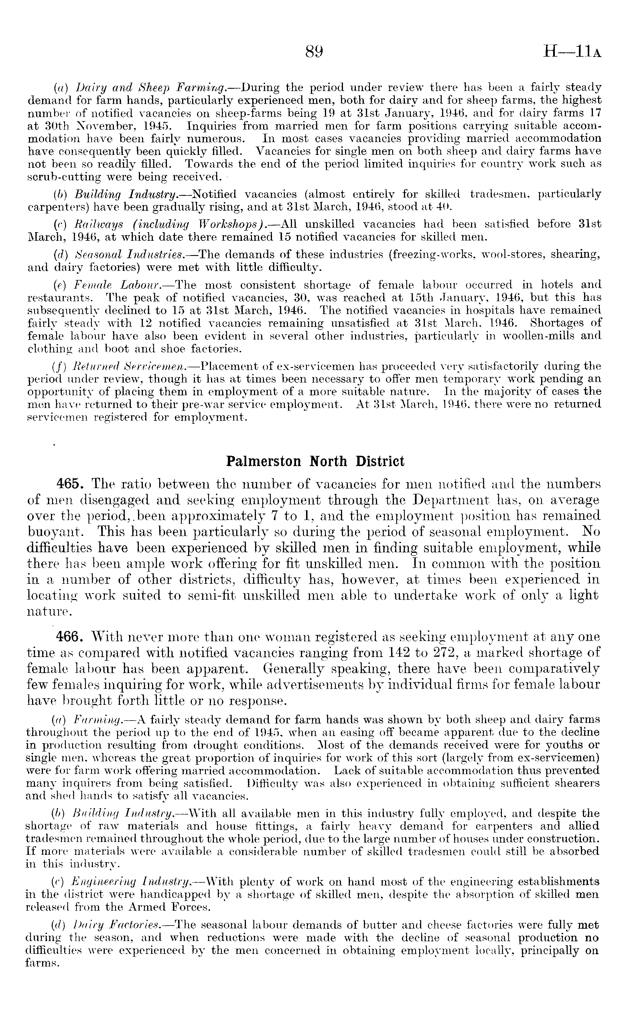 (a) Dairy and Sheep Farming.—During the period under review there has been a fairly steady demand for farm hands, particularly experienced men, both for dairy and for sheep, farms, the highest number of notified vacancies on sheep-farms being 19 at 31st January, 1946, and for dairy farms 17 at 30th November, 1945. Inquiries from married men for farm positions carrying suitable accommodation have been fairly numerous. In most cases vacancies providing married accommodation have consequently been quickly filled. Vacancies for single men on both sheep and dairy farms have not been so readily filled. Towards the end of the period limited inquiries for country work such as scrub-cutting were being received. (b) Building Industry.—Notified vacancies (almost entirely for skilled tradesmen, particularly carpenters) have been gradually rising, and at 31st March, 1946, stood at 40. (c) Railways (including Workshops).—All unskilled vacancies had been satisfied before 31st March, 1946, at which date there remained 15 notified vacancies for skilled men. (d) Seasonal Industries. —The demands of these industries (freezing-works, wool-stores, shearing, and dairy faetc>ries) were met with little difficulty. (e) Female Labour. —The most consistent shortage of female labour occurred in hotels and restaurants. The peak of notified vacancies, 30, was reached at 15th January, 1946, but this has subsequently declined to 15 at 31st March, 1946. The notified vacancies in hospitals have remained fairly steady with 12 notified vacancies remaining unsatisfied at 31st March, 1946. Shortages of female labour have also been evident in several other industries, particularly in woollen-mills and clothing and boot and shoe factories. (/) Returned Servicemen. —-Placement of ex-servicemen has proceeded very satisfactorily during the period under review, though it has at times been necessary to offer men temporary work pending an opportunity of placing them in employment of a more suitable nature. In the majority of cases the men have returned to their pre-war service employment. At 31st March, 1946, there were no returned servicemen registered for employment. Palmerston North District 465. The ratio between the number of vacancies for men notified and the numbers of men disengaged and seeking employment through the Department has, on average over the period,.been approximately 7 to 1, and the employment position has remained buoyant. This has been particularly so during the period of seasonal employment. No difficulties have been experienced by skilled men in finding suitable employment, while there has been ample work offering for fit unskilled men. In common with the position in a number of other districts, difficulty has, however, at times been experienced in locating work suited to semi-fit unskilled men able to undertake work of only a light nature. 466. With never more than one woman registered as seeking employment at any one time as compared with notified vacancies ranging from 142 to 272, a marked shortage of female labour has been apparent. Generally speaking, there have been comparatively few females inquiring for work, while advertisements by individual firms for female labour have brought forth little or no response. (a) Farming.—A fairly steady demand for farm hands was shown by both sheep and dairy farms throughout the period up to the end of 1945, when an easing off became apparent due to the decline in production resulting from drought conditions. Most of the demands received were for youths or single men, whereas the great proportion of inquiries for work of this sort (largely from ex-servicemen) were for farm work offering married accommodation. Lack of suitable accommodation thus prevented many inquirers from being satisfied. Difficulty was also experienced in obtaining sufficient shearers and shed hands to satisfy all vacancies. (b) Building Industry.—With all available men in this industry fully employed, and despite the shortage of raw materials and house fittings, a fairly heavy demand for carpenters and allied tradesmen remained throughout the whole period, due to the large number of houses under construction. If more matexials were available a considerable number of skilled tradesmen could still be absorbed in this industry. (c) Engineering Industry.—With plenty of work on hand most of the engineering establishments in the district were handicapped by a shortage of skilled men, despite the absorption of skilled men released from the Armed Forces. (d) Dairy Factories. —The seasonal labour demands of butter and cheese factories were fully met during the season, and when reductions were made with the decline of seasonal production no difficulties were experienced by the men concerned in obtaining employment locally, principally on farms.