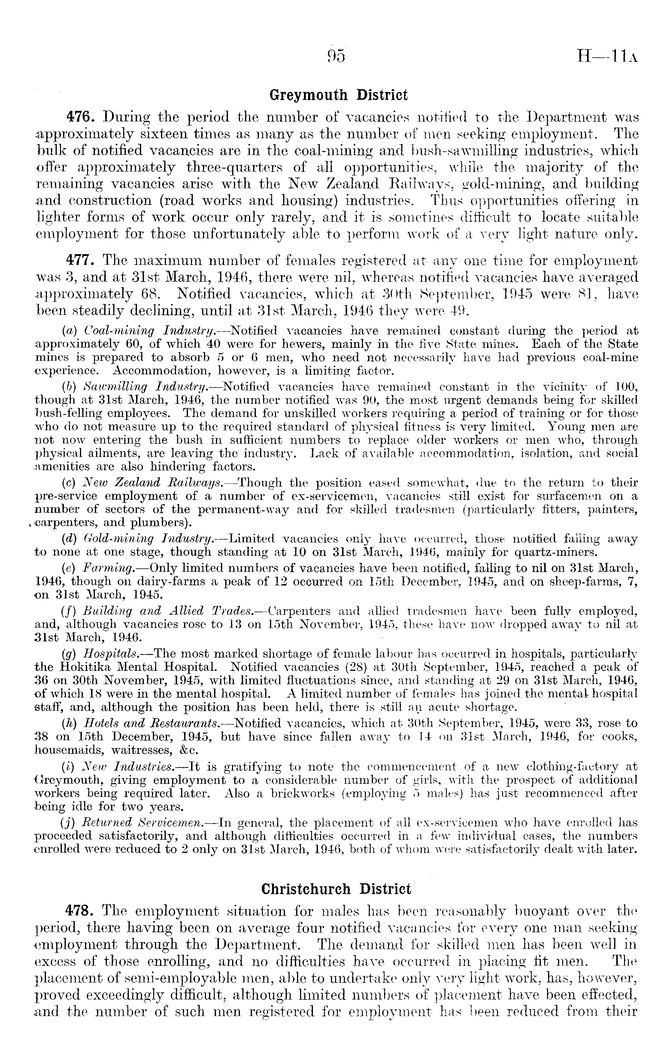 Greymouth District 476. During the period the number of vacancies notified to the Department was approximately sixteen times as many as the number of men seeking employment. The bulk of notified vacancies are in the coal-mining and bush-sawmilling industries, which offer approximately three-quarters of all opportunities, while the majority of the remaining vacancies arise with the New Zealand Railways, gold-mining, and building and construction (road works and housing) industries. Thus opportunities offering in lighter forms of work occur only rarely, and it is sometines difficult to locate suitable employment for those unfortunately able to perform work of a very light nature only. 477. The maximum number of females registered at any one time for employment was 3, and at 31st March, 1946, there were nil, whereas notified vacancies have averaged approximately 68. Notified vacancies, which at 30th September, 1945 were 81, have been steadily declining, until at 31st March, 1946 they were 49. (a) Coal-mining Industry.—Notified vacancies have remained constant during the period at approximately 60, of which 40 were for hewers, mainly in the five State mines. Each of the State mines is prepared to absorb 5 or 6 men, who need not necessarily have had previous coal-mine ■experience. Accommodation, however, is a limiting factor. (b) Sawmilling Industry.—Notified vacancies have remained constant in the vicinity of 100, though at 31st March, 1946, the number notified was 90, the most urgent demands being for skilled bush-felling employees. The demand for unskilled workers requiring a period of training or for those who do not measure up to the required standard of physical fitness is very limited. Young men are not now entering the bush in sufficient numbers to replace older workers or men who, through physical ailments, are leaving the industry. Lack of available accommodation, isolation, and social amenities are also hindering factors. (c) New Zealand Railways.—Though the position eased somewhat, due to the return to their pre-service employment of a number of ex-servicemen, vacancies still exist for surfacemen on a number of sectors of the permanent-way and for skilled tradesmen (particularly fitters, painters, ■carpenters, and plumbers). (d) Gold-mining Industry.—Limited vacancies only have occurred, those notified failing away to none at one stage, though standing at 10 on 31st March, 1946, mainly for quartz-miners. (e) Farming.—Only limited numbers of vacancies have been notified, falling to nil on 31st March, 1946, though on dairy-farms a peak of 12 occurred on loth December, 1945, and on sheep-farms, 7, on 31st March, 1945. (/) Building and Allied Trades.—Carpenters and allied tradesmen have been fully employed, and, although vacancies rose to 13 on 15th November, 1945, these have now dropped away to nil at 31st March, 1946. (g) Hospitals.—The most marked shortage of- female labour has occurred in hospitals, particularly the Hokitika Mental Hospital. Notified vacancies (28) at 30th September, 1945, reached a peak of 36 on 30th November, 1945, with limited fluctuations since, and standing at 29 on 31st March, 1946, ■of which 18 were in the mental hospital. A limited number of females has joined the mental hospital staff, and, although the position has been held, there is still an acute shortage. (In) Hotels and Restaurants. —Notified vacancies, which at 30th September, 1945, were 33, rose to 38 on 15th December, 1945, but have since fallen away to 14 on 31st March, 1946, for cooks, housemaids, waitresses, &c. (i) New Industries.—lt is gratifying to note the commencement of a new clothing-factory at Greymouth, giving employment to a considerable number of girls, with the prospect of additional workers being required later. Also a brickworks (employing 5 males) has just recommenced after being idle for two years. (j) Returned Servicemen.—ln general, the placement of all ex-servicemen who have enrolled has proceeded satisfactorily, and although difficulties occurred in a few individual cases, the numbers enrolled were reduced to 2 only on 31st March, 1946, both of whom were satisfactorily dealt with later. Christehureh District 478. The employment situation for males has been reasonably buoyant over the period, there having been on average four notified vacancies for every one man seeking employment through the Department. The demand for skilled men has been well in excess of those enrolling, and no difficulties have occurred in placing fit men. The placement of semi-employable men, able to undertake only very light work, has, however, proved exceedingly difficult, although limited numbers of placement have been effected, and the number of such men registered for employment has been reduced from their
