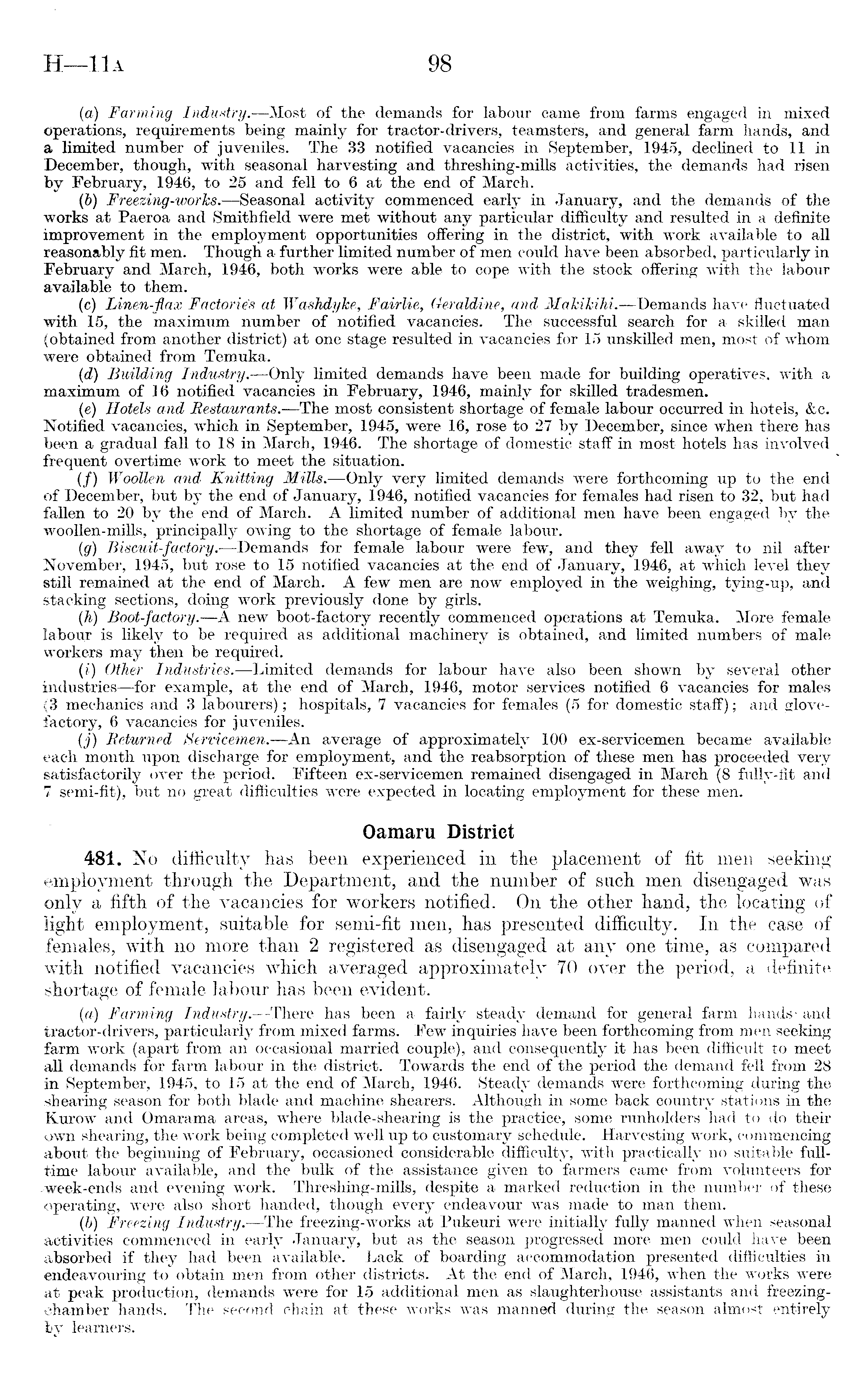 (а) Farming Industry.—Most of the demands for labour came from farms engaged in mixed operations, requirements being mainly for tractor-drivers, teamsters, and general farm hands, and a limited number of juveniles. The 33 notified vacancies in September, 1945, declined to 11 in December, though, with seasonal harvesting and threshing-mills activities, the demands had risen by February, 1946, to 25 and fell to 6 at the end of March. (б) Freezing-works.—Seasonal activity commenced early in January, and the demands of the works at Paeroa and Smithfield were met without any particular difficulty and resulted in a definite improvement in the employment opportunities offering in the district, with work available to all reasonably fit men. Though a further limited number of men could have been absorbed, particularly in February and March, 1946, both works were able to cope with the stock offering with the labour available to them. (c) Linen-flax Factories at Washdyke, Fairlie, Geraldine, and Makikihi.—Demands have fluctuated with 15, the maximum number of notified vacancies. The successful search for a skilled man (obtained from another district) at one stage resulted in vacancies for 15 unskilled men, most of whom were obtained from Temuka. (d) Building Industry.—Only limited demands have been made for building operatives, with a maximum of 16 notified vacancies in February, 1946, mainly for skilled tradesmen. (e) Hotels and Restaurants.—The most consistent shortage of female labour occurred in hotels, &c. Notified vacancies, which in September, 1945, were 16, rose to 27 by December, since when there has been a gradual fall to 18 in March, 1946. The shortage of domestic staff in most hotels has involved frequent overtime work to meet the situation. (/) Woollen and Knitting Mills. —Only very limited demands were forthcoming up to the end of December, but by the end of January, 1946, notified vacancies for females had risen to 32, but had fallen to 20 by the end of March. A limited number of additional men have been engaged by the woollen-mills, principally owing to the shortage of female labour. (g) Biscuit-factory.—Demands for female labour were few, and they fell away to nil after November, 1945, but rose to 15 notified vacancies at the end of January, 1946, at which level they still remained at the end of March. A few men are now employed in the weighing, tying-up, and stacking sections, doing work previously done by girls. (h) Boot-factory.—A new boot-factory recently commenced operations at Temuka. More female labour is likely to be required as additional machinery is obtained, and limited numbers of male workers may then be required. (i) Other Industries. —Limited demands for labour have also been shown by several other industries—for example, at the end of March, 1946, motor services notified 6 vacancies for males (3 mechanics and 3 labourers); hospitals, 7 vacancies for females (5 for domestic staff); and glovefactory, 6 vacancies for juveniles. (j) Returned Servicemen. —An average of approximately 100 ex-servicemen became available each month upon discharge for employment, and the reabsorption of these men has proceeded very satisfactorily over the period. Fifteen ex-servicemen remained disengaged in March (8 fully-fit and 7 semi-fit), but no great difficulties were expected in locating employment for these men. Oamaru District 481. No difficulty lias been experienced in the placement of fit men seeking employment through the Department, and the number of such men disengaged was only a fifth of the vacancies for workers notified. On the other hand, the locating of light employment, suitable for semi-fit men, has presented difficulty. In the case of females, with no more than 2 registered as disengaged at any one time, as compared with notified vacancies which averaged approximately 70 over the period, a definite shortage of female labour has been evident. (a) Farming Industry.—There has been a fairly steady demand for general farm hands- and tractor-drivers, particularly from mixed farms. Few inquiries have been forthcoming from men seeking farm work (apart from an occasional married couple), and consequently it has been difficult to meet all demands for farm labour in the district. Towards the end of the period the demand fell from 28 in September, 1945, to 15 at the end of March, 1946. Steady demands were forthcoming during the shearing season for both blade and machine shearers. Although in some back country stations in the Kurow and Omarama areas, where blade-shearing is the practice, some runholders had to do their own shearing, the work being completed well up to customary schedule. Harvesting work, commencing about the beginning of February, occasioned considerable difficulty, with practically no suitable fulltime labour available, and the bulk of the assistance given to farmers came from volunteers for -week-ends and evening work. Threshing-mills, despite a marked reduction in the number of these operating, were also short handed, though every endeavour was made to man them. (b) Freezing Industry.—The freezing-works at Pukeuri were initially fully manned when seasonal activities commenced in early January, but as the season progressed more men could have been absorbed if they had been available. Lack of boarding accommodation presented difficulties in endeavouring to obtain men from other districts. At the end of March, 1946, when the works were at peak production, demands were for 15 additional men as slaughterhouse assistants and freezingchamber hands. The second chain at these works was manned during the season almost entirely by learners.