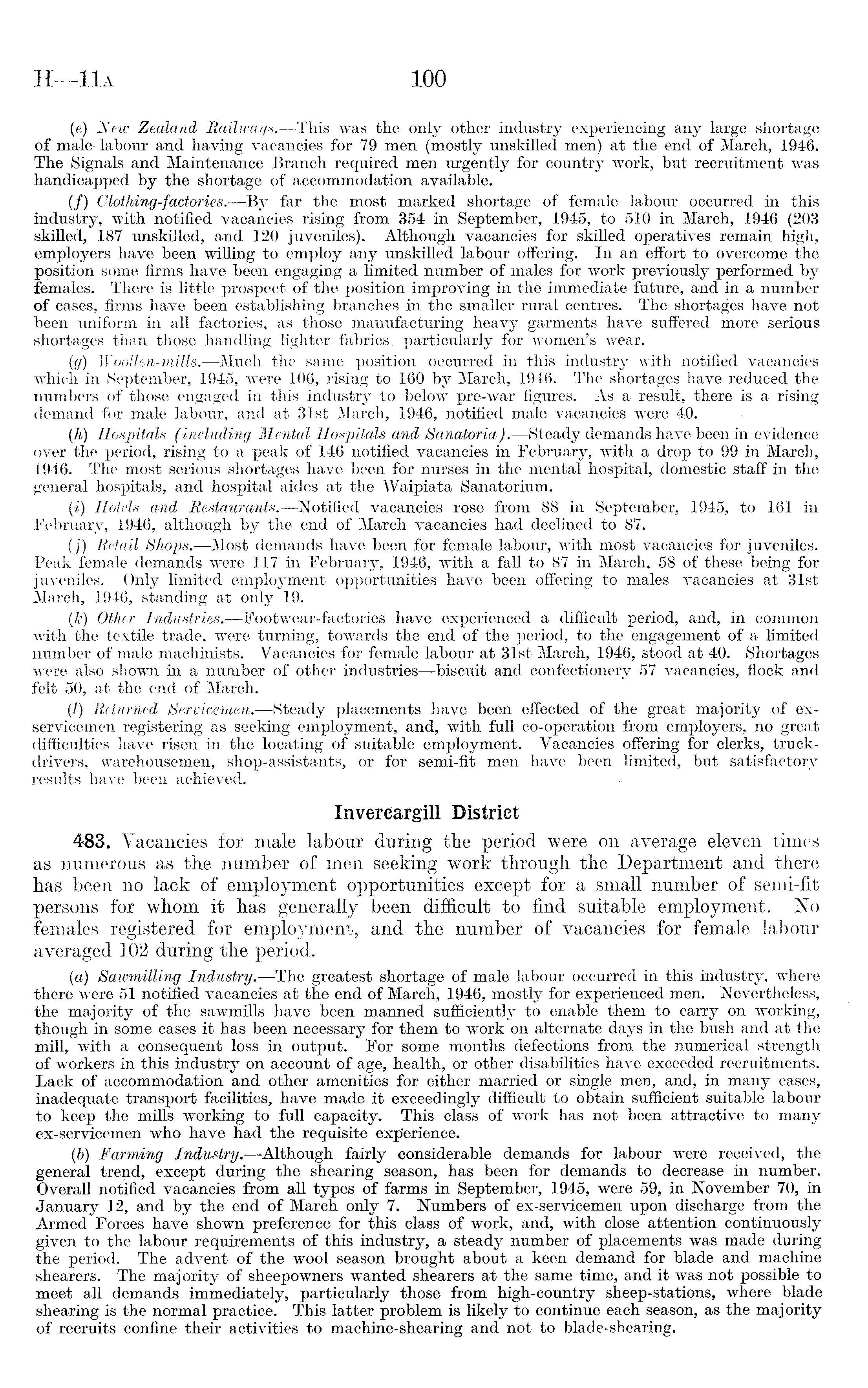 (e) New Zealand Railways.—This was the only other industry experiencing any large shortage of male-labour and having vacancies for 79 men (mostly unskilled men) at the end of March, 1946. The Signals and Maintenance Branch required men urgently for country work, but recruitment was handicapped by the shortage of accommodation available. (/) Clothing-factories.—By far the most marked shortage of female labour occurred in this industry, with notified vacancies rising from 354 in September, 1945, to 510 in March, 1946 (203 skilled, 187 unskilled, and 120 juveniles). Although vacancies for skilled operatives remain high, employers have been willing to employ any unskilled labour offering. In an effort to overcome the position some firms have been engaging a limited number of males for work previously performed by females. There is little prospect of the position improving in the immediate future, and in a number of cases, firms have been establishing branches in the smaller rural centres. The shortages have not been uniform in all factories, as those manufacturing heavy garments have suffered more serious shortages than those handling lighter fabrics, particularly for women's wear. (g) Woollen-mills. —Much the same position occurred in this industry with notified vacancies which in September, 1945, were 106, rising to 160 by March, 1946. The shortages have reduced the numbers of those engaged in this industry to below pre-war figures. As a result, there is a rising demand for male labour, and at 31st March, 1946, notified male vacancies were 40. (h) Hospitals (including Mental Hospitals and Sanatoria). —Steady demands have been in evidence over the period, rising to a peak of 146 notified vacancies in February, with a drop to 99 in March, 1946. The most serious shortages have been for nurses in the mental hospital, domestic staff in the general hospitals, and hospital aides at the Waipiata Sanatorium. (i) Hotels and Restaurants.—Notified vacancies rose from 88 in September, 1945, to 161 in February, 1946, although by the end of March vacancies had declined to 87. (j) Retail Shops.—Most demands have been for female labour, with most vacancies for juveniles. Peak female demands were 117 in February, 1946, with a fall to 87 in March, 58 of these being for juveniles. Only limited employment opportunities have been offering to males vacancies at 31st March, 1946, standing at only 19. (1c) Other Industries. —Footwear-factories have experienced a difficult period, and, in common with the textile trade, were turning, towards the end of the period, to the engagement of a limited number of male machinists. Vacancies for female labour at 31st March, 1946, stood at 40. Shortages were also shown in a number of other industries —biscuit and confectionery 57 vacancies, flock and felt 50, at the end of March. (I) Returned Servicemen. —Steady placements have been effected of the great majority of exservicemen registering as seeking employment, and, with full co-operation from employers, no great difficulties have risen in the locating of suitable employment. Vacancies offering for clerks, truckdrivers, warehousemen, shop-assistants, or for semi-fit men have been limited, but satisfactory results have been achieved. Invercargill District 483. Vacancies for male labour during the period were on average eleven times as numerous as the number of men seeking work through the Department and there has been no lack of employment opportunities except for a small number of semi-fit persons for whom it has generally been difficult to find suitable employment. No females registered for employment., and the number of vacancies for female labour averaged 102 during the period. (a) Sawmilling Industry.—The greatest shortage of male labour occurred in this industry, where there were 51 notified vacancies at the end of March, 1946, mostly for experienced men. Nevertheless, the majority of the sawmills have been manned sufficiently to enable them to carry on working, though in some cases it has been necessary for them to work on alternate days in the bush and at the mill, with a consequent loss in output. For some months defections from the numerical strength of workers in this industry on account of age, health, or other disabilities have exceeded recruitments. Lack of accommodation and other amenities for either married or single men, and, in many cases, inadequate transport facilities, have made it exceedingly difficult to obtain sufficient suitable labour to keep the mills working to full capacity. This class of work has not been attractive to many ex-servicemen who have had the requisite experience. (b) Farming Industry.—Although fairly considerable demands for labour were received, the general trend, except during the shearing season, has been for demands to decrease in number. Overall notified vacancies from all types of farms in September, 1945, were 59, in November 70, in January 12, and by the end of March only 7. Numbers of ex-servicemen upon discharge from the Armed Forces have shown preference for this class of work, and, with close attention continuously given to the labour requirements of this industry, a steady number of placements was made during the period. The advent of the wool season brought about a keen demand for blade and machine shearers. The majority of sheepowners wanted shearers at the same time, and it was not possible to meet all demands immediately, particularly those from high-country sheep-stations, where blade shearing is the normal practice. This latter problem is likely to continue each season, as the majority of recruits confine their activities to machine-shearing and not to blade-shearing.