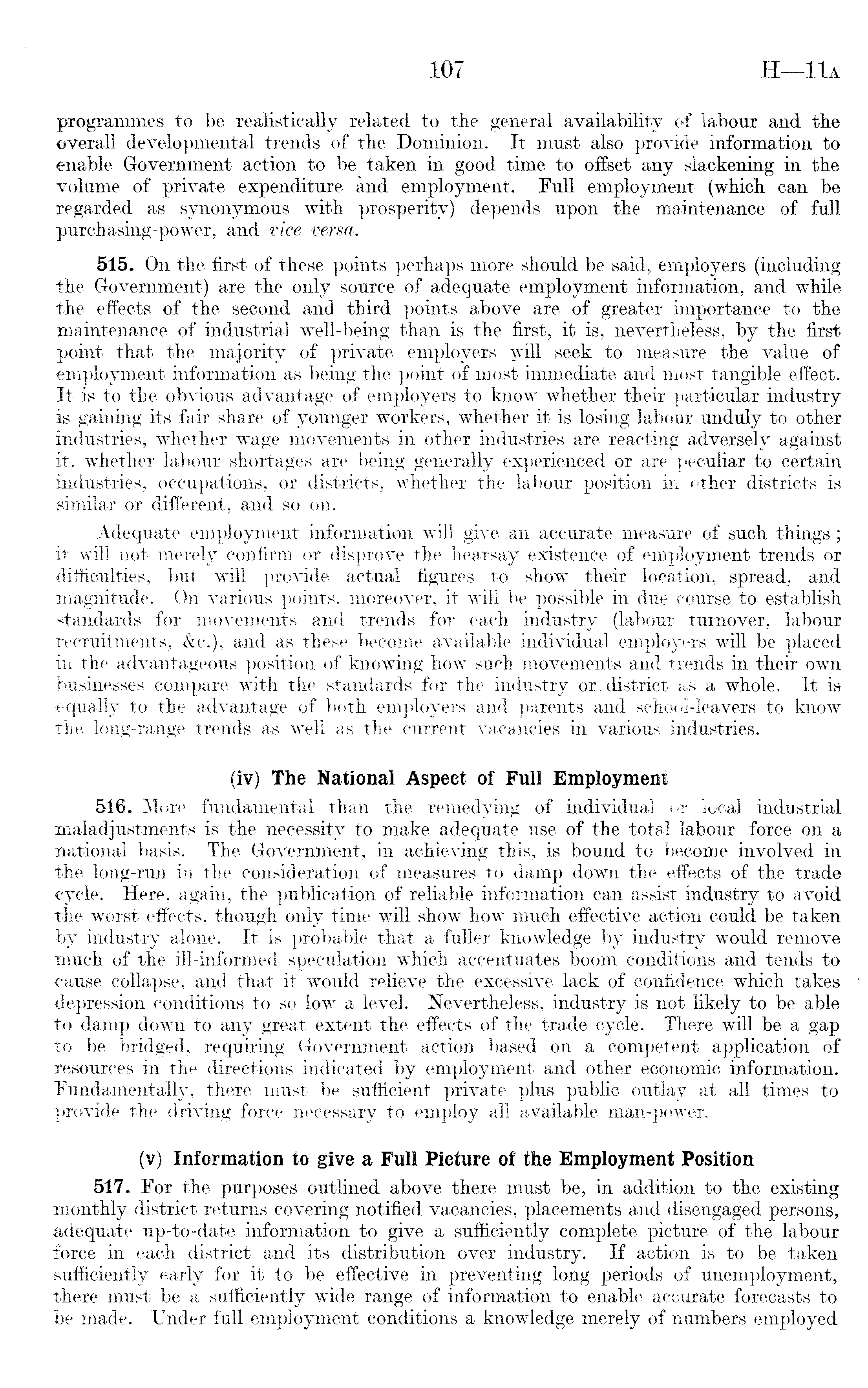 programmes to be realistically related to the general availability of labour and the overall developmental trends of the Dominion. It must also provide information to enable Government action to be taken in good time to offset any slackening in the volume of private expenditure and employment. Full employment (which can be regarded as synonymous with prosperity) depends upon the maintenance of full purchasing-power, and vice versa. 515. On the first of these points perhaps more should be said, employers (including the Government) are the only source of adequate employment information, and while the effects of the second and third points above are of greater importance to the maintenance of industrial well-being than is the first, it is, nevertheless, by the first point that the majority of private employers will seek to measure the value of employment information as being the point of most immediate and most tangible effect. It is to the obvious advantage of employers to know whether their particular industry is gaining its fair share of younger workers, whether it is losing labour unduly to other industries, whether wage movements in other industries are reacting adversely against it, whether labour shortages are being generally experienced or are peculiar to certain industries, occupations, or districts, whether the labour position in other districts is similar or different, and so on. Adequate employment information will give an accurate measure of such things; it will not merely confirm or disprove the hearsay existence of employment trends or difficulties, but will provide actual figures to show their location, spread, and magnitude. On various points, moreover, it will be possible in due course to establish standards for movements and trends for each industry (labour turnover, labour recruitments, &c.), and as these become available individual employers will be placed in the advantageous position of knowing how such movements and trends in their own businesses compare with the standards for the" industry or . district as a whole. It is equally to the advantage of both employers and parents and school-leavers to know the long-range trends as well as the current vacancies in various industries. (iv) The National Aspect of Full Employment 516. More fundamental than the remedying of individual or local industrial maladjustments is the necessity to make adequate use of the total labour force on a national basis. The Government, in achieving this, is bound to become involved in the long-run in the consideration of measures to damp down the effects of the trade cycle. Here, again, the publication of reliable information can assist industry to avoid the worst effects, though only time will show how much effective action could be taken by industry alone. It is probable that a fuller knowledge by industry would remove much of the ill-informed speculation which accentuates boom conditions and tends to cause collapse, and that it would relieve the excessive lack of confidence which takes depression conditions to so low a level. Nevertheless, industry is not likely to be able to damp down to any great extent the effects of the trade cycle. There will be a gap to be bridged, requiring Government action based on a competent application of resources in the directions indicated by employment and other economic information. Fundamentally, there must be sufficient private plus public outlay at all times to provide the driving force necessary to employ all available man-power. (v) Information to give a Full Picture of the Employment Position 517. For the purposes outlined above there must be, in addition to the existing monthly district returns covering notified vacancies, placements and disengaged persons, adequate up-to-date information to give a sufficiently complete picture of the labour force in each district and its distribution over industry. If action is to be taken sufficiently early for it to be effective in preventing long periods of unemployment, there must be a sufficiently wide range of information to enable accurate forecasts to be made. Under full employment conditions a knowledge merely of numbers employed