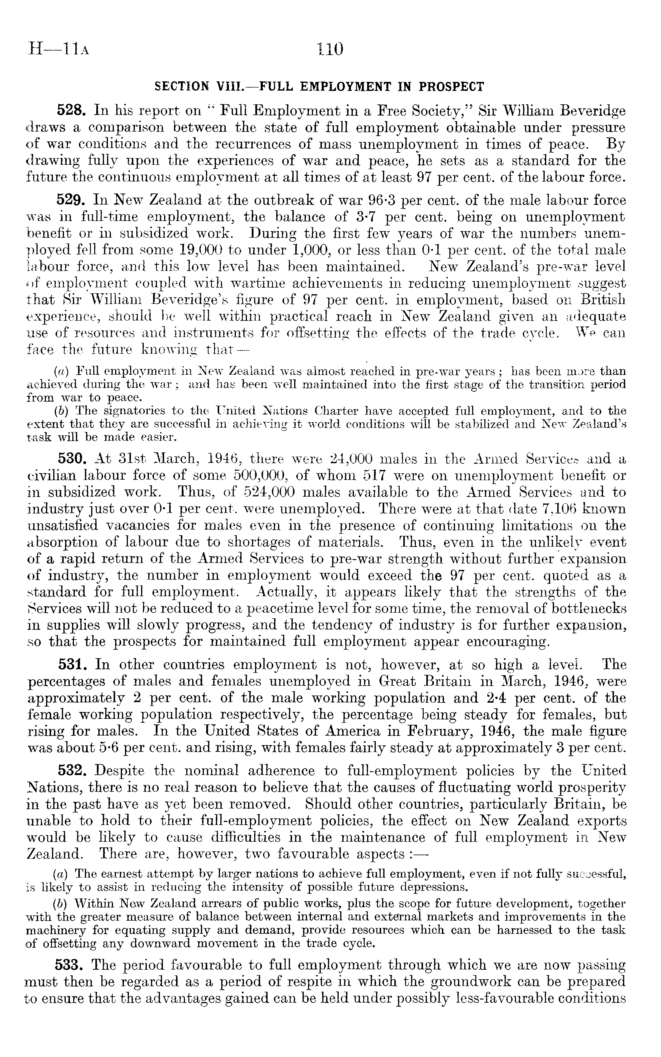 SECTION VIII.—FULL EMPLOYMENT IN PROSPECT 528. In his report on " Full Employment in a Free Society," Sir William Beveridge draws a comparison between the state of full employment obtainable under pressure of war conditions and the recurrences of mass unemployment in times of peace. By drawing fully upon the experiences of war and peace, he sets as a standard for the future the continuous employment at all times of at least 97 per cent, of the labour force. 529. In New Zealand at the outbreak of war 96-3 per cent, of the male labour force was in full-time employment, the balance of 3-7 per cent, being on unemployment benefit or in subsidized work. During the first few years of war the numbers unemployed fell from some 19,000 to under 1,000, or less than 0-1 per cent, of the total male labour force, and this low level has been maintained. New Zealand's pre-war level of employment coupled with wartime achievements in reducing unemployment suggest that Sir William Beveridge's figure of 97 per cent, in employment, based on British experience, should be well within practical reach in New Zealand given an adequate use of resources and instruments for offsetting the effects of the trade cycle. We can face the future knowing that—(a) Full employment in New Zealand was almost reached in pre-war years; has been more than achieved during the war; and has been well maintained into the first stage of the transition period from war to peace. (b) The signatories to the United Nations Charter have accepted full employment, and to the extent that they are successful in achieving it world conditions will be stabilized and New Zealand's task will be made easier. 530. At 31st March, 1946, there were 24,000 males in the Armed Services and a civilian labour force of some 500,000, of whom 517 were on unemployment benefit or in subsidized work. Thus, of 524,000 males available to the Armed Services and to industry just over o*l per cent, were unemployed. There were at that date 7,106 known unsatisfied vacancies for males even in the presence of continuing limitations on the absorption of labour due to shortages of materials. Thus, even in the unlikely event of a rapid return of the Armed Services to pre-war strength without further expansion of industry, the number in employment would exceed the 97 per cent, quoted as a standard for full employment. Actually, it appears likely that the strengths of the Services will not be reduced to a peacetime level for some time, the removal of bottlenecks in supplies will slowly progress, and the tendency of industry is for further expansion, so that the prospects for maintained full employment appear encouraging. 531. In other countries employment is not, however, at so high a level. The percentages of males and females unemployed in Great Britain in March, 1946, were approximately 2 per cent, of the male working population and 2*4 per cent, of the female working population respectively, the percentage being steady for females, but rising for males. In the United States of America in February, 1946, the male figure was about 5-6 per cent, and rising, with females fairly steady at approximately 3 per cent. 532. Despite the nominal adherence to full-employment policies by the United Nations, there is no real reason to believe that the causes of fluctuating world prosperity in the past have as yet been removed. Should other countries, particularly Britain, be unable to hold to their full-employment policies, the effect on New Zealand exports would be likely to cause difficulties in the maintenance of full employment in New Zealand. There are, however, two favourable aspects : —- (a) The earnest attempt by larger nations to achieve full employment, even if not fully successful, is likely to assist in reducing the intensity of possible future depressions. (b) Within Nejv Zealand arrears of public works, plus the scope for future development, together with the greater measure of balance between internal and external markets and improvements in the machinery for equating supply and demand, provide resources which can be harnessed to the task of offsetting any downward movement in the trade cycle. 533. The period favourable to full employment through which we are now passing must then be regarded as a period of respite in which the groundwork can be prepared to ensure that the advantages gained can be held under possibly less-favourable conditions