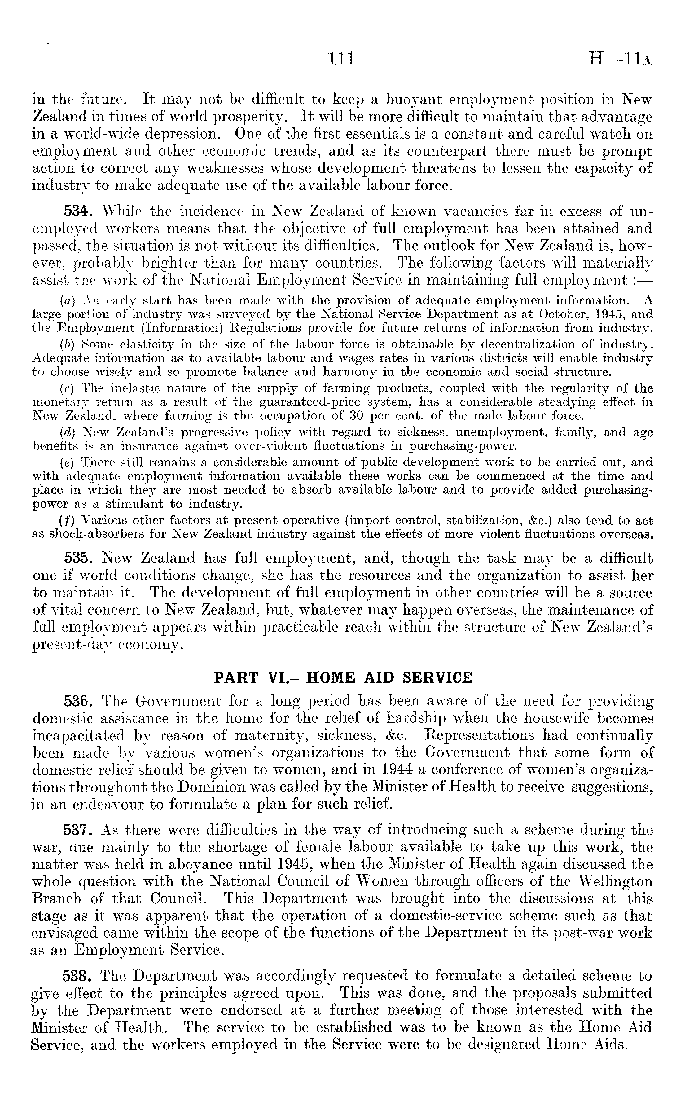 in the future. It may not be difficult to keep a buoyant employment position in New Zealand in times of world prosperity. It will be more difficult to maintain that advantage in a world-wide depression. One of the first essentials is a constant and careful watch on employment and other economic trends, and as its counterpart there must be prompt action to correct any weaknesses whose development threatens to lessen the capacity of industry to make adequate use of the available labour force. 534. While the incidence in New Zealand of known vacancies far in excess of unemployed workers means that the objective of full employment has been attained and passed, the-situation is not without its difficulties. The outlook for New Zealand is, however, probably brighter than for many countries. The following factors will materially Assist the work of the National Employment Service in maintaining full employment: — (а) An early start has been made with the provision of adequate employment information. A large portion of industry was surveyed by the National Service Department as at October, 1945, and the Employment (Information) Regulations provide for future returns of information from industry, (б) Some elasticity in the size of the labour force is obtainable by decentralization of industry. Adequate information as to available labour and wages rates in various districts will enable industry to choose wisely and so promote balance and harmony in the economic and social structure. (c) The inelastic nature of the supply of farming products, coupled with the regularity of the monetary return as a result of the guaranteed-price system, has a considerable steadying effect in New Zealand, where farming is the occupation of 30 per cent, of the male labour force. (d) New Zealand's progressive policy with regard to sickness, unemployment, family, and age benefits is an insurance against over-violent fluctuations in purchasing-power. (e) There still remains a considerable amount of public development work to be carried out, and with adequate employment information available these works can be commenced at the time and place in which they are most needed to absorb available labour and to provide added purchasingpower as a stimulant to industry. (/) Various other factors at present operative (import control, stabilization, &c.) also tend to act as shock-absorbers for New Zealand industry against the effects of more violent fluctuations overseas. 535. New Zealand has full employment, and, though the task may be a difficult one if world conditions change, she has the resources and the organization to assist her to maintain it. The development of full employment in other countries will be a source of vital concern to New Zealand, but, whatever may happen overseas, the maintenance of full employment appears within practicable reach within the structure of New Zealand's present-day economy. PART VI.—HOME AID SERVICE 536. The Government for a long period has been aware of the need for providing domestic assistance in the home for the relief of hardship when the housewife becomes incapacitated by reason of maternity, sickness, &c. Eepresentations had continually been made by various women's organizations to the Government that some form of domestic relief should be given to women, and in 1944 a conference of women's organizations throughout the Dominion was called by the Minister of Health to receive suggestions, in an endeavour to formulate a plan for such relief. 537. As there were difficulties in the way of introducing such a scheme during the war, due mainly to the shortage of female labour available to take up this work, the matter was held in abeyance until 1945, when the Minister of Health again discussed the whole question with the National Council of Women through officers of the Wellington Branch of that Council. This Department was brought into the discussions at this stage as it was apparent that the operation of a domestic-service scheme such as that envisaged came within the scope of the functions of the Department in its post-war work as an Employment Service. 538. The Department was accordingly requested to formulate a detailed scheme to give effect to the principles agreed upon. This was done, and the proposals submitted by the Department were endorsed at a further meeting of those interested with the Minister of Health. The service to be established was to be known as the Home Aid Service, and the workers employed in the Service were to be designated Home Aids.