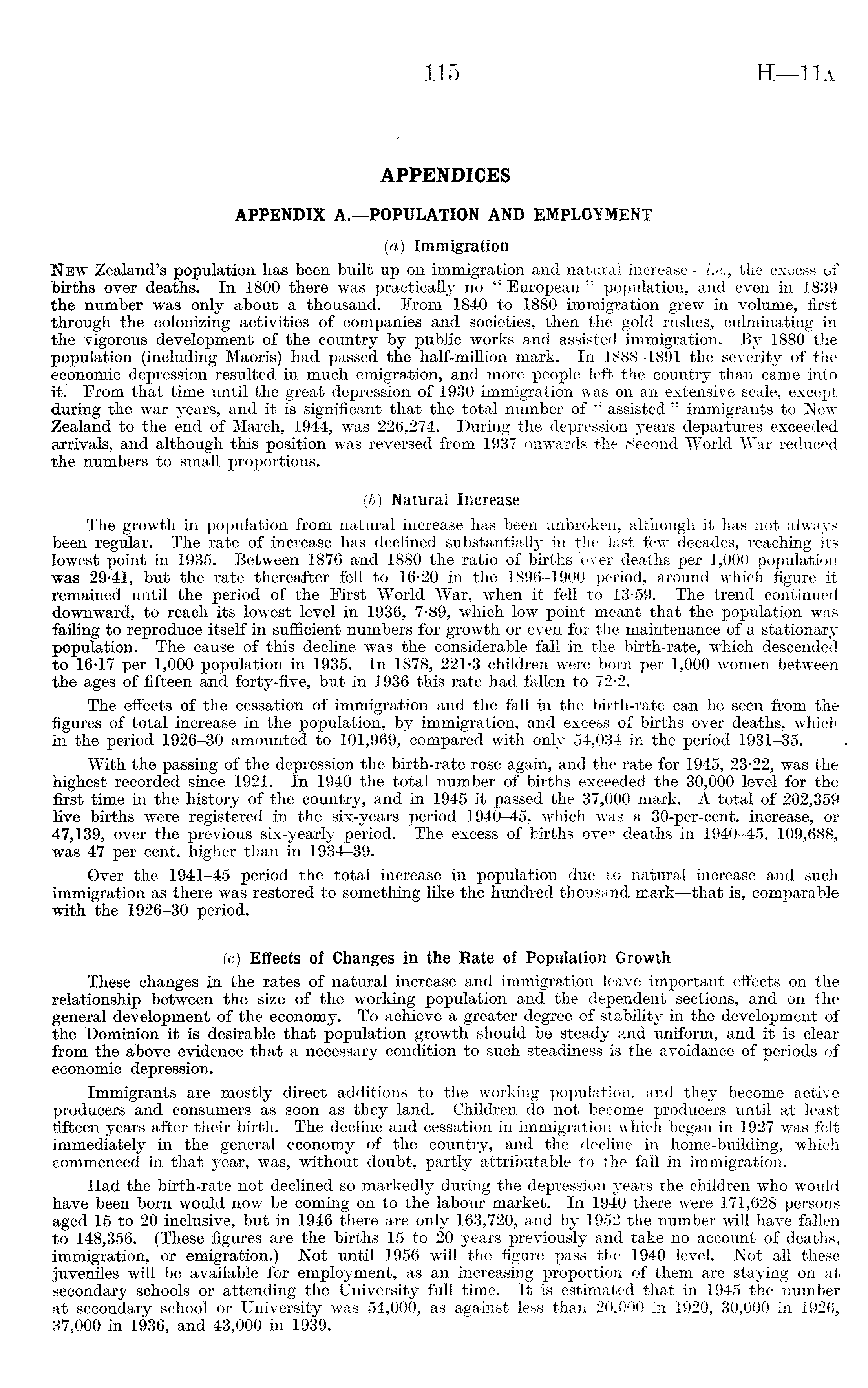 APPENDICES APPENDIX A.—POPULATION AND EMPLOYMENT (a) Immigration New Zealand's population has been built up on immigration and natural increase—i.e., the excess of births over deaths. In 1800 there was practically no " European " population, and even in 1839 the number was only about a thousand. From 1840 to 1880 immigration grew in volume, first through the colonizing activities of companies and societies, then the gold rushes, culminating in the vigorous development of the country by public works and assisted immigration. By 1880 the population (including Maoris) had passed the half-million mark. In 1888-1891 the severity of the economic depression resulted in much emigration, and more people left the country than came into it. From that time until the great depression of 1930 immigration was on an extensive scale, except during the war years, and it is significant that the total number of " assisted " immigrants to New Zealand to the end of March, 1944, was 226,274. During the depression years departures exceeded arrivals, and although this position was reversed from 1937 onwards the Second World War reduced the numbers to small proportions. (b) Natural Increase The growth in population from natural increase has been unbroken, although it has not always been regular. The rate of increase has declined substantially in the last few decades, reaching its lowest point in 1935. Between 1876 and 1880 the ratio of births over deaths per 1,000 population was 29-41, but the rate thereafter fell to 16-20 in the 1896-1900 period, around which figure it remained until the period of the First World War, when it fell to 13-59. The trend continued downward, to reach its lowest level in 1936, 7*89, which low point meant that the population was failing to reproduce itself in sufficient numbers for growth or even for the maintenance of a stationary population. The cause of this decline was the considerable fall in the birth-rate, which descended to 16-17 per 1,000 population in 1935. In 1878, 221*3 children were born per 1,000 women between the ages of fifteen and forty-five, but in 1936 this rate had fallen to 72-2. The effects of the cessation of immigration and the fall in the birth-rate can be seen from the figures of total increase in the population, by immigration, and excess of births over deaths, which in the period 1926-30 amounted to 101,969, compared with only 54,034 in the period 1931-35. With the passing of the depression the birth-rate rose again, and the rate for 1945, 23-22, was the highest recorded since 1921. In 1940 the total number of births exceeded the 30,000 level for the first time in the history of the country, and in 1945 it passed the 37,000 mark. A total of 202,359 live births were registered in the six-years period 1940-45, which was a 30-per-cent. increase, or 47,139, over the previous six-yearly period. The excess of births over deaths in 1940-45, 109,688, was 47 per cent, higher than in 1934-39. Over the 1941—45 period the total increase in population due to natural increase and such immigration as there was restored to something like the hundred thousand mark —that is, comparable with the 1926-30 period. (c) Effects of Changes in the Rate of Population Growth These changes in the rates of natural increase and immigration leave important effects on the relationship between the size of the working population and the dependent sections, and on the general development of the economy. To achieve a greater degree of stability in the development of the Dominion it is desirable that population growth should be steady and uniform, and it is clear from the above evidence that a necessary condition to such steadiness is the avoidance of periods of economic depression. Immigrants are mostly direct additions to the working population, and they become active producers and consumers as soon as they land. Children do not become producers until at least fifteen years after their birth. The decline and cessation in immigration which began in 1927 was felt immediately in the general economy of the country, and the decline in home-building, which commenced in that year, was, without doubt, partly attributable to the fall in immigration. Had the birth-rate not declined so markedly during the depression years the children who would have been born would now be coming on to the labour market. In 1940 there were 171,628 persons aged 15 to 20 inclusive, but in 1946 there are only 163,720, and by 1952 the number will have fallen to 148,356. (These figures are the births 15 to 20 years previously ahd take no account of deaths, immigration, or emigration.) Not until 1956 will the figure pass the 1940 level. Not all these juveniles will be available for employment, as an increasing proportion of them are staying on at secondary schools or attending the University full time. It is estimated that in 1945 the number at secondary school or University was 54,000, as against less than 20,000 in 1920, 30,000 in 1926, 37,000 in 1936, and 43,000 in 1939.