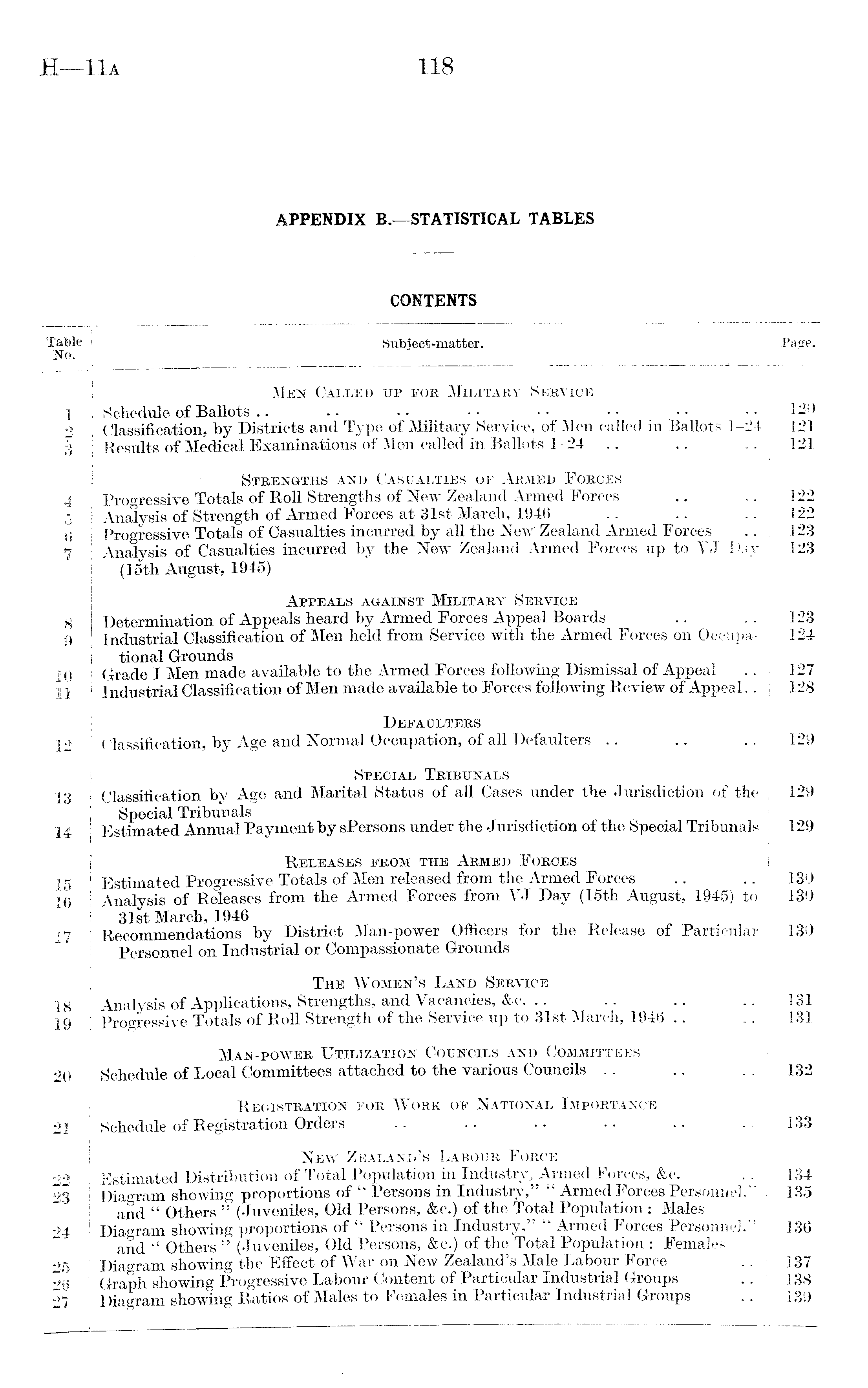 CONTENTS Table I Subiect-matter. I Page. No. I * |- Men Called up for Military Service 1 ! Schedule of Ballots .. .. .. • • • • • • • • • • 120 2 Classification, by Districts and Type of Military Service, of Men called in Ballots 1-24 121 3 Results of Medical Examinations of Men called in Ballots 124 .. .. .. 121 Strengths and Casualties of Armed Forces 4 Progressive Totals of Roll Strengths of New Zealand Armed Forces .. .. 122 5 Analysis of Strength of Armed Forces at 31st March, 1946 .. .. .. 122 6 Progressive Totals of Casualties incurred by all the New Zealand Armed Forces .. 123 7 Analvsis of Casualties incurred by the New Zealand Armed Forces up to YJ Day 123 (15th August, 1945) Appeals against Military Service 8 Determination of Appeals heard by Armed Forces Appeal Boards .. .. 123 9 Industrial Classification of Men held from Service with the Armed Forces on Occupa- 124 tional Grounds 10 Grade I Men made available to the Armed Forces following Dismissal of Appeal .. 127 11 Industrial Classification of Men made available to Forces following Review of Appeal.. 128 Defaulters 12 Classification, by Age and Normal Occupation, of all Defaulters .. .. .. 129 Special Tribunals 13 Classification by Age and Marital Status of all Cases under the Jurisdiction of the 129 Special Tribunals 14 Estimated Annual Payment by sPersons under the Jurisdiction of the Special Tribunals 129 Releases from the Armed Forces 15 Estimated Progressive Totals of Men released from the Armed Forces .. .. 130 16 Analysis of Releases from the Armed Forces from YJ Day (15th August, 1945) to 130 I 31st March, 1946 17 Recommendations by District Man-power Officers for the Release of Particular 130 Personnel on Industrial or Compassionate Grounds The Women's Land Service 18 Analysis of Applications, Strengths, and Vacancies, &c. .. .. .. .. 131 19 Progressive Totals of Roll Strength of the Service up to 31st March, 1946 .. .. 131 Man-power Utilization Councils and Committees 20 " ! Schedule of Local Committees attached to the various Councils .. .. 132 Registration for Work of National Importance 21 1 Schedule of Registration Orders .. .. .. .. .. .. 133 New Zealand's Labour Force 22 Estimated Distribution of Total Population in Industry, Armed Forces, &c. .. , 134 23 Diagram showing proportions of " Persons in Industry," " Armed Forces Personnel," 135 and " Others " (Juveniles, Old Persons, &c.) of the Total Population : Males 24 Diagram showing proportions of " Persons in Industry," " Armed Forces Personnel," j 136 and " Others " (Juveniles, Old Persons, &c.) of the Total Population : Females 25 Diagram showing the Effect of War on New Zealand's Male Labour Force .. | 137 26 Graph showing Progressive Labour Content of Particular Industrial Groups .. | 138 27 ! Diagram showing Ratios of Males to Females in Particular Industrial Groups .. 1 139 i