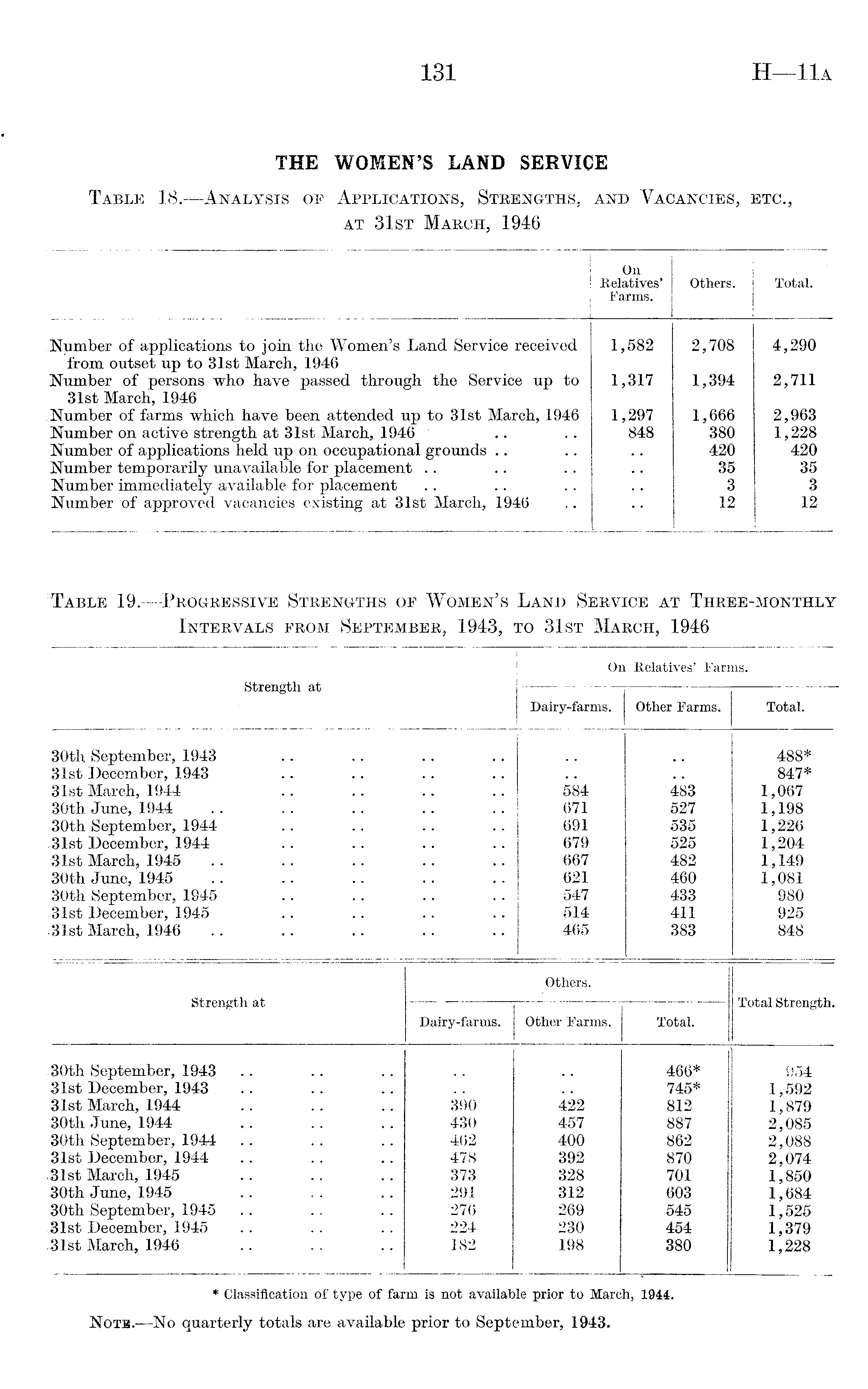 ! -> i On Relatives' Farms. Others. Total. Number of applications to join the Women's Land Service received 1,582 2,708 4,290 from outset up to 31st March, 1946 Number of persons who have passed through the Service up to 1,317 1,394 2,711 31st March, 1946 Number of farms which have been attended up to 31st March, 1946 1,297 1,666 2,963 Number on active strength at 31st March, 1946 848 380 1,228 Number of applications held up on occupational grounds 420 420 Number temporarily unavailable for placement 35 35 Number immediately available for placement 3 3 Number of approved vacancies existing at 31st March, 1946 12 12