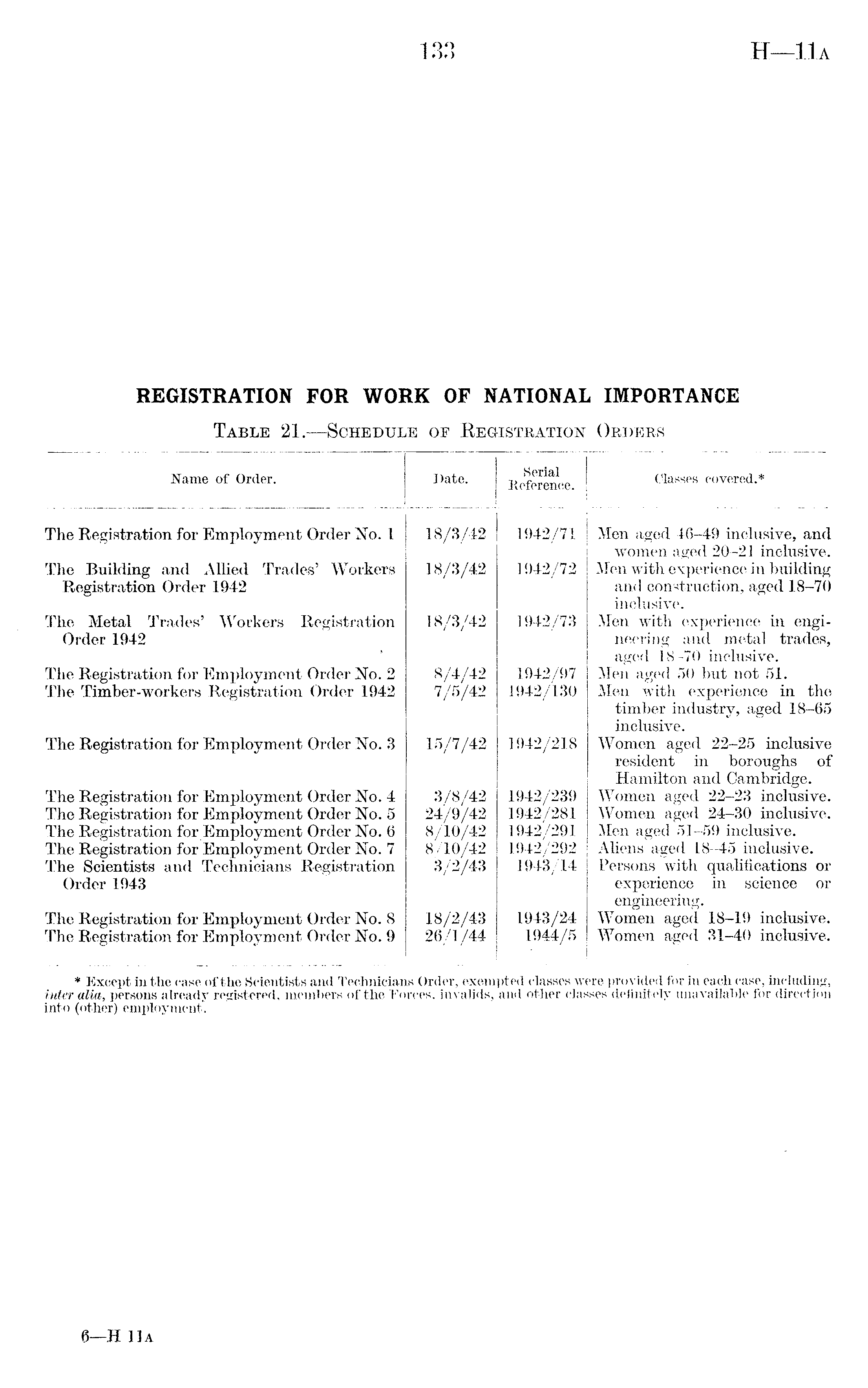 Name of Order. Date. Serial Reference. Classes covered.* The Registration for Employment Order No. 1 18/3/42 1942/71 Men aged 46-49 inclusive, and women aged 20-21 inclusive. The Building and Allied Trades' Workers 18/3/42 1942/72 Men with experience in building Registration Order 1942 and construction, aged 18-70 inclusive. The Metal Trades' Workers Registration 18/3/42 1942/73 Men with experience in engiOrder 1942 neering and metal trades, aged 18-70 inclusive. The Registration for Employment Order No. 2 8/4/42 1942/97 Men aged 50 but not 51. The Timber-workers Registration Order 1942 7/5/42 1942/130 Men with experience in the timber industry, aged 18-65 inclusive. The Registration for Employment Order No. 3 15/7/42 1942/218 Women aged 22-25 inclusive resident in boroughs of Hamilton and Cambridge. The Registration for Employment Order No. 4 3/8/42 1942/239 Women aged 22-23 inclusive. The Registration for Employment Order No. 5 24/9/42 1942/281 Women aged 24-30 inclusive. The Registration for Employment Order No. 6 8/10/42 1942/291 Men aged 51-59 inclusive. The Registration for Employment Order No. 7 8/10/42 1942/292 Aliens aged 18-45 inclusive. The Scientists and Technicians Registration 3/2/43 1943/14 Persons with qualifications or Order 1943 experience in science or engineering. The Registration for Employment Order No. 8 18/2/43 1943/24 Women aged 18-19 inclusive. The Registration for Employment Order No. 9 26/1/44 1944/5 Women aged 31-40 inclusive. * Except in tlie case of the Scientists and Technicians Order, exempted classes were provided for in each case, including, inter alia, persons already registered, members of the Forces, invalids, and other classes definitely unavailable for direction into (other) employment.