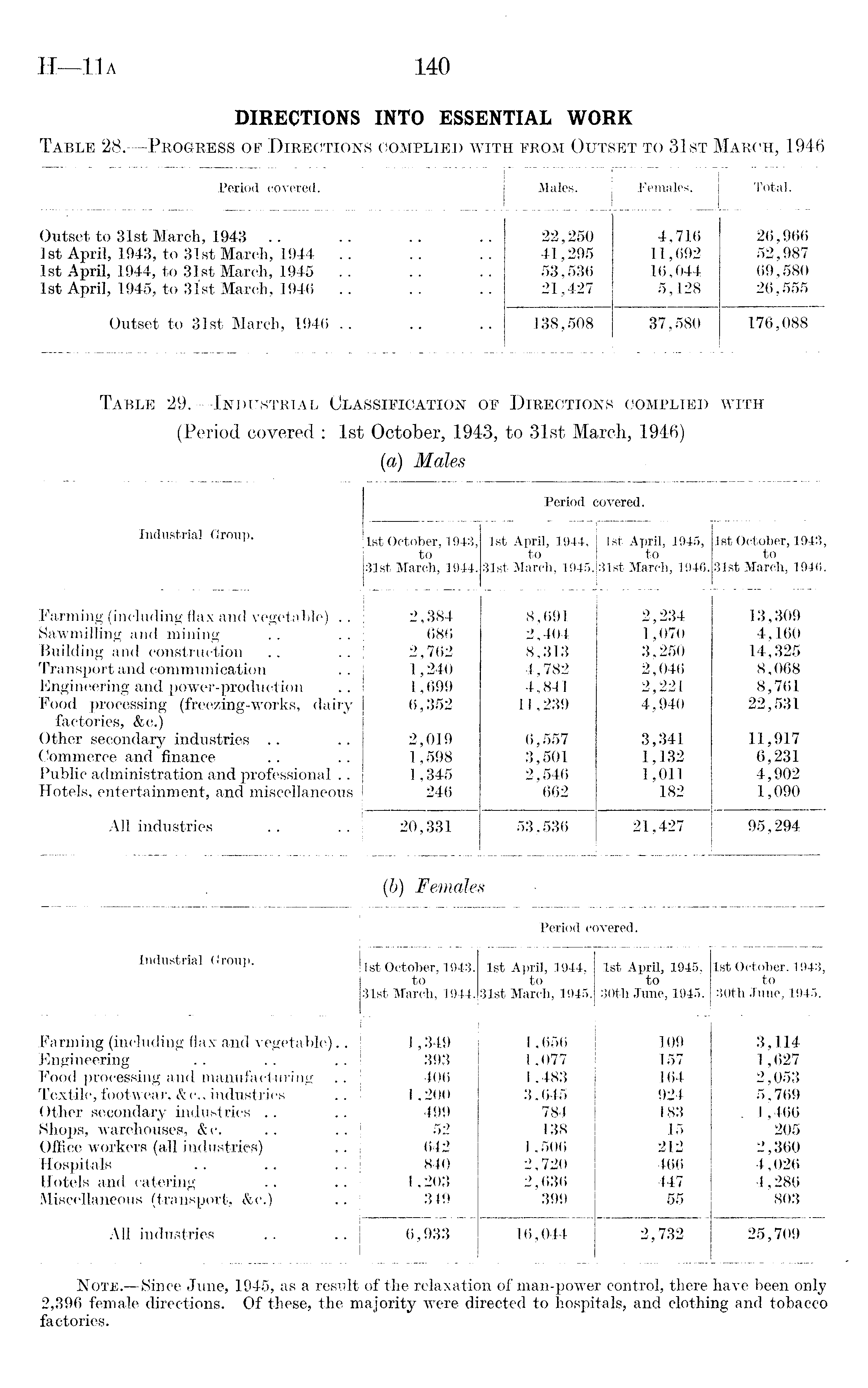 Industrial Group. Period covered. 1st October, 1943, to 31st March, 1944. 1st April, 1944, to 31st March, 1945. 1st April, 1945, to 30th June, 1945. 1st October, 1943, to 30th June, 1945. Farming (including flax and vegetable).. 1,349 1,656 109 3,114 Engineering 393 1,077 157 1,627 Food processing and manufacturing 406 1,483 164 2,053 Textile, footwear, & c., industries 1,200 3,645 924 5,769 Other secondary industries 499 784 183 . 1,466 Shops, warehouses, &c. 52 138 15 205 Office workers (all industries) 642 ] ,506 212 2,360 Hospitals 840 2,720 466 4,026 Hotels and catering 1,203 2,636 447 4,286 Miscellaneous (transport, &c.) 349 399 55 803 All industries 6,933 16,044 2,732 25,709 Note.—Since June, 1945, as a result of the relaxation of man-power control, there have been only 2,396 female directions. Of these, the majority were directed to hospitals, and clothing and tobacco factories.