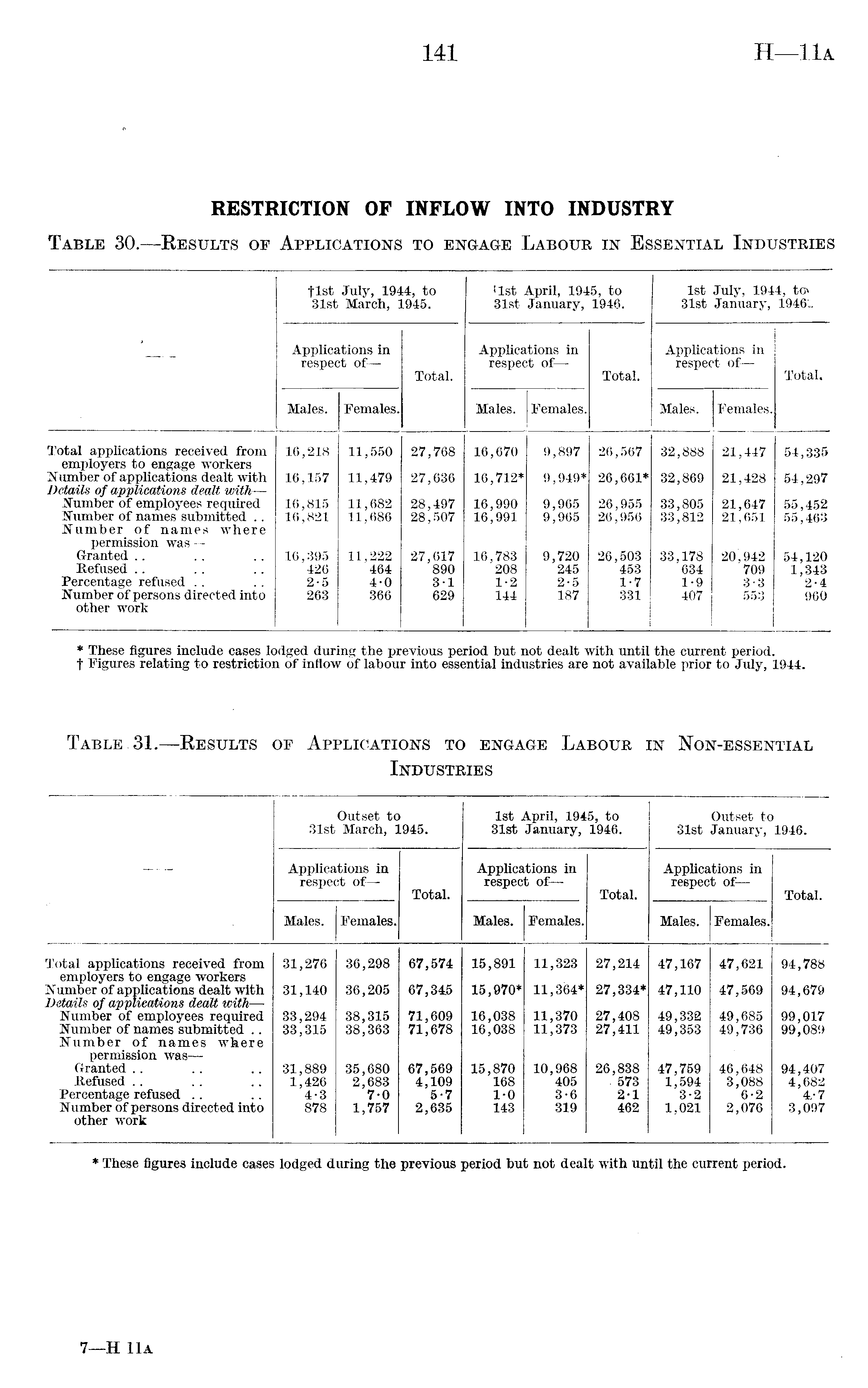 RESTRICTION OF INFLOW INTO INDUSTRY Table 30.—Results of Applications to engage Labour in Essential Industries