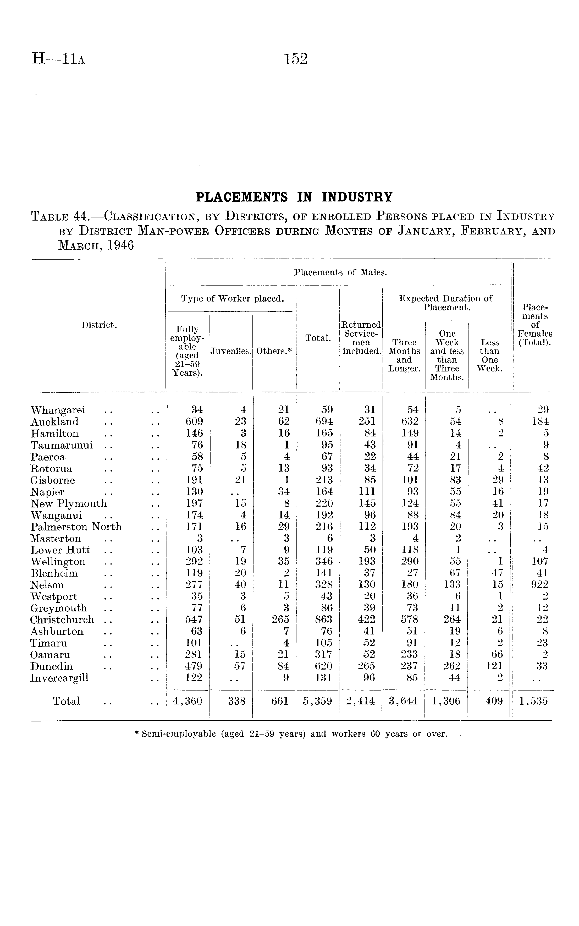 Placements of Males. Type of Worker placed. Expected Duration of Placement. Placements District. Fully employable (aged 21-59 Years). Juveniles. Others.* Total. Returned Servicemen included. Three Months and Longer. One Week and less than Three Months. Less than One Week. of Females (Total). Whangarei Auckland Hamilton Taumarunui Paeroa Rotorua Gisborne Napier New Plymouth Wanganui Palmerston North Masterton Lower Hutt Wellington Blenheim Nelson Westport Greymouth Christchurch Ashburton Timaru Oamaru Dunedin .. Invercargill 34 609 146 76 58 75 191 130 197 174 171 3 103 292 119 277 35 77 547 63 101 281 479 122 4 23 3 18 5 5 21 15 4 16 "l 19 20 40 3 6 51 6 15 57 21 62 16 1 4 13 1 34 8 14 29 3 9 35 2 11 5 3 265 7 4 21 84 9 59 694 165 95 67 93 213 164 220 192 216 6 119 346 141 328 43 86 863 76 105 317 620 131 31 251 84 43 22 34 85 111 145 96 112 3 50 193 37 130 20 39 422 41 52 52 265 96 54 632 149 91 44 72 101 93 124 88 193 4 118 290 27 180 36 73 578 51 91 233 237 85 5 54 14 4 21 17 83 55 55 84 20 2 1 55 67 133 6 11 264 19 12 18 262 44 8 2 2 4 29 16 41 20 3 1 47 15 1 2 21 6 2 66 121 2 29 184 5 9 8 42 13 19 17 18 15 4 107 41 922 2 12 22 8 23 2 33 Total 4,360 338 661 5,359 2,414 3,644 1,306 409 1,535 * Semi-employable (aged 21-59 years) and workers 60 years or over.