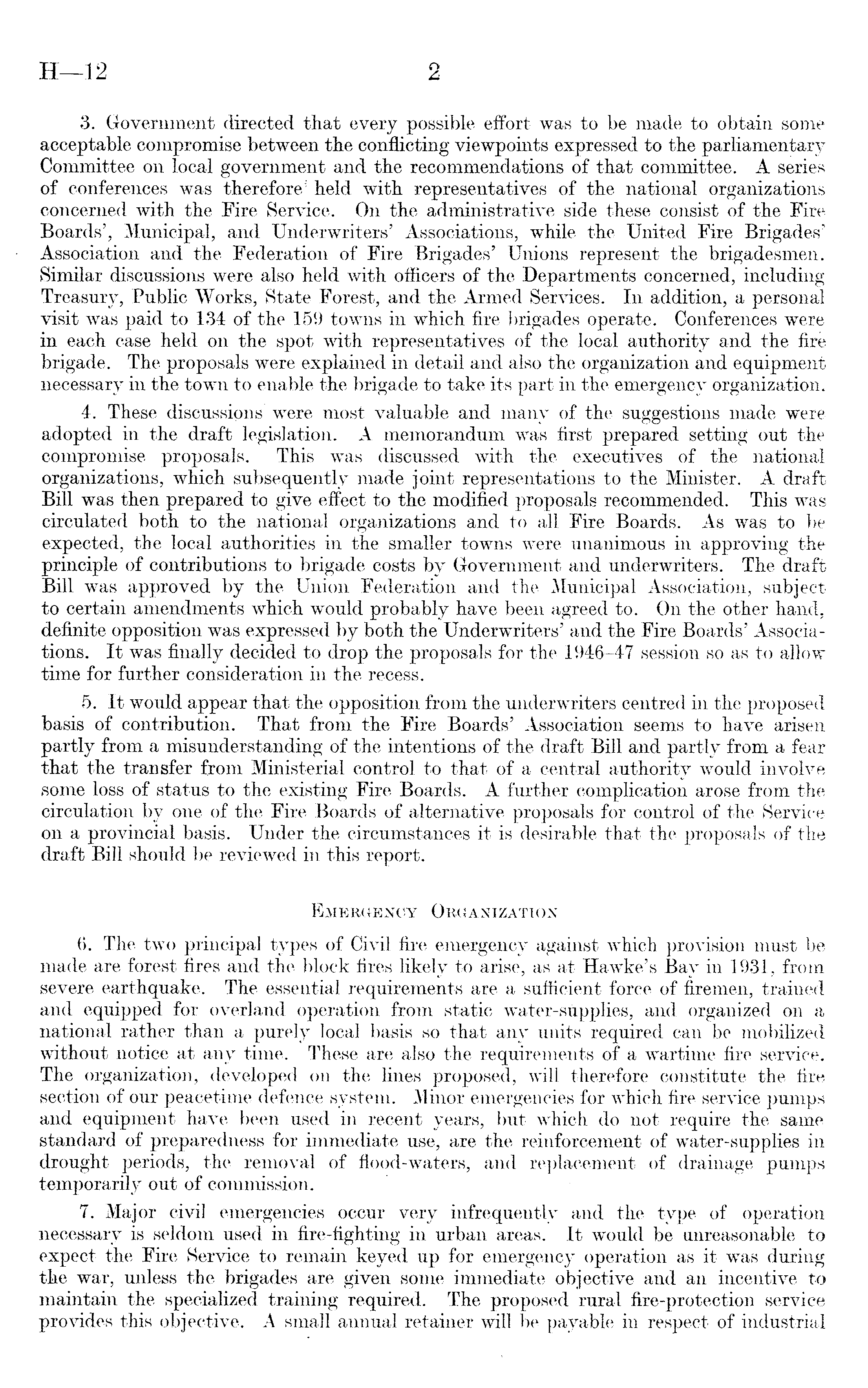3. Government directed that every possible effort was to be made to obtain some acceptable compromise between the conflicting viewpoints expressed to the parliamentary Committee on local government and the recommendations of that committee. A series of conferences was therefore 1 held with representatives of the national organizations concerned with the Fire Service. On the administrative side these consist of the Fire Boards', Municipal, and Underwriters' Associations, while the United Fire Brigades' Association and the Federation of Fire Brigades' Unions represent the brigadesmen. Similar discussions were also held with officers of the Departments concerned, including Treasury, Public Works, State Forest, and the Armed Services. In addition, a personal visit was paid to 134 of the 159 towns in which fire brigades operate. Conferences were in each case held on the spot with representatives of the local authority and the fire brigade. The proposals were explained in detail and also the organization and equipment necessary in the town to enable the brigade to take its part in the emergency organization. 4. These discussions were most valuable and many of the suggestions made were adopted in the draft legislation. A memorandum was first prepared setting out the compromise proposals. This was discussed with the executives of the national organizations, which subsequently made joint representations to the Minister. A draft Bill was then prepared to give effect to the modified proposals recommended. This was circulated both to the national organizations and to all Fire Boards. As was to be expected, the local authorities in the smaller towns were unanimous in approving the principle of contributions to brigade costs by Government and underwriters. The draft Bill was approved by the Union Federation and the Municipal Association, subject to certain amendments which would probably have been agreed to. On the other hand, definite opposition was expressed by both the Underwriters' and the Fire Boards' Associations. It was finally decided to drop the proposals for the 1946-47 session so as to allow time for further consideration in the recess. 5. It would appear that the opposition from the underwriters centred in the proposed basis of contribution. That from the Fire Boards' Association seems to have arisen partly from a misunderstanding of the intentions of the draft Bill and partly from a fear that the transfer from Ministerial control to that of a central authority would involve some loss of status to the existing Fire Boards. A further complication arose from the circulation by one of the Fire Boards of alternative proposals for control of the Service on a provincial basis. Under the circumstances it is desirable that the proposals of the draft Bill should be reviewed in this report. Emergency Organization 6. The two principal types of Civil fire emergency against which provision must be made are forest fires and the block fires likely to arise, as at Hawke's Bay in 1931, from severe earthquake. The essential requirements are a sufficient force of firemen, trained and equipped for overland operation from static water-supplies, and organized on a national rather than a purely local basis so that any units required can be mobilized without notice at any time. These are also the requirements of a wartime fire service. The organization, developed on the lines proposed, will therefore constitute the fire section of our peacetime defence system. Minor emergencies for which fire service pumps and equipment have been used in recent years, but which do not require the same standard of preparedness for immediate use, are the reinforcement of water-supplies in drought periods, the removal of flood-waters, and replacement of drainage pumps temporarily out of commission. 7. Major civil emergencies occur very infrequently and the type of operation necessary is seldom used in fire-fighting in urban areas. It would be unreasonable to expect the Fire Service to remain keyed up for emergency operation as it was during the war, unless the brigades are given some immediate objective and an incentive to maintain the specialized training required. The proposed rural fire-protection service provides this objective. A small annual retainer will be payable in respect of industrial