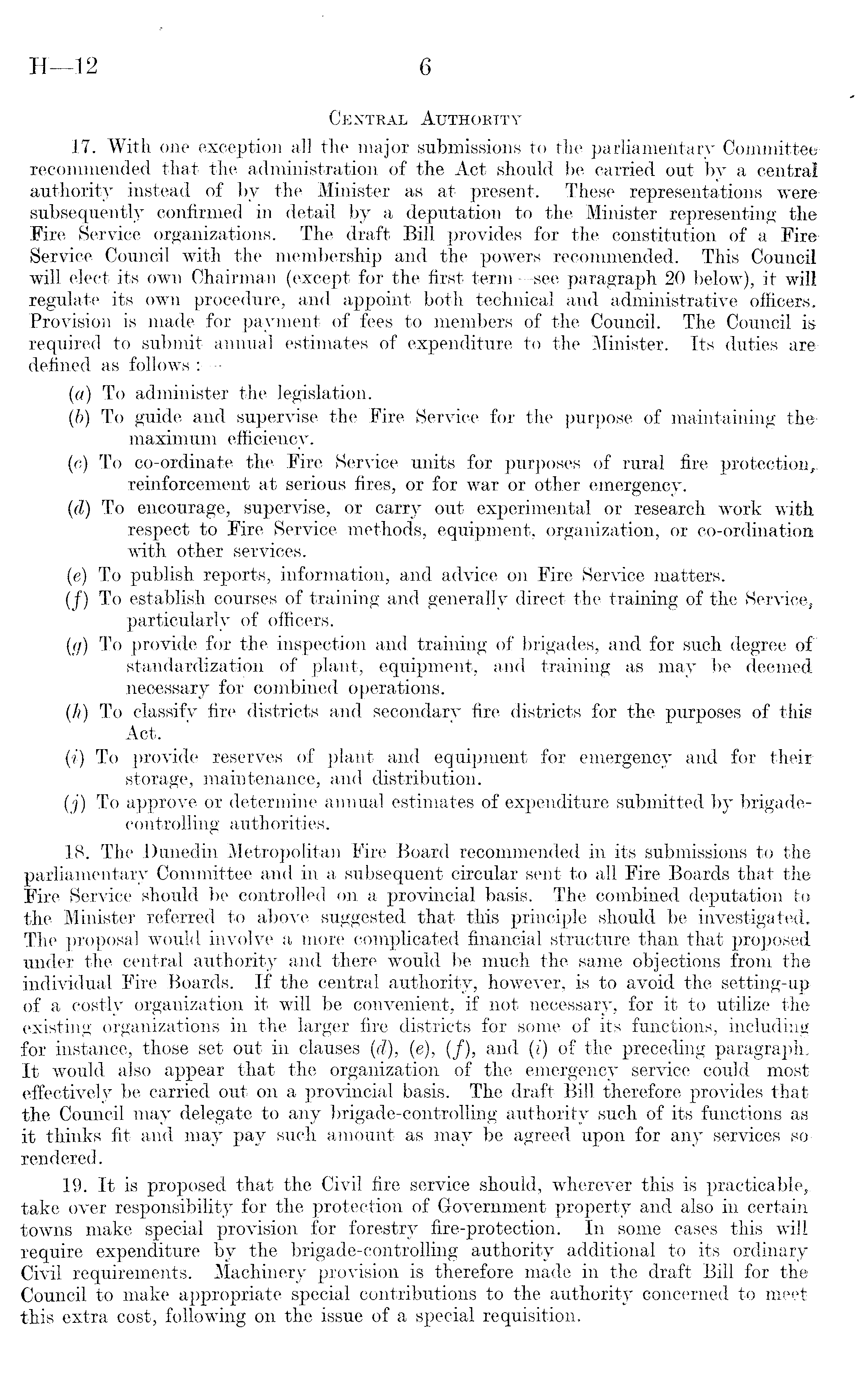 Central Authority 17. With one exception all the major submissions to the parliamentary Committee recommended that the administration of the Act should be carried out by a central authority instead of by the Minister as at present. These representations were subsequently confirmed in detail by a deputation to the Minister representing the Fire Service organizations. The draft Bill provides for the constitution of a Fire Service Council with the membership and the powers recommended. This Council will elect its own Chairman (except for the first term —see paragraph 20 below), it will regulate its own procedure, and appoint both technical and administrative officers. Provision is made for payment of fees to members of the Council. The Council is required to submit annual estimates of expenditure to the Minister. Its duties are defined as follows : (a) To administer the legislation. (b) To guide and supervise the Fire Service for the purpose of maintaining the maximum efficiency. (c) To co-ordinate the Fire Service units for purposes of rural fire protection,. reinforcement at serious fires, or for war or other emergency. (d) To encourage, supervise, or carry out experimental or research work with respect to Fire Service methods, equipment, organization, or co-ordination with other services. (e) To publish reports, information, and advice on Fire Service matters. (f) To establish courses of training and generally direct the training of the Service, particularly of officers. (g) To provide for the inspection and training of brigades, and for such degree of standardization of plant, equipment, and training as may be deemed necessary for combined operations. (k) To classify fire districts and secondary fire districts for the purposes of this Act. (i) To provide reserves of plant and equipment for emergency and for their storage, maintenance, and distribution. (j) To approve or determine annual estimates of expenditure submitted by brigadecontrolling authorities. 18. The Dunedin Metropolitan Fire Board recommended in its submissions to the parliamentary Committee and in a subsequent circular sent to all Fire Boards that the Fire Service should be controlled on a provincial basis. The combined deputation to the Minister referred to above suggested that this principle should be investigated. The proposal would involve a more complicated financial structure than that proposed under the central authority and there would be much the same objections from the individual Fire Boards. If the central authority, however, is to avoid the setting-up of a costly organization it will be convenient, if not necessary, for it to utilize the existing organizations in the larger fire districts for some of its functions, including for instance, those set out in clauses (d), (e), (/), and (i) of the preceding paragraph. It would also appear that the organization of the emergency service could most effectively be carried out on a provincial basis. The draft Bill therefore provides that the Council may delegate to any brigade-controlling authority such of its functions as it thinks fit and may pay such amount as may be agreed upon for any services sorendered. 19. It is proposed that the Civil fire service should, wherever this is practicable, take over responsibility for the protection of Government property and also in certain towns make special provision for forestry fire-protection. In some cases this will require expenditure by the brigade-controlling authority additional to its ordinary Civil requirements. Machinery provision is therefore made in the draft Bill for the Council to make appropriate special contributions to the authority concerned to meet this extra cost, following on the issue of a special requisition.