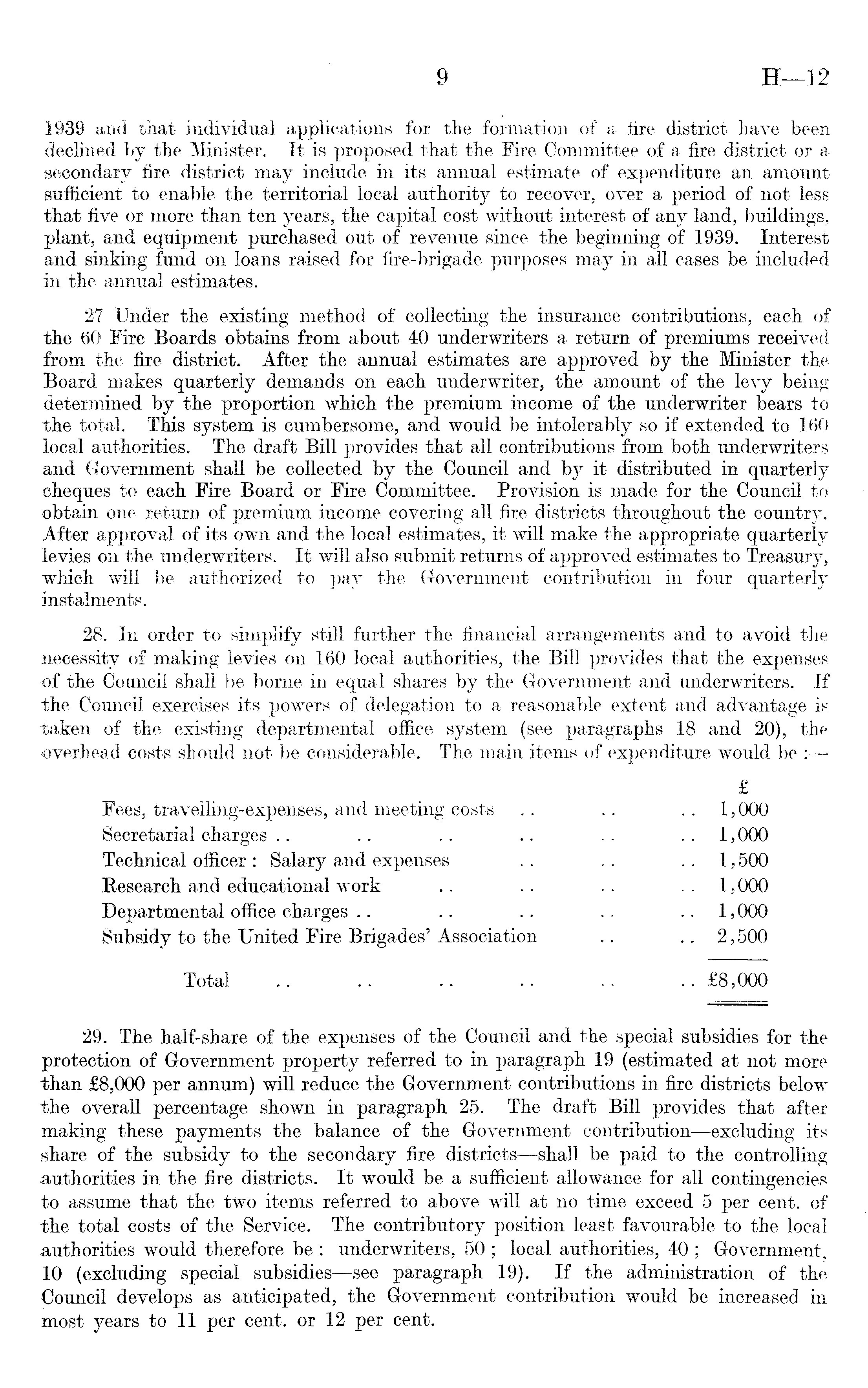 1939 and that individual applications for the formation of a fire district have been declined by the Minister. It is proposed that the Fire Committee of a fire district or a secondary fire district may include in its annual estimate of expenditure an amount sufficient to enable the territorial local authority to recover, over a period of not less that five or more than ten years, the capital cost without interest of any land, buildings, plant, and equipment purchased out of revenue since the beginning of 1939. Interest and sinking fund on loans raised for fire-brigade purposes may in all cases be included in the annual estimates. 27 Under the existing method of collecting the insurance contributions, each of the 60 Fire Boards obtains from about 40 underwriters a return of premiums received from the fire district. After the annual estimates are approved by the Minister the Board makes quarterly demands on each underwriter, the amount of the levy being determined by the proportion which the premium income of the underwriter bears to the total. This system is cumbersome, and would be intolerably so if extended to 160 local authorities. The draft Bill provides that all contributions from both underwriters and Government shall be collected by the Council and by it distributed in quarterly cheques to each Fire Board or Fire Committee. Provision is made for the Council to obtain one return of premium income covering all fire districts throughout the country. After approval of its own and the local estimates, it will make the appropriate quarterly levies on the underwriters. It will also submit returns of approved estimates to Treasury, which will be authorized to pay the Government contribution in four quarterly instalments. 28. In order to simplify still further the financial arrangements and to avoid the necessity of making levies on 160 local authorities, the Bill provides that the expenses •of the Council shall be borne in equal shares by the Government and underwriters. If the Council exercises its powers of delegation to a reasonable extent and advantage is taken of the existing departmental office system (see paragraphs 18 and 20), the overhead costs should not be considerable. The main items of expenditure would be : £ Fees, travelling-expenses, and meeting costs .. .. 1,000 Secretarial charges .. .. .. .. .. .. 1,000 Technical officer : Salary and expenses .. .. 1,500 Research and educational work .. .. .. .. 1,000 Departmental office charges .. .. ... .. 1,000 Subsidy to the United Fire Brigades' Association .. .. 2,500 Total .. .. .. .. .. .. £B,OOO 29. The half-share of the expenses of the Council and the special subsidies for the protection of Government property referred to in paragraph 19 (estimated at not more than £B,OOO per annum) will reduce the Government contributions in fire districts below the overall percentage shown in paragraph 25. The draft Bill provides that after making these payments the balance of the Government contribution—excluding its share of the subsidy to the secondary fire districts —shall be paid to the controlling authorities in the fire districts. It would be a sufficient allowance for all contingencies to assume that the two items referred to above will at no time exceed 5 per cent, of the total costs of the Service. The contributory position least favourable to the local authorities would therefore be : underwriters, 50 ; local authorities, 40 ; Government, 10 (excluding special subsidies —see paragraph 19). If the administration of the Council develops as anticipated, the Government contribution would be increased in most years to 11 per cent, or 12 per cent.