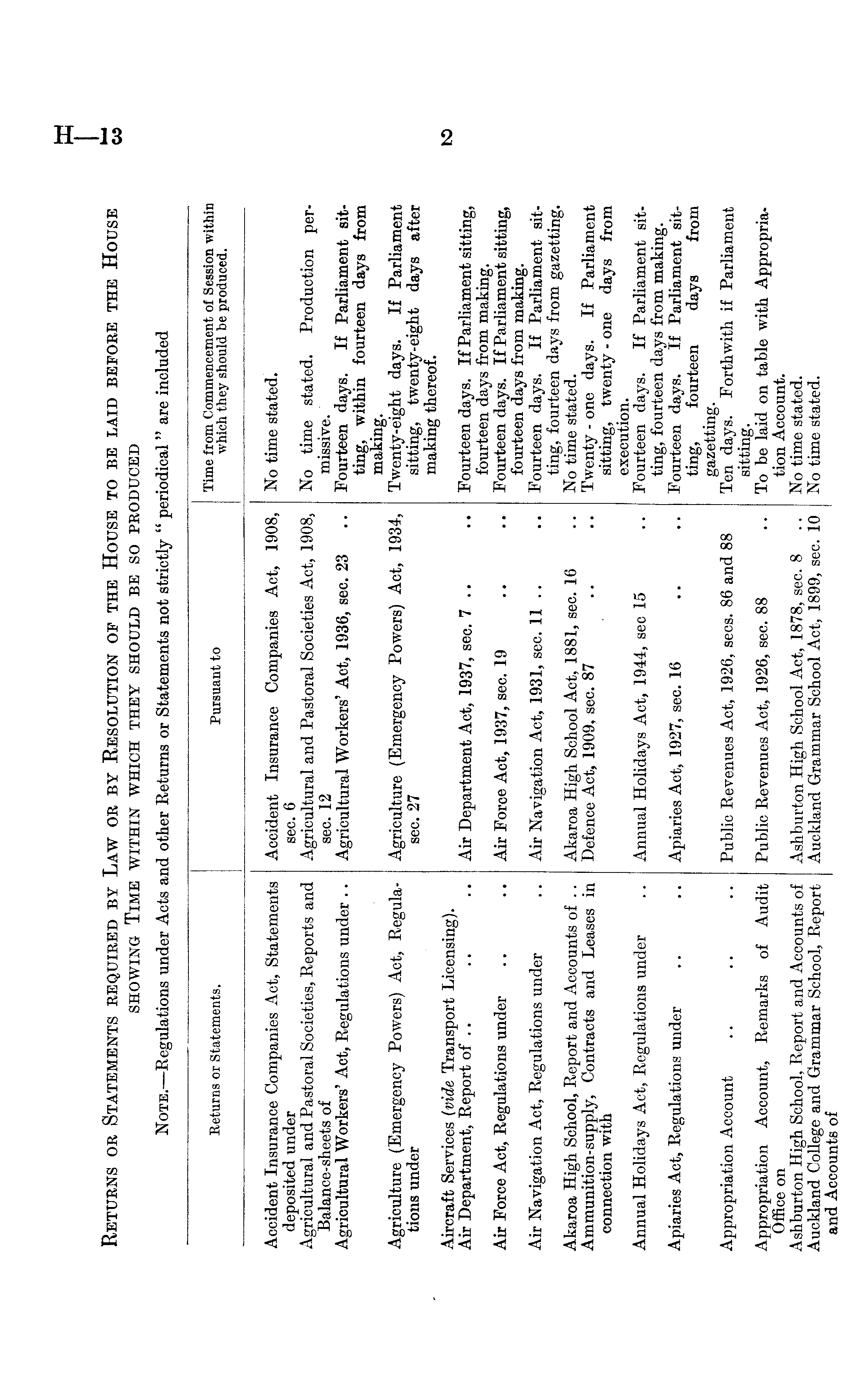 Note. —Regulations under Acts and other Returns or Statements not strictly " periodical" are included Returns or Statements. Pursuant to Time from Commencement of Session within which they should be produced. Accident Insurance Companies Act, Statements deposited under Agricultural and Pastoral Societies, Reports and Balance-sheets of Agricultural Workers' Act, Regulations under .. Agriculture (Emergency Powers) Act, Regulations under Aircraft Services (vide Transport Licensing). Air Department, Report of .. Air Force Act, Regulations under Air Navigation Act, Regulations under Akaroa High School, Report and Accounts of .. Ammunition- supply, Contracts and Leases in connection with Annual Holidays Act, Regulations under Apiaries Act, Regulations under Appropriation Account Appropriation Account, Remarks of Audit Office on Ashburton High School, Report and Accounts of Auckland College and Grammar School, Report and Accounts of Accident Insurance Companies Act, 1908, sec. 6 Agricultural and Pastoral Societies Act, 1908, sec. 12 Agricultural Workers' Act, 1936, sec. 23 Agriculture (Emergency Powers) Act, 1934, sec. 27 Air Department Act, 1937, sec. 7 .. Air Force Act, 1937, sec. 19 Air Navigation Act, 1931, sec. 11 .. Akaroa High School Act, 1881, sec. 16 Defence Act, 1909, sec. 87 Annual Holidays Act, 1944, sec 15 Apiaries Act, 1927, sec. 16 Public Revenues Act, 1926, sees. 86 and 88 Public Revenues Act, 1926, sec. 88 Ashburton High School Act, 1878, sec. 8 Auckland Grammar School Act, 1899, sec. 10 No time stated. No time stated. Production permissive. Fourteen days. If Parliament sitting, within fourteen days from making. Twenty-eight days. If Parliament sitting, twenty-eight days after making thereof. Fourteen days. If Parliament sitting, fourteen days from making. Fourteen days. If Parliament sitting, fourteen days from making. Fourteen days. If Parliament sitting, fourteen days from gazetting. No time stated. Twenty - one days. If Parliament sitting, twenty - one days from execution. Fourteen days. If Parliament sitting, fourteen days from making. Fourteen days. If Parliament sitting, fourteen days from gazetting. Ten days. Forthwith if Parliament sitting. To be laid on table with Appropriation Account. No time stated. No time stated.