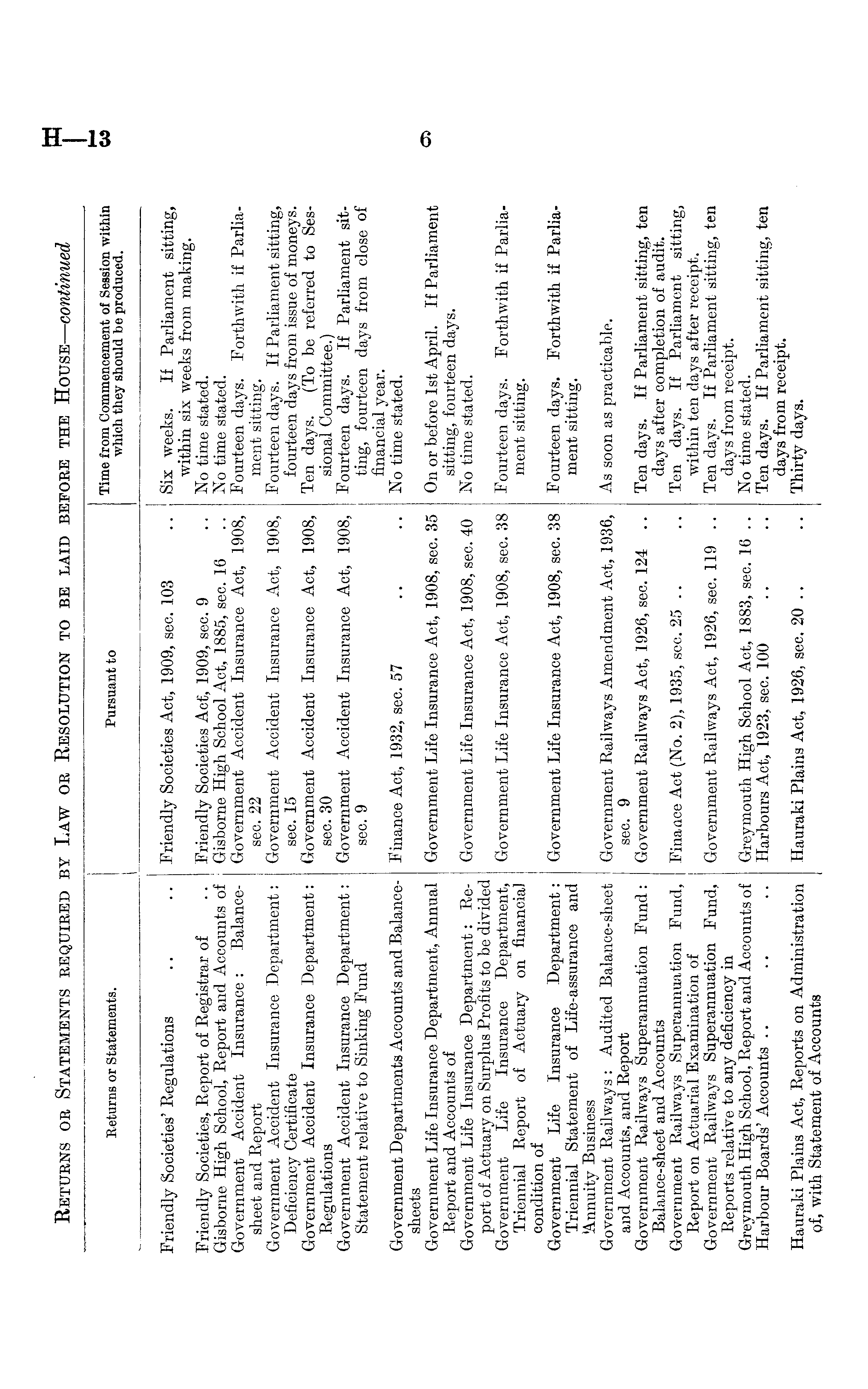-R ptnrnK or m-atpmmtq Pursuant to Time from Commencement of Session within Returns or Statements. .Pursuant to which they should be produced. Friendly Societies' Regulations .. .. Friendly Societies Act, 1909, sec. 103 .. Six weeks. If Parliament sitting, within six weeks from making. Friendly Societies, Report of Registrar of .. Friendly Societies Act", 1909, sec. 9 No time stated. Gisborne High. School, Report and Accounts of Gisborne High School Act, 1885, sec. 16 No time stated. Government Accident Insurance: Balance- Government Accident Insurance Act, 1908, Fourteen days. Forthwith if Parliasheet and Report sec. 22 ment sitting. Government Accident Insurance Department: Government Accident Insurance Act, 1908, Fourteen days. If Parliament sitting, Deficiency Certificate sec. 15 fourteen days from issue of moneys. Government Accident Insurance Department: Government Accident Insurance Act, 1908, Ten days. (To be referred to SesRegulations sec. 30 sional Committee.) Government Accident Insurance Department: Government Accident Insurance Act, 1908, Fourteen days. If Parliament sitStatement relative to Sinking Fund sec. 9 ting, fourteen days from close of financial year. Government Departments Accounts and Balance- Finance Act, 1932, sec. 57 .. .. No time stated, sheets Government Life Insurance Department, Annual Government Life Insurance Act, 1908, sec. 35 On or before 1st April. If Parliament Report and Accounts of sitting, fourteen days. Government Life Insurance Department: Re- Government Life Insurance Act, 1908, sec. 40 No time stated, port of Actuary on Surplus Profits to be divided Government Life Insurance Department, Government Life Insurance Act, 1908, sec. 38 Fourteen days. Forthwith if ParliaTriennial Report of Actuary on financial ment sitting, condition of Government Life Insurance Department: Government Life Insurance Act, 1908, sec. 38 Fourteen days. Forthwith if ParliaTriennial Statement of Life-assurance and ' ment sitting. Annuity Business Government Railways : Audited Balance-sheet Government Railways Amendment Act, 1936, As soon as practicable, and Accounts, and Report sec. 9 Government Railways Superannuation Fund : Government Railways Act, 1926, sec. 124 .. Ten days. If Parliament sitting, ten Balance-sheet and Accounts days after completion of audit. Government Railways Superannuation Fund, Finaace Act (No. 2), 1935, sec. 25 .. .. Ten days. If Parliament sitting, Report on Actuarial Examination of within ten days after receipt. Government Railways Superannuation Fund, Government Railways Act, 1926, sec. 119 .. Ten days. If Parliament sitting, ten Reports relative to any deficiency in days from receipt. Greymouth High School, Report and Accounts of Greymouth High School Act, 1883, sec. 16 .. No time stated. Harbour Boards' Accounts .. .. .. Harbours Act, 1923, sec. 100 .. .. Ten days. If Parliament sitting, ten days from receipt. Hauraki Plains Act, Reports on Administration Hauraki Plains Act, 1926, sec, 20 .. .. Thirty days, of, with Statement of Accounts