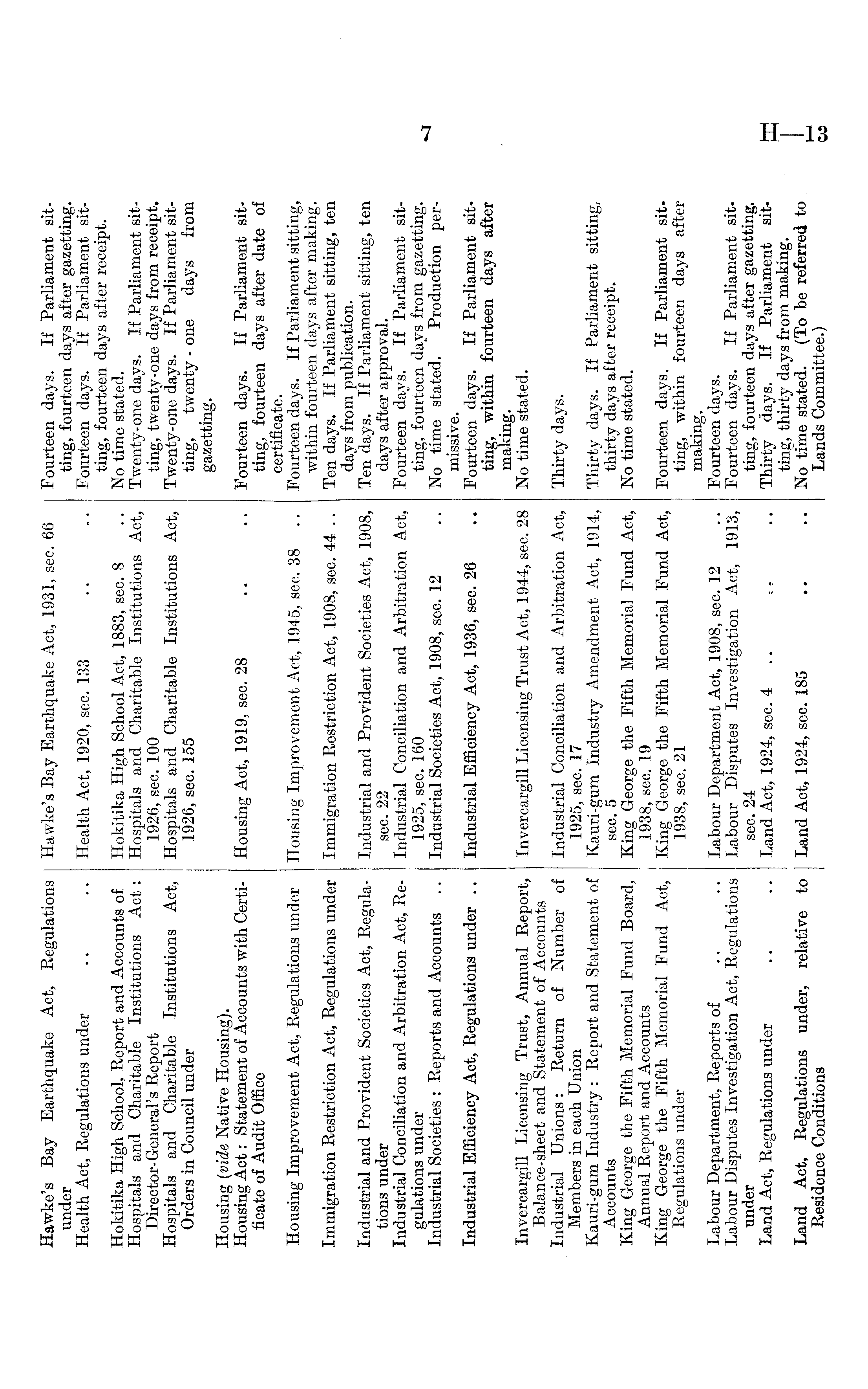Hawke's Bay Earthquake Act, Regulations Hawke's Bay Earthquake Act, 1931, sec. 66 Fourteen days. If Parliament situnder ting, fourteen days after gazetting. Health Act, Regulations under .. .. Health Act, 1920, sec. 133 .. .. Fourteen days. If Parliament sitting, fourteen days after receipt. Hokitika High School, Report and Accounts of Hokitika High School Act, 1883, sec. 8 No time stated. Hospitals and Charitable Institutions Act: Hospitals and Charitable Institutions Act, Twenty-one days. If Parliament sit-Director-General's Report 1926, sec. 100 ting, twenty-one days from receipt. Hospitals and Charitable Institutions Act, Hospitals and Charitable Institutions Act, Twenty-one days. If Parliament sitOrders in Council under 1926, sec. 155 ting, twenty - one days from gazetting. Housing (vide Native Housing). Housing Act: Statement of Accounts with Certi- Housing Act, 1919, sec. 28 .. .. Fourteen days. If Parliament sitficate of Audit Office ting, fourteen days after date of certificate. Housing Improvement Act, Regulations under Housing Improvement Act, 1945, sec. 38 .. Fourteen days. If Parliament sitting, within fourteen days after making. Immigration Restriction Act, Regulations under Immigration Restriction Act, 1908, sec. 44 .. Ten days. If Parliament sitting, ten days from publication. Industrial and Provident Societies Act, Regula- Industrial and Provident Societies Act, 1908, Ten days. If Parliament sitting, ten tions under sec. 22 days after approval. Industrial Conciliation and Arbitration Act, Re- Industrial Conciliation and Arbitration Act, Fourteen days. If Parliament sitgulations under 1925, sec. 160 ting, fourteen days from gazetting. Industrial Societies : Reports and Accounts .. Industrial Societies Act, 1908, sec. 12 No time stated. Production permissive. Industrial Efficiency Act, Regulations under .. Industrial Efficiency Act, 1936, sec. 26 .. Fourteen days. If Parliament sitting, within fourteen days after making. Invercargill Licensing Trust, Annual Report, Invercargill Licensing Trust Act, 1944, sec. 28 No time stated. Balance-sheet and Statement of Accounts Industrial Unions: Return of Number of Industrial Conciliation and Arbitration Act, Thirty days. Members in each Union 1925, sec. 17 Kauri-gum Industry: Report and Statement of Kauri-gum Industry Amendment Act, 1914, Thirty days. If Parliament sitting, Accounts sec. 5 thirty days after receipt. King George the Fifth Memorial Fund Board, King George the Fifth Memorial Fund Act, No time stated. Annual Report and Accounts 1938, sec. 19 King George the Fifth Memorial Fund Act, King George the Fifth Memorial Fund Act, Fourteen days. If Parliament sitRegulations under 1938, sec. 21 ting, within fourteen days after making. Labour Department, Reports of .. .. Labour Department Act, 1908, sec. 12 .. Fourteen days. Labour Disputes Investigation Act, Regulations Labour Disputes Investigation Act, 1913, Fourteen days. If Parliament situnder sec. 24 ting, fourteen days after gazetting. Land Act, Regulations under .. .-. Land Act, 1924, sec. 4 * - .. Thirty days. If Parliament sitting, thirty days from making. Land Act, Regulations under, relative to Land Act, 1924, sec. 185 .. .. No time stated. (To be referred to Residence Conditions Lands Committee.)