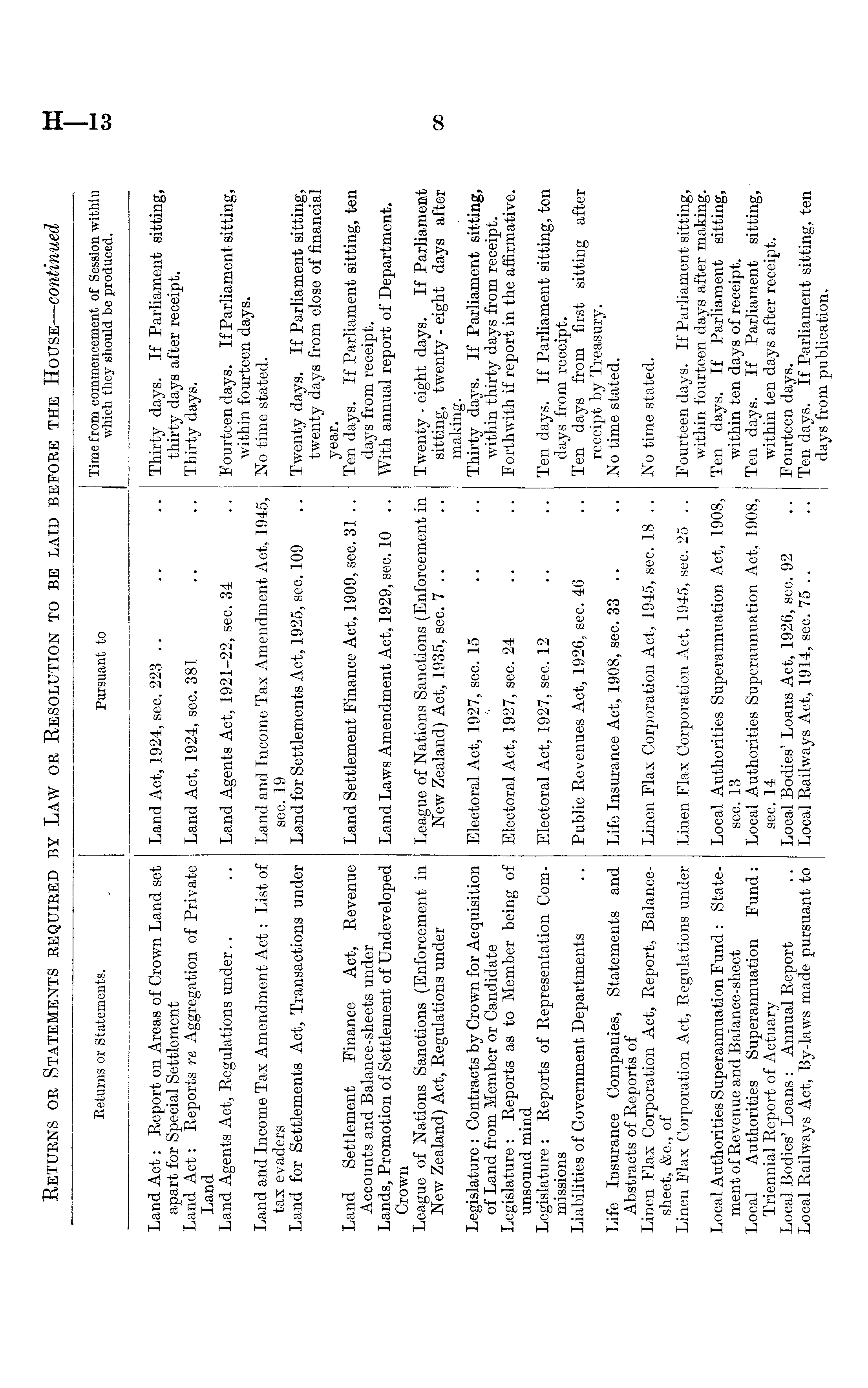 Returns or Statements. Pursuant to Time from commencement of Session within which they should be produced. Land Act: Report on Areas of Crown Land set Land Act, 1924, sec. 223 Thirty days. If Parliament sitting, apart for Special Settlement thirty days after receipt. Land Act: Reports re Aggregation of Private T.QTlfl Land Act, 1924, sec. 381 Thirty days. JL/CWlU Land Agents Act, Regulations under Land Agents Act, 1921-22, sec. 34 Fourteen days. If Parliament sitting, within fourteen days. Land and Income Tax Amendment Act: List of Land and Income Tax Amendment Act, 1945, No time stated. tax evaders sec. 19 Land for Settlements Act, Transactions under Land for Settlements Act, 1925, sec. 109 Twenty days. If Parliament sitting, twenty days from close of financial Land Settlement Finance Act, Revenue Land Settlement Finance Act, 1909, sec. 31 .. year. Ten days. If Parliament sitting, ten Accounts and Balance-sheets under days from receipt. Lands, Promotion of Settlement of Undeveloped Crrfxvtm Land Laws Amendment Act, 1929, sec. 10 .. With annual report of Department. viUWIl League of Nations Sanctions (Enforcement in League of Nations Sanctions (Enforcement in Twenty - eight days. If Parliament New Zealand) Act, Regulations under New Zealand) Act, 1935, sec. 7 .. sitting, twenty - eight days after making. Legislature: Contracts by Crown for Acquisition Electoral Act, 1927, sec. 15 Thirty days. If Parliament sitting, of Land from Member or Candidate * within thirty days from receipt. Legislature: Reports as to Member being of Electoral Act, 1927, sec. 24 Forthwith if report in the affirmative. unsound mind Legislature : Reports of Representation ComElectoral Act, 1927, sec. 12 Ten days. If Parliament sitting, ten missions days from receipt. Liabilities of Government Departments Public Revenues Act, 1926, sec. 46 Ten days from first sitting after receipt by Treasury. Life Insurance Companies, Statements and Life Insurance Act, 1908, sec. 33 .. No time stated. Abstracts of Reports of Linen Flax Corporation Act, Report, BalanceLinen Flax Corporation Act, 1945, sec. 18 .. No time stated. sheet, &c., of • Linen Flax Corporation Act, Regulations under Linen Flax Corporation Act, 1945, sec. 25 .. Fourteen days. If Parliament sitting, within fourteen days after making. Local Authorities Superannuation Fund : StateLocal Authorities Superannuation Act, 1908, Ten days. If Parliament sitting, ment of Revenue and Balance-sheet sec. 13 within ten days of receipt. Local Authorities Superannuation Fund: Local Authorities Superannuation Act, 1908, Ten days. If Parliament sitting, Triennial Report of Actuary sec. 14 within ten days after receipt. Local Bodies' Loans : Annual Report Local Bodies' Loans Act, 1926, sec. 92 Fourteen days. Local Railways Act, By-laws made pursuant to Local Railways Act, 1914, sec. 75 .. Ten days. If Parliament sitting, ten days from publication.