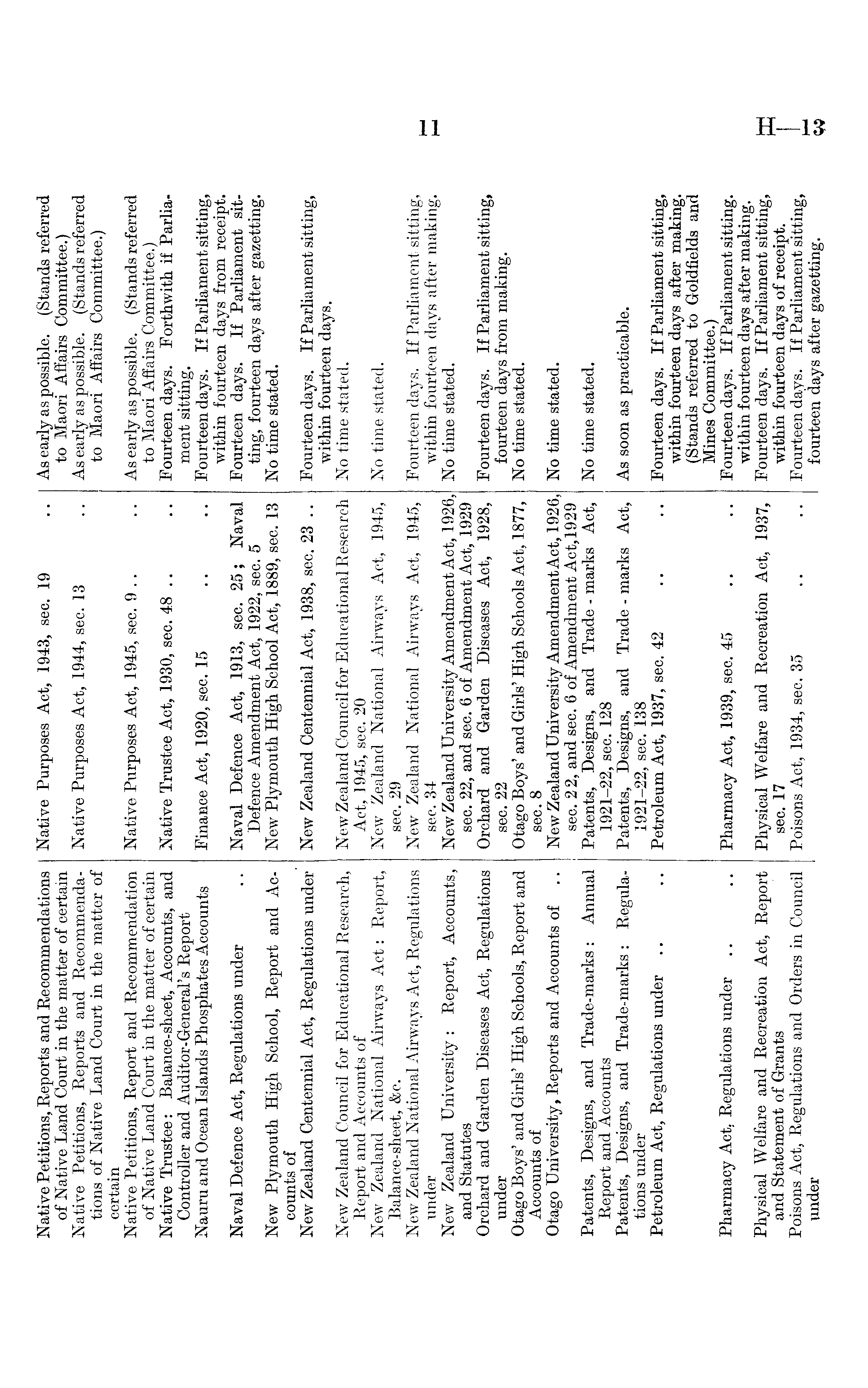 Native Petitions, Reports and Recommendations Native Purposes Act, 1943, sec. 19 .. As early as possible. (Stands referred of Native Land Court in the matter of certain to Maori Affairs Committee.) Native Petitions, Reports and Recommenda- Native Purposes Act, 1944, sec. 13 As early as possible. (Stands referred tions of Native Land Court in the matter of to Maori Affairs Committee.) certain Native Petitions, Report and Recommendation Native Purposes Act, 1945, sec. 9 .. .. As early as possible. (Stands referred of Native Land Court in the matter of certain to Maori Affairs Committee.) Native Trustee: Balance-sheet, Accounts, and Native Trustee Act, 1930, sec. 48 .. .. Fourteen days. Forthwith if ParliaController and Auditor-General's Report ment sitting. Nauru and Ocean Islands Phosphates Accounts Finance Act, 1920, sec. 15 .. .. Fourteen days. If Parliament sitting, within fourteen days from receipt. Naval Defence Act, Regulations under .. Naval Defence Act, 1913, sec. 25; Naval Fourteen days. If Parliament sitDefence Amendment Act, 1922, sec. 5 ting, fourteen days after gazetting. New Plymouth High School, Report and Ac- New Plymouth High School Act, 1889, sec. 13 No time stated, counts of New Zealand Centennial Act, Regulations under New Zealand Centennial Act, 1938, sec. 23 .. Fourteen days. If Parliament sitting, within fourteen days. New Zealand Council for Educational Research, New Zealand Council for Educational Research No time stated. Report and Accounts of Act, 1945, sec. 20 New Zealand National Airways Act: Report, New Zealand National Airways Act, 1945, No time stated. Balance-sheet, &c. sec. 29 New Zealand National Airways Act, Regulations New Zealand National Airways Act, 1945, Fourteen days. If Parliament sitting, under sec. 34 within fourteen days after making. New Zealand University: Report, Accounts, New Zealand University Amendment Act, 1926, No time stated. and Statutes sec. 22, and sec. 6 of Amendment Act, 1929 Orchard and Garden Diseases Act, Regulations Orchard and Garden Diseases Act, 1928, Fourteen days. If Parliament sitting, under sec. 22 fourteen days from making. Otago Boys' and Girls' High Schools, Report and Otago Boys' and Girls' High Schools Act, 1877, No time stated. Accounts of sec. 8 Otago University, Reports and Accounts of .. New Zealand University Amendment Act, 1926, No time stated. sec. 22, and sec. 6 of Amendment Act,1929 Patents, Designs, and Trade-marks: Annual Patents, Designs, and Trade - marks Act, No time stated. Report and Accounts 1921-22, sec. 128 Patents, Designs, and Trade-marks : Regula- Patents, Designs, and Trade - marks Act, As soon as practicable. tions under 1921-22, sec. 138 Petroleum Act, Regulations under .. .. Petroleum Act, 1937, sec. 42 .. .. Fourteen days. If Parliament sitting, within fourteen days after making. (Stands referred to Goldfields and Mines Committee.) Pharmacy Act. Regulations under .. .. Pharmacy Act, 1939, sec. 45 .. .. Fourteen days. If Parliament sitting. within fourteen days after making. Physical Welfare and Recreation Act, Report Physical Welfare and Recreation Act, 1937, Fourteen days. If Parliament sitting, and Statement of Grants sec. 17 within fourteen days of receipt. Poisons Act, Regulations and Orders in Council Poisons Act, 1934, sec. 35 .. .. Fourteen days. If Parliament sitting, under fourteen days after gazetting.