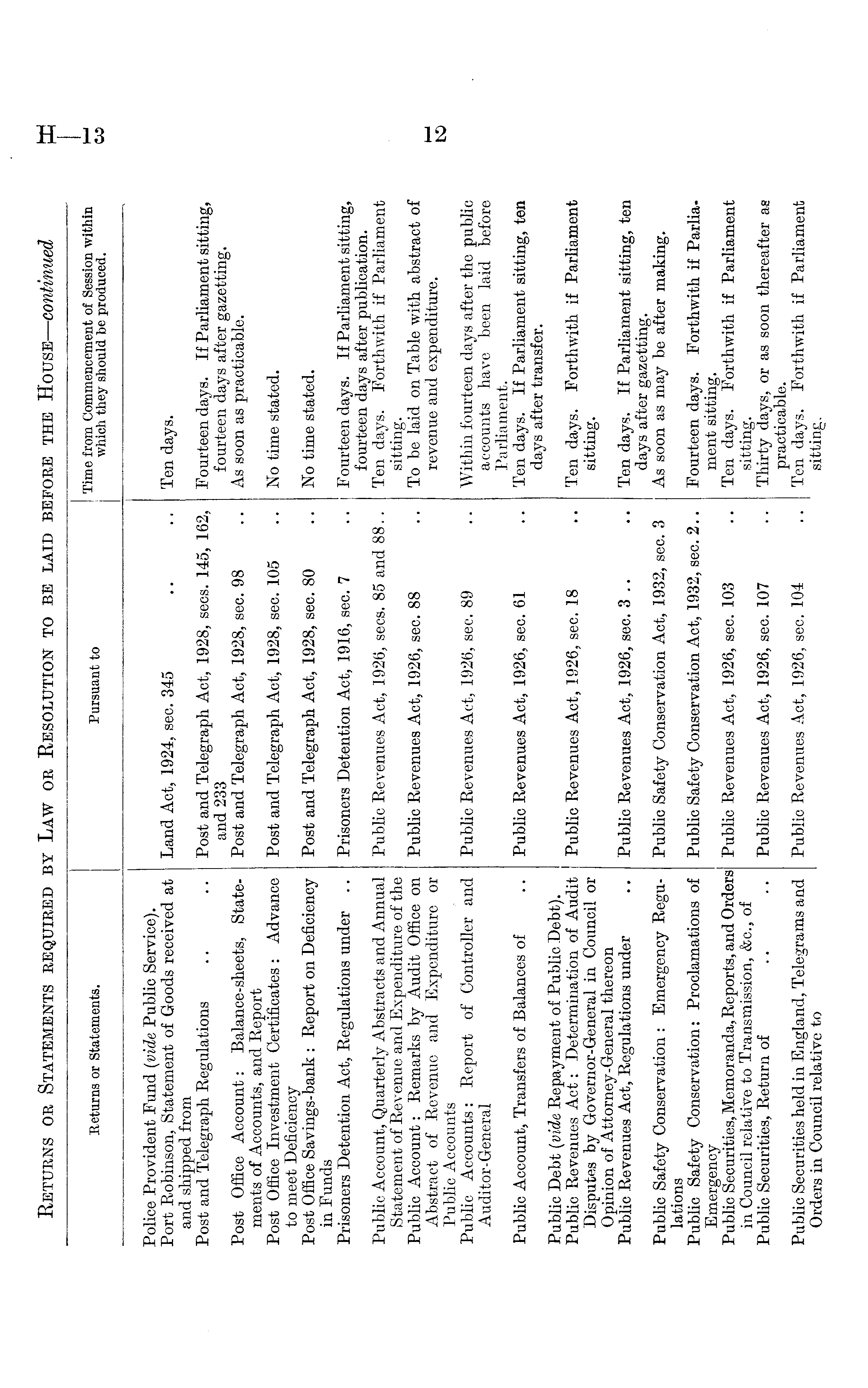 t,„„ . Time from Commencement of Session within Returns or Statements. Pursuant to which they should be produced> Police Provident Fund (vide Public Service). Port Robinson, Statement of Goods received at Land Act, 1924, sec. 345 .. .. Ten days, and shipped from Post and Telegraph Regulations .. .. Post and Telegraph Act, 1928, sees. 145, 162, Fourteen days. If Parliament sitting, and 233 fourteen days after gazetting. Post Office Account: Balance-sheets, State- Post and Telegraph Act, 1928, sec. 98 As soon as practicable, ments of Accounts, and Report Post Office Investment Certificates : Advance Post and Telegraph Act, 1928, sec. 105 .. No time stated, to meet Deficiency Post Office Savings-bank : Report on Deficiency Post and Telegraph Act, 1928, sec. 80 No time stated, in Funds Prisoners Detention Act, Regulations under .. Prisoners Detention Act, 1916, sec. 7 .. Fourteen days. If Parliament sitting, fourteen days after publication. Public Account, Quarterly Abstracts and Annual Public Revenues Act, 1926, sees. 85 and 88.. Ten days. Forthwith if Parliament Statement of Revenue and Expenditure of the sitting. Public Account: Remarks by Audit Office on Public Revenues Act, 1926, sec. 88 To be laid on Table with abstract of Abstract of Revenue and Expenditure or revenue and expenditure. Public Accounts Public Accounts: Report of Controller and Public Revenues Act, 1926, sec. 89 .. Within fourteen days after the public Auditor-General accounts have been laid before Parliament. Public Account, Transfers of Balances of .. Public Revenues Act, 1926, sec. 61 .. Ten days. If Parliament sitting, ten days after transfer. Public Debt (vide Repayment of Public Debt). Publio Revenues Act: Determination of Audit Public Revenues Act, 1926, sec. 18 .. Ten days. Forthwith if Parliament Disputes by Governor-General in Council or sitting. Opinion of Attorney-General thereon Public Revenues Act, Regulations under .. Public Revenues Act, 1926, sec. 3 .. .. Ten days. If Parliament sitting, ten days after gazetting. Public Safety Conservation : Emergency Regu- Public Safety Conservation Act, 1932, sec. 3 As soon as may be after making, lations Public Safety Conservation: Proclamations of Public Safety Conservation Act, 1932, sec. 2.. Fourteen days. Forthwith if ParliaEmergency ment sitting. Public Securities, Memoranda, Reports, and Orders Public Revenues Act, 1926, sec. 103 .. Ten days. Forthwith if Parliament in Council relative to Transmission, &c. s of sitting. Public Securities, Return of .. .. Public Revenues Act, 1926, sec. 107 .. Thirty days, or as soon thereafter as practicable. Public Securities held in England, Telegrams and Public Revenues Aot, 1926, sec. 104 .. Ten days. Forthwith if Parliament Orders in Council relative to sitting.
