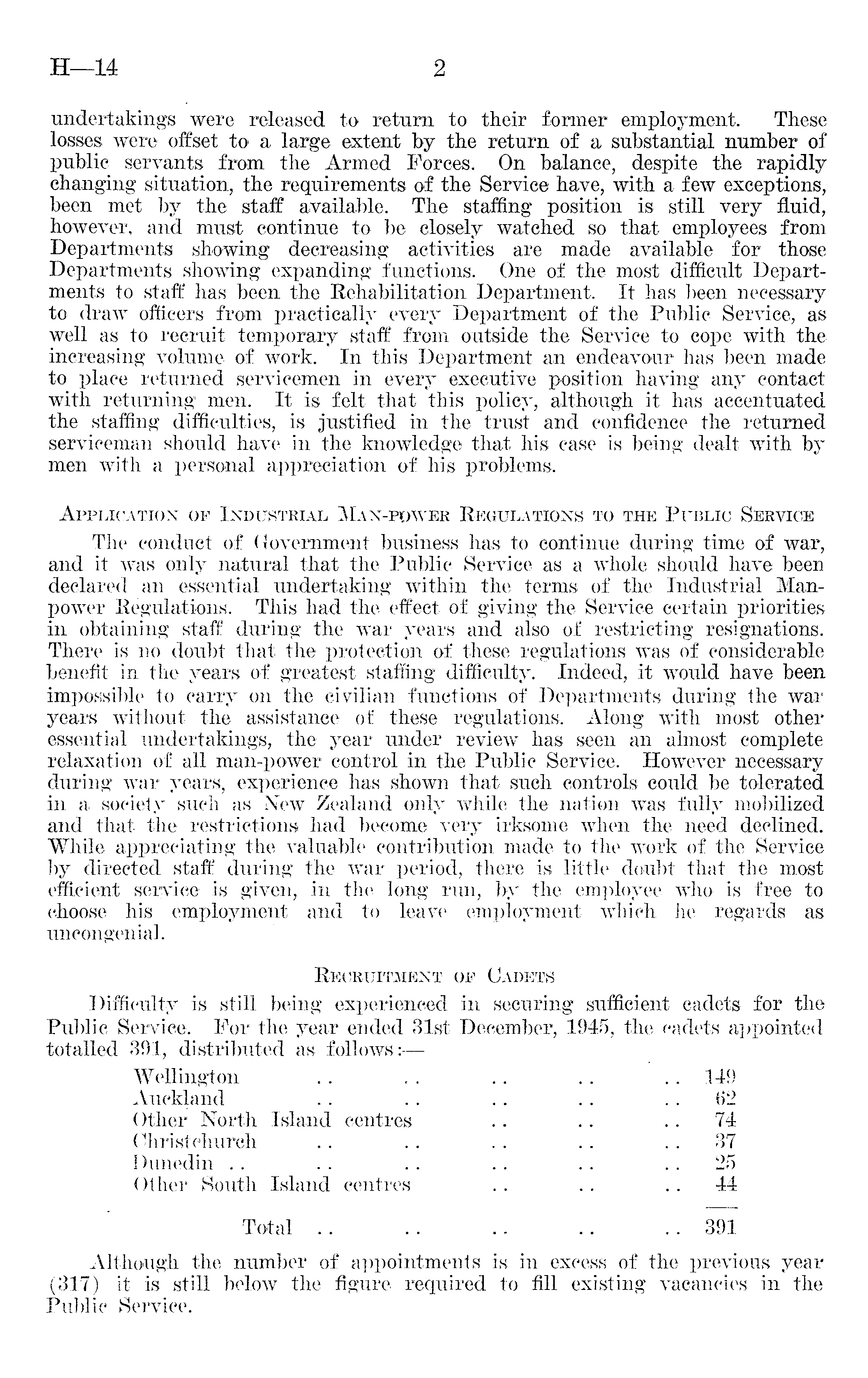 undertakings were released to return to their former employment. These losses were offset to a large extent by the return of a substantial number of public servants from the Armed Forces. On balance, despite the rapidly changing situation, the requirements of the Service have, with a few exceptions, been met by the staff available. The staffing position is still very fluid, however, and must continue to be closely watched so that employees from Departments showing decreasing activities are made available for those Departments showing expanding functions. One of the most difficult Departments to staff has been the Rehabilitation Department. It has been necessary to draw officers from practically every Department of the Public Service, as well as to recruit temporary staff from outside the Service to cope with the increasing volume of work. In this Department an endeavour has been made to place returned servicemen in every executive position having any contact with returning men. It is felt that this policy, although it has accentuated the staffing difficulties, is justified in the trust and confidence the returned serviceman should have in the knowledge that his case is being dealt with by men with a personal appreciation of his problems. Application of Industrial Man-power Regulations to the Public Service The conduct of Government business has to continue during time of war, and it was only natural that the Public Service as a whole should have been declared an essential- undertaking within the terms of the Industrial Manpower Regulations. This had the effect of giving the Service certain priorities in obtaining staff during the war years and also of restricting resignations. There is no doubt that the protection of these regulations was of considerable benefit in the years of greatest staffing difficulty. Indeed, it would have been impossible to carry on the civilian functions of Departments during the war years without the assistance of these regulations. Along with most other essential undertakings, the year under review has seen an almost complete relaxation of all man-power control in the Public Service. However necessary during war years, experience has shown that such controls could be tolerated in a society such as New Zealand only while the nation was fully mobilized and that the restrictions had become very irksome when the need declined. While appreciating the valuable contribution made to the work of the Service by directed staff during the war period, there is little doubt that the most efficient service is given, in the long run, by the employee who is free to choose his employment and to leave employment which he regards as uncongenial. Recruitment op Cadets Difficulty is still being experienced in securing sufficient cadets for the Public Service. For the year ended 31st December, 1945, the cadets appointed totalled 391, distributed as follows: Wellington .. . . .. .. .. 149 Auckland . . . . . . .. 62 Other North Island centres .. . . . . 74 Christchurch .. . . . . .. 37 Dunedin . . . . . . . . . . ..25 Other South Island centres . . .. 44 Total . . .. .. .. .. 391 Although the number of appointments is in excess of the previous year (317) it is still below the figure required to fill existing vacancies in the Public Service.
