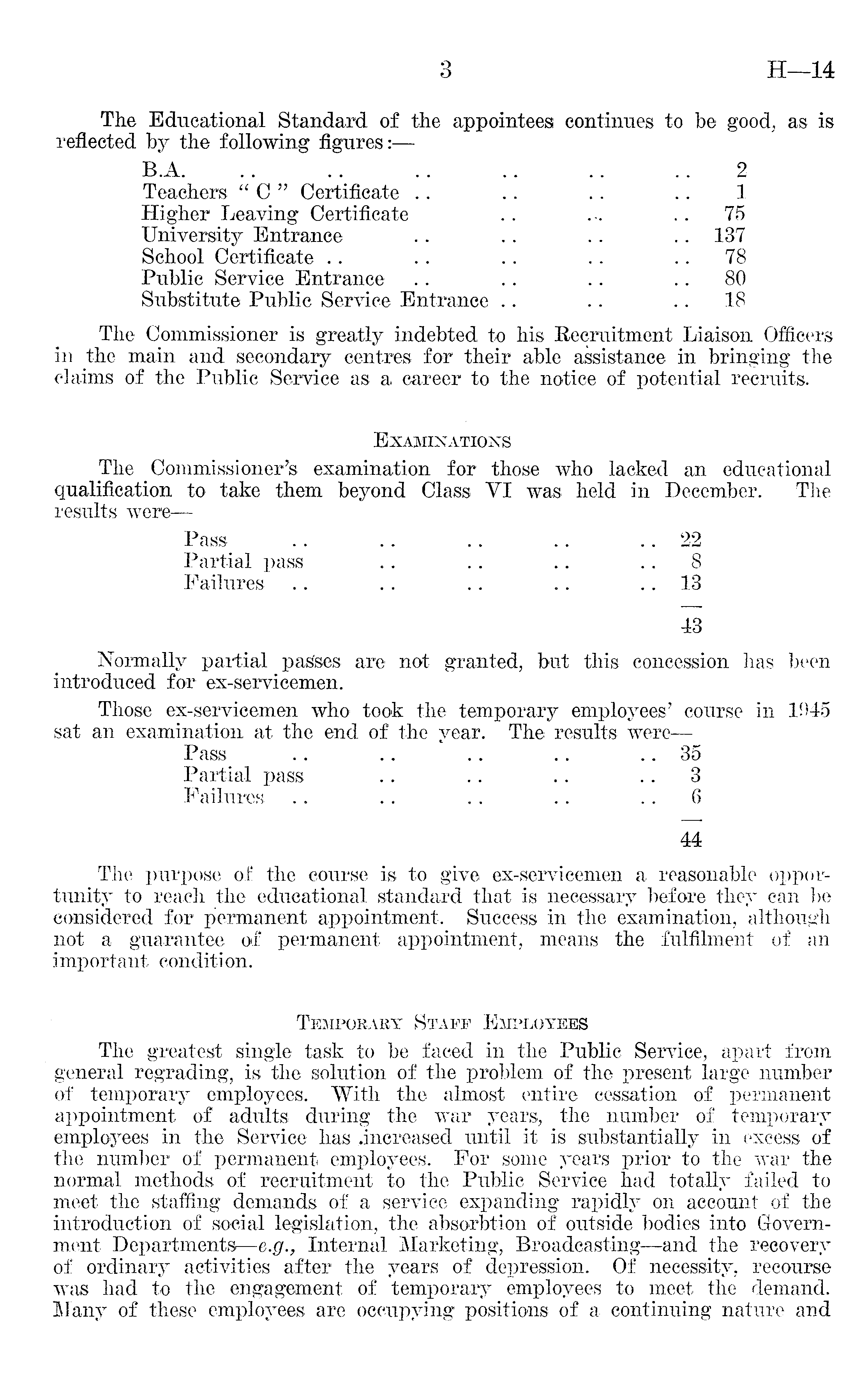 The Educational Standard of the appointees continues to be good, as is reflected by the following figures:— B.A. .. .. .. .. .. .. 2 Teachers " C " Certificate .. .. . . .. 1 Higher Leaving Certificate .. ... .. 75 University Entrance .. .. . . .. 137 School Certificate .. . . .. .. .. 78 Public Service Entrance .. .. .. 80 Substitute Public Service Entrance .. .. .. 18 The Commissioner is greatly indebted to his Recruitment Liaison Officers in the main and secondary centres for their able assistance in bringing the claims of the Public Service as a career to the notice of potential recruits. Examinations The Commissioner's examination for those who lacked an educational qualification to take them beyond Class VI was held in December. The results were — Pass .. .. .. .. .. 22 Partial pass .. .. .. 8 Failures .. .. .. .. .. 13 43 Normally partial passes are not granted, but this concession has been introduced for ex-servicemen. Those ex-servicemen who took the temporary employees' course in 1945 sat an examination at the end of the year. The results were— Pass .. .. .. .. .. 35 Partial pass .. .. ' .. .. 3 Failures .. . . .. .. . . 6 44 The purpose of the course is to give ex-servicemen a reasonable opportunity to reach the educational standard that is necessary before they can be considered for permanent appointment. Success in the examination, although not a guarantee of permanent appointment, means the fulfilment of an important condition. Temporary Staff Employees The greatest single task to be faced in the Public Service, apart from general regrading, is the solution of the problem of the present large number of temporary employees. With the almost entire cessation of permanent appointment of adults during the war years, the number of temporary employees in the Service has until it is substantially in excess of the number of permanent employees. For some years prior to the war the normal methods of recruitment to the Public Service had totally failed to meet the staffing demands of a service expanding rapidly on account of the introduction of social legislation, the absorbtion of outside bodies into Government Departments—e.g., Internal Marketing, Broadcasting—and the recovery of ordinary activities after the years of depression. Of necessity, recourse was had to the engagement of temporary employees to meet the demand. Many of these employees are occupying positions of a continuing nature and