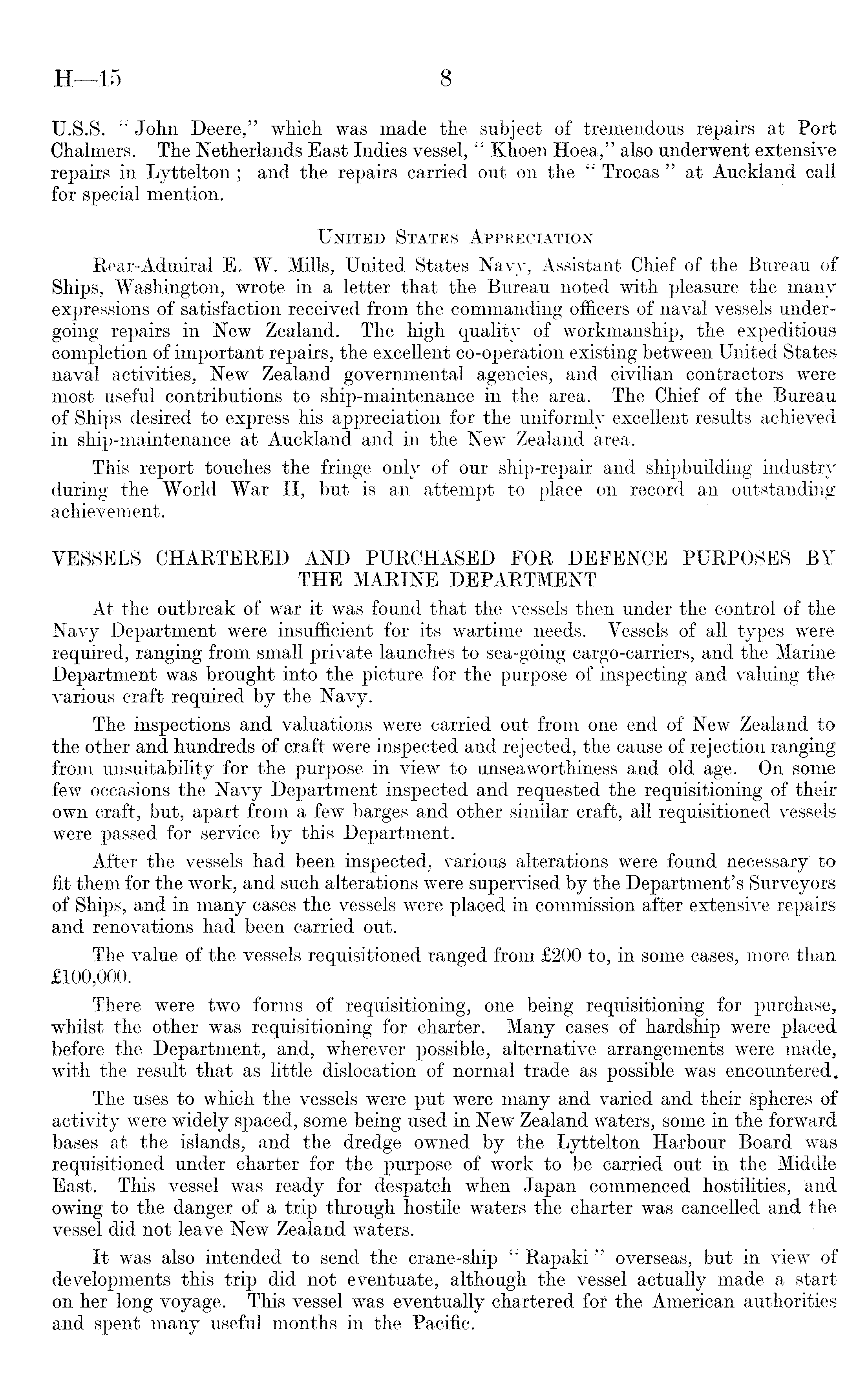 U.S.S. " John Deere," which was made the subject of tremendous repairs at Port Chalmers. The Netherlands East Indies vessel, " Khoen Hoea," also underwent extensive repairs in Lyttelton ; and the repairs carried out on the " Trocas " at Auckland call for special mention. United States Appreciation Rear-Admiral E. W. Mills, United States Navy, Assistant Chief of the Bureau of Ships, Washington, wrote in a letter that the Bureau noted with pleasure the many expressions of satisfaction received from the commanding officers of naval vessels undergoing repairs in New Zealand. The high quality of workmanship, the expeditious completion of important repairs, the excellent co-operation existing between United States naval activities, New Zealand governmental agencies, and civilian contractors were most useful contributions to ship-maintenance in the area. The Chief of the Bureau of Ships desired to express his appreciation for the uniformly excellent results achieved in ship-maintenance at Auckland and in the New Zealand area. This report touches the fringe only of our ship-repair and shipbuilding industry during the World War 11, but is an attempt to place on record an outstanding achievement. VESSELS CHARTERED AND PURCHASED FOR DEFENCE PURPOSES BY THE MARINE DEPARTMENT At the outbreak of war it was found that the vessels then under the control of the Navy Department were insufficient for its wartime needs. Vessels of all types were required, ranging from small private launches to sea-going cargo-carriers, and the Marine Department was brought into the picture for the purpose of inspecting and valuing the various craft required by the Navy. The inspections and valuations were carried out from one end of New Zealand to the other and hundreds of craft were inspected and rejected, the cause of rejection ranging from unsuitability for the purpose in view to unseaworthiness and old age. On some few occasions the Navy Department inspected and requested the requisitioning of their own craft, but, apart from a few barges and other similar craft, all requisitioned vessels were passed for service by this Department. After the vessels had been inspected; various alterations were found necessary to fit them for the work, and such alterations were supervised by the Department's Surveyors of Ships, and in many cases the vessels were placed in commission after extensive repairs and renovations had been carried out. The value of the vessels requisitioned ranged from £2OO to, in some cases, more than £lOO,OOO. There were two forms of requisitioning, one being requisitioning for purchase, whilst the other was requisitioning for charter. Many cases of hardship were placed before the Department, and, wherever possible, alternative arrangements were made, with the result that as little dislocation of normal trade as possible was encountered. The uses to which the vessels were put were many and varied and their spheres of activity were widely spaced, some being used in New Zealand waters, some in the forward bases at the islands, and the dredge owned by the Lyttelton Harbour Board was requisitioned under charter for the purpose of work to be carried out in the Middle East. This vessel was ready for despatch when Japan commenced hostilities, and owing to the danger of a trip through hostile waters the charter was cancelled and the vessel did not leave New Zealand waters. It was also intended to send the crane-ship " Rapaki " overseas, but in view of developments this trip did not eventuate, although the vessel actually made a start on her long voyage. This vessel was eventually chartered for the American authorities and spent many useful months in the Pacific.