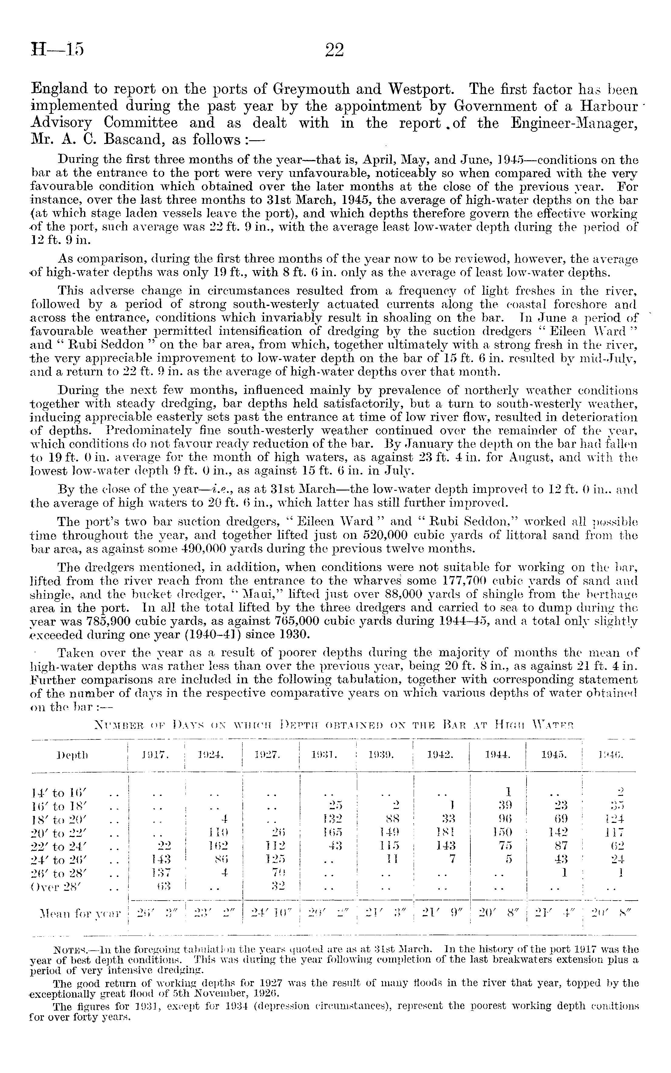 England to report on the ports of Greymouth and Westport. The first factor has been implemented during the past year by the appointment by Government of a Harbour Advisory Committee and as dealt with in the report. of the Engineer-Manager, Mr. A. C. Bascand, as follows: During the first three months of the year —that is, April, May, and June, 1945—conditions on the bar at the entrance to the port were very unfavourable, noticeably so when compared with the very favourable condition which obtained over the later months at the close of the previous year. For instance, over the last three months to 31st March, 1945, the average of high-water depths on the bar <at which stage laden vessels leave the port), and which depths therefore govern the effective working -of the port, such average was 22 ft. 9 in., with the average least low-water depth during the period of 12 ft. 9 in. As comparison, during the first three months of the year now to be reviewed, however, the average of high-water depths was only 19 ft., with 8 ft. 6 in. only as the average of least low-water depths. This adverse change in circumstances resulted from a frequency of light freshes in the river, followed by a period of strong south-westerly actuated currents along the coastal foreshore and across the entrance, conditions which invariably result in shoaling on the bar. In June a period of favourable weather permitted intensification of dredging by the suction dredgers " Eileen Ward " and " Rubi Seddon " on the bar area, from which, together ultimately with a strong fresh in the river, -the very appreciable improvement to low-water depth on the bar of 15 ft. 6 in. resulted by mid-July, and a return to 22 ft. 9 in. as the average of high-water depths over that month. During the next few months, influenced mainly by prevalence of northerly weather conditions together with steady dredging, bar depths held satisfactorily, but a turn to south-westerly weather, inducing appreciable easterly sets past the entrance at time of low river flow, resulted in deterioration •of depths. Predominately fine south-westerly weather continued over the remainder of the year, which conditions do not favour ready reduction of the bar. By January the depth on the bar had fallen to 19 ft. 0 in. average for the month of high waters, as against 23 ft. 4 in. for August, and with the lowest low-water depth 9 ft. 0 in., as against 15 ft. 6 in. in July. By the close of the year—i.e., as at 31st March —the low-water depth improved to 12 ft. 0 in., and the average of high waters to 20 ft. 6 in., which latter has still further improved. The port's two bar suction dredgers, " Eileen Ward " and " Rubi Seddon," worked all possible time throughout the year, and together lifted just on 520,000 cubic yards of littoral sand from the bar area, as against some 490,000 yards during the previous twelve months. The dredgers mentioned, in addition, when conditions were not suitable for working on the bar, lifted from the river reach from the entrance to the wharves some 177,700 cubic yards of sand and shingle, and the bucket dredger, " Maui," lifted just over 88,000 yards of shingle from the berthage area in the port. In all the total lifted by the three dredgers and carried to sea to dump during the year was 785,900 cubic yards, as against 765,000 cubic yards during 1944-45, and a total only slightly exceeded during one year (1940-41) since 1930. Taken over the year as a result of poorer depths during the majority of months the mean of high-water depths was rather less than over the previous year, being 20 ft. 8 in., as against 21 ft. 4 in. Further comparisons are included in the following tabulation, together with corresponding statement of the number of days in the respective comparative years on which various depths of water obtained on the bar :