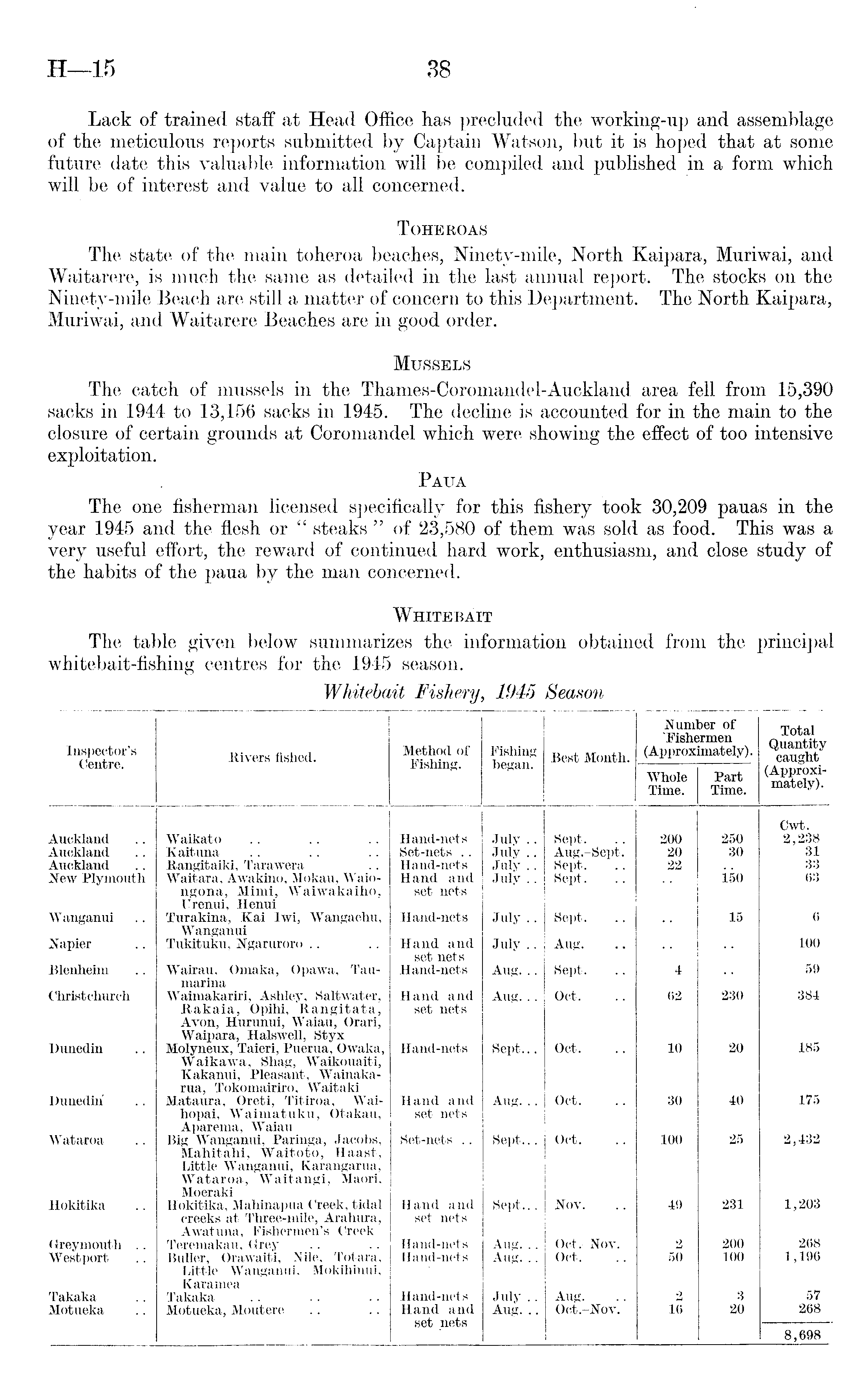 Lack of trained staff at Head Office has precluded the working-up and assemblage of the meticulous reports submitted by Captain Watson, but it is hoped that at some future date this valuable information will be compiled and published in a form which will be of interest and value to all concerned. Toheroas The state of the main toheroa beaches, Ninety-mile, North Kaipara, Muriwai, and Waitarere, is much the same as detailed in the last annual report. The stocks on the Ninety-mile Beach are still a matter of concern to this Department. The North Kaipara, Muriwai, and Waitarere Beaches are in good order. Mussels The catch of mussels in the Thames-Coromandel-Auckland area fell from 15,390 sacks in 1944 to 13,156 sacks in 1945. The decline is accounted for in the main to the closure of certain grounds at Coromandel which were showing the effect of too intensive exploitation. Paua The one fisherman licensed specifically for this fishery took 30,209 pauas in the year 1945 and the flesh or " steaks " of 23,580 of them was sold as food. This was a very useful effort, the reward of continued hard work, enthusiasm, and close study of the habits of the paua by the man concerned. Whitebait The table given below summarizes the information obtained from the principal whitebait-fishing centres for the 1945 season.