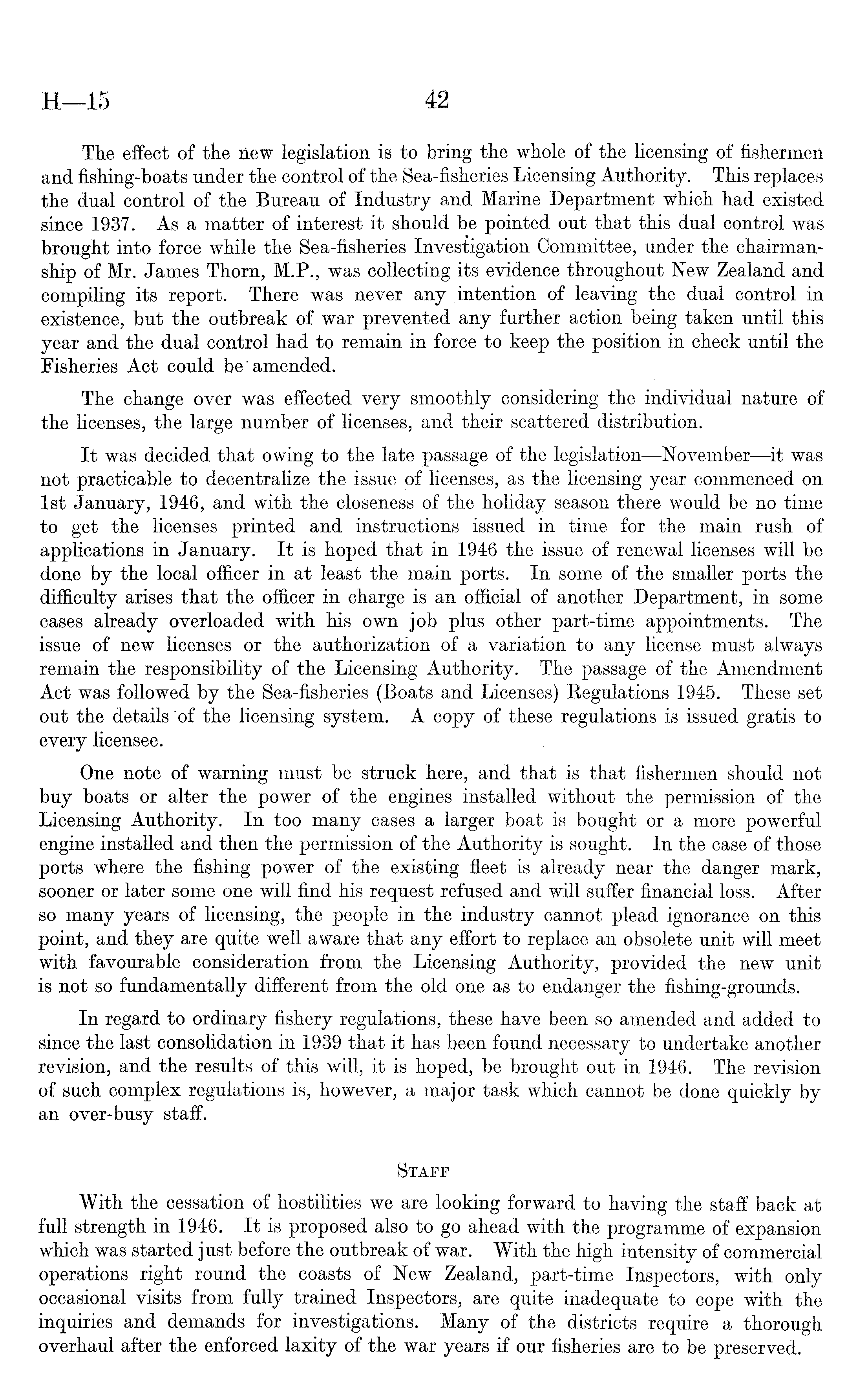 The effect of the new legislation is to bring the whole of the licensing of fishermen and fishing-boats under the control of the Sea-fisheries Licensing Authority. This replaces the dual control of the Bureau of Industry and Marine Department which had existed since 1937. As a matter of interest it should be pointed out that this dual control was brought into force while the Sea-fisheries Investigation Committee, under the chairmanship of Mr. James Thorn, M.P., was collecting its evidence throughout New Zealand and compiling its report. There was never any intention of leaving the dual control in existence, but the outbreak of war prevented any further action being taken until this year and the dual control had to remain in force to keep the position in check until the Fisheries Act could be amended. The change over was effected very smoothly considering the individual nature of the licenses, the large number of licenses, and their scattered distribution. It was decided that owing to the late passage of the legislation —November —it was not practicable to decentralize the issue of licenses, as the licensing year commenced on Ist January, 1946, and with the closeness of the holiday season there would be no time to get the licenses printed and instructions issued in time for the main rush of applications in January. It is hoped that in 1946 the issue of renewal licenses will be done by the local officer in at least the main ports. In some of the smaller ports the difficulty arises that the officer in charge is an official of another Department, in some cases already overloaded with his own job plus other part-time appointments. The issue of new licenses or the authorization of a variation to any license must always remain the responsibility of the Licensing Authority. The passage of the Amendment Act was followed by the Sea-fisheries (Boats and Licenses) Regulations 1945. These set out the details of the licensing system. A copy of these regulations is issued gratis to every licensee. One note of warning must be struck here, and that is that fishermen should not buy boats or alter the power of the engines installed without the permission of the Licensing Authority. In too many cases a larger boat is bought or a more powerful engine installed and then the permission of the Authority is sought. In the case of those ports where the fishing power of the existing fleet is already near the danger mark, sooner or later some one will find his request refused and will suffer financial loss. After so many years of licensing, the people in the industry cannot plead ignorance on this point, and they are quite well aware that any effort to replace an obsolete unit will meet with favourable consideration from the Licensing Authority, provided the new unit is not so fundamentally different from the old one as to endanger the fishing-grounds. In regard to ordinary fishery regulations, these have been so amended and added to since the last consolidation in 1939 that it has been found necessary to undertake another revision, and the results of this will, it is hoped, be brought out in 1946. The revision of such complex regulations is, however, a major task which cannot be done quickly by an over-busy staff. Staff With the cessation of hostilities we are looking forward to having the staff back at full strength in 1946. It is proposed also to go ahead with the programme of expansion which was started just before the outbreak of war. With the high intensity of commercial operations right round the coasts of New Zealand, part-time Inspectors, with only occasional visits from fully trained Inspectors, are quite inadequate to cope with the inquiries and demands for investigations. Many of the districts require a thorough overhaul after the enforced laxity of the war years if our fisheries are to be preserved.