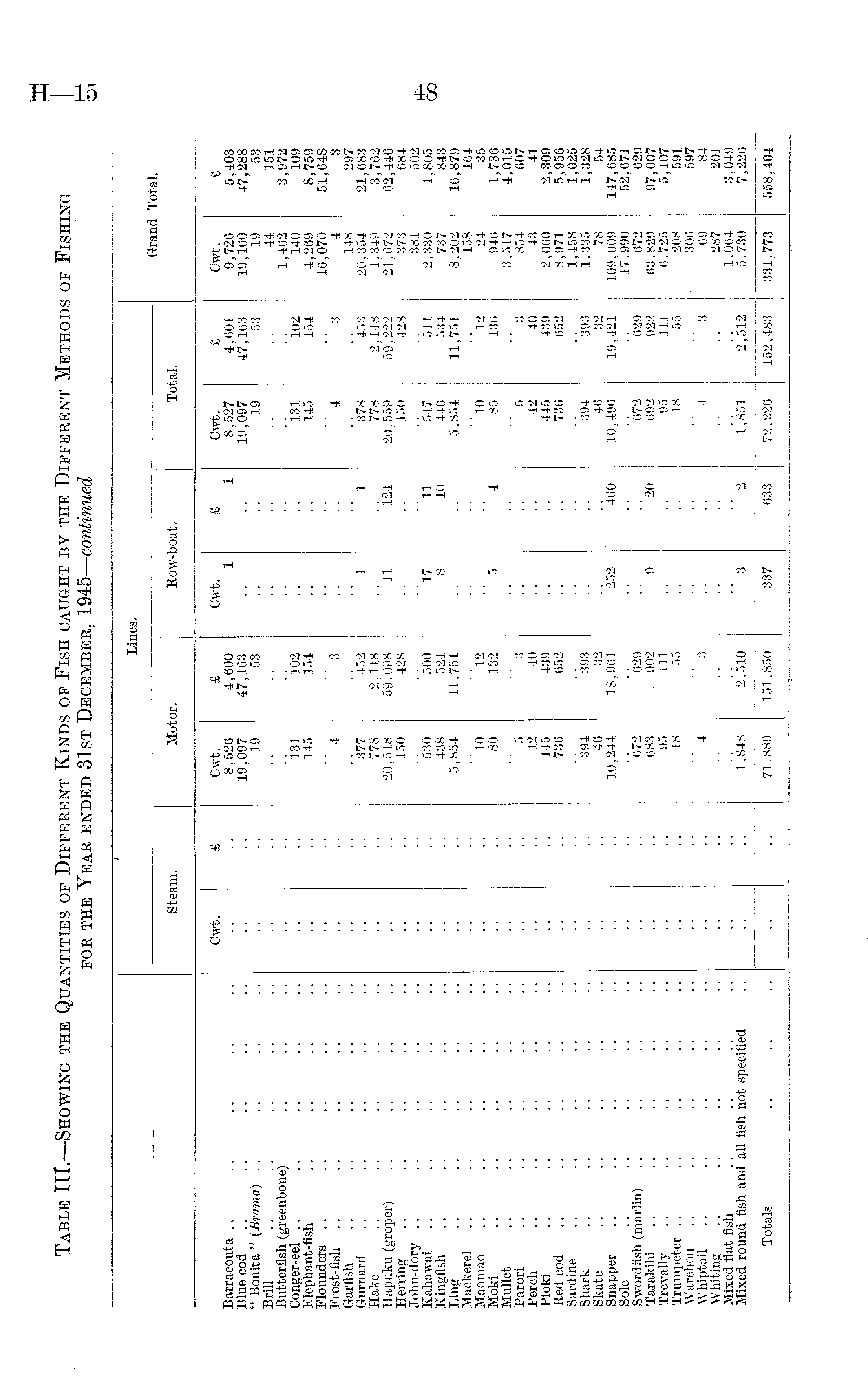 Table III.—Showing the Quantities of Different Kinds of Fish caught by the Different Methods of Fishing for the Year ended 31st December, 1945—continued