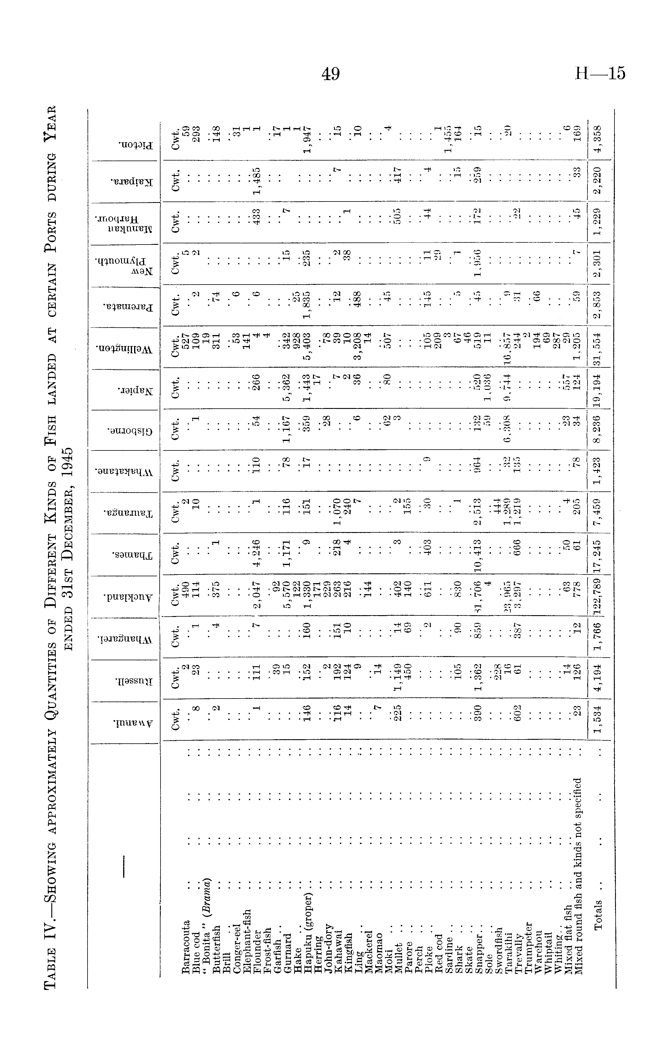 Table IV.—Showing approximately Quantities of Different Kinds of Fish landed at certain Ports during Year ended 31st December, 1945