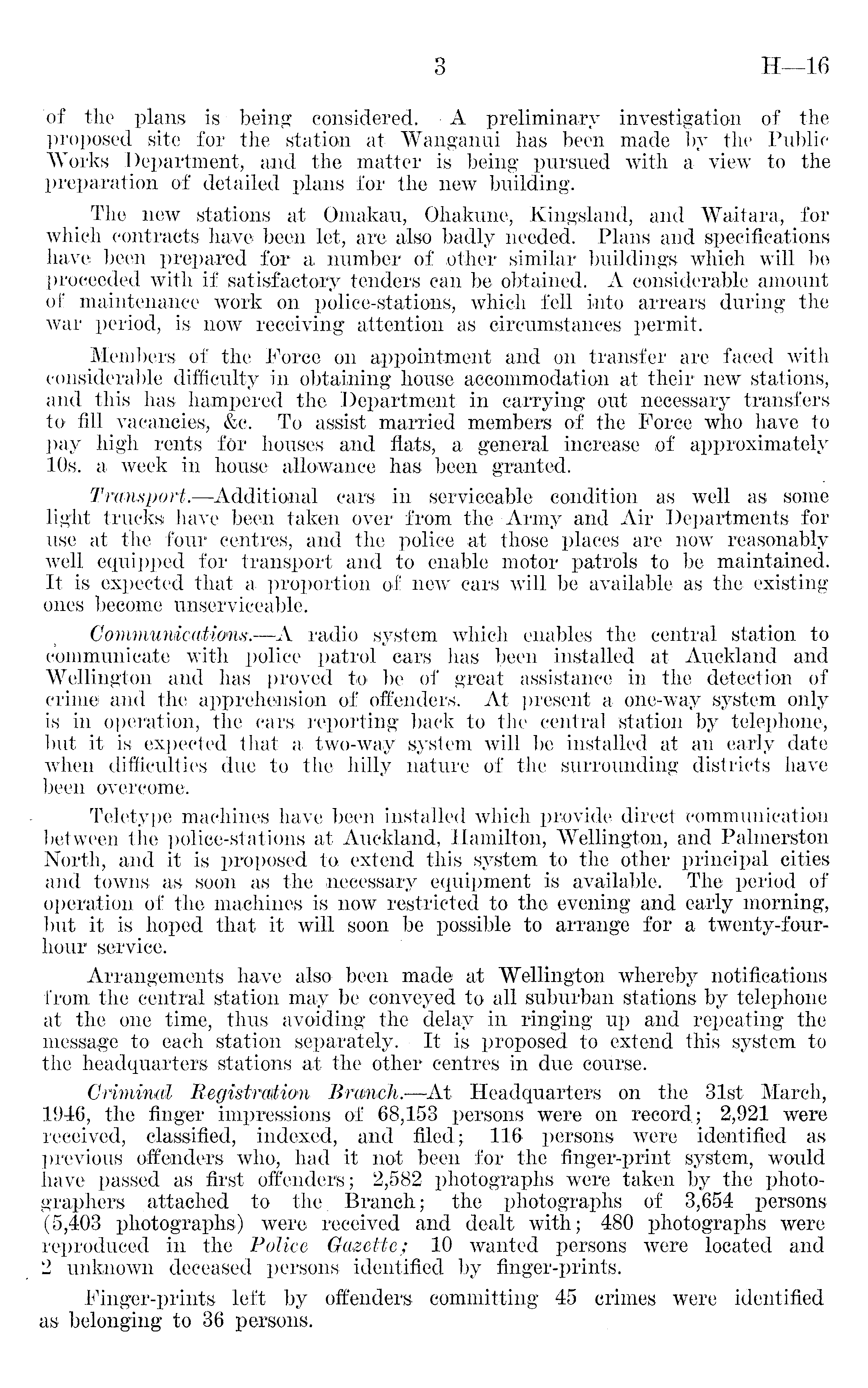 of the plans is being considered. A preliminary investigation of the proposed site for the station at Wanganui has been made by the Public Works Department, and the matter is being pursued with a view to the preparation of detailed plans for the new building. The new stations at Omakau, Ohakune, Kingsland, and Waitara, for which contracts have been let, are also badly needed. Plans and specifications have been prepared for a number of other similar buildings which will be proceeded with if satisfactory tenders can be obtained. A considerable amount of maintenance work on police-stations, which fell into arrears during the war period, is now receiving attention as circumstances permit. Members of the Force on appointment and on transfer are faced with considerable difficulty in obtaining house accommodation at their new stations, and this has hampered the Department in carrying out necessary transfers to fill vacancies, &c. To assist married members of the Force who have to pay high rents for houses and flats, a general increase of approximately 10s. a week in house allowance has been granted. Transport.—Additional cars in serviceable condition as well as some light trucks have been taken over from the Army and Air Departments for use at the four centres, and the police at those places are now reasonably well equipped for transport and to enable motor patrols to be maintained. It is expected that a proportion of new cars will be available as the existing ones become unserviceable. Communications.—A radio system which enables the central station to communicate with police patrol cars has been installed at Auckland and Wellington and has proved to be of great assistance in the detection of crime and the apprehension of offenders. At present a one-way system only is in operation, the cars reporting back to the central station by telephone, but it is expected that a two-way system will be installed at an early date when difficulties due to the hilly nature of the surrounding districts have been overcome. Teletype machines have been installed which provide direct communication between the police-stations at Auckland, Hamilton, Wellington, and Palmerston North, and it is proposed to extend this system to the other principal cities and towns as soon as the necessary equipment is available. The period of operation of the machines is now restricted to the evening and early morning, but it is hoped that it will soon be possible to arrange for a twenty-four-hour service. Arrangements have also been made at Wellington whereby notifications from the central station may be conveyed to all suburban stations by telephone at the one time, thus avoiding the delay in ringing up and repeating the message to each station separately. It is proposed to extend this system to the headquarters stations at the other centres in due course. Criminal Registration Branch.—At Headquarters on the 31st March, 1946, the finger impressions of 68,153 persons were on record; 2,921 were received, classified, indexed, and filed; 116 persons were identified as previous offenders who, had it not been for the finger-print system, would have passed as first offenders; 2,582 photographs were taken by the photographers attached to the Branch; the photographs of 3,654 persons (5,403 photographs) were received and dealt with; 480 photographs were reproduced in the Police Ga&eirte; 10 wanted persons were located and 2 unknown deceased persons identified by finger-prints. Finger-prints left by offenders committing 45 crimes were identified as belonging to 36 persons.