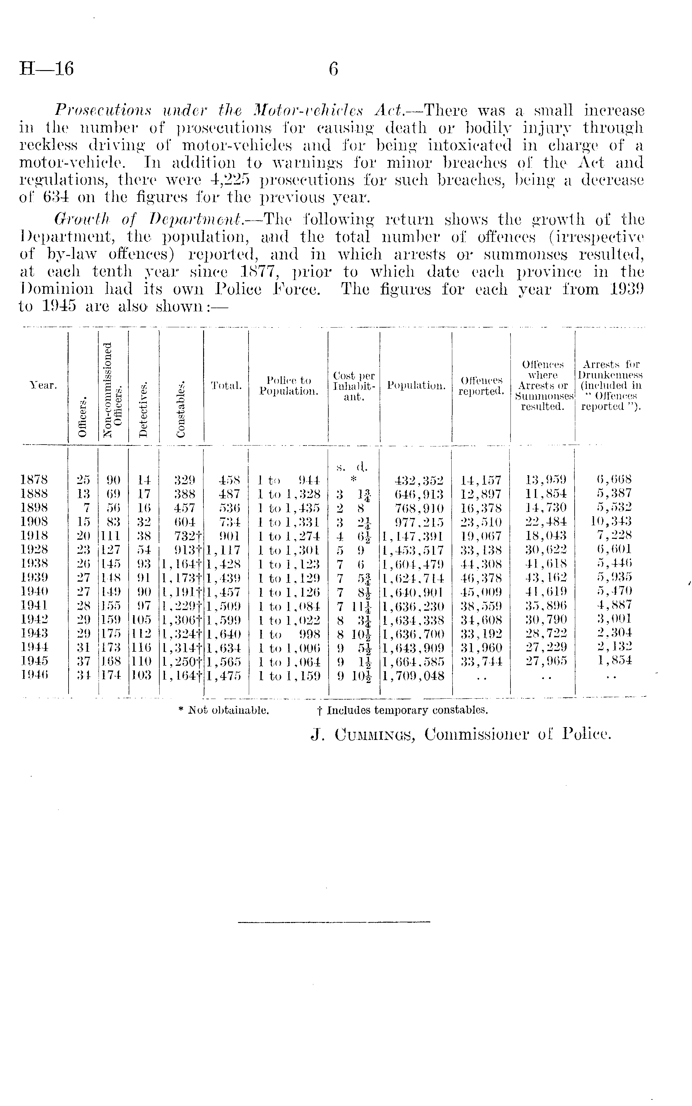 Prosecutions under the Motor-vehicles Act.—There was a small increase in the number of prosecutions for causing death or bodily injury through reckless driving of motor-vehicles and for being intoxicated in charge of a motor-vehicle. In addition to warnings for minor breaches of the Act and regulations, there were 4,225 prosecutions for such breaches, being a decrease of 634 on the figures for the previous year. Growth of Department.—The following return shows the growth of the Department, the population, and the total number of offences (irrespective of by-law offences) reported, and in which arrests or summonses resulted, at each tenth year since 1877, prior to which date each province in the Dominion had its own Police Force. The figures for each year from 1939 to 1945 are also shown:—