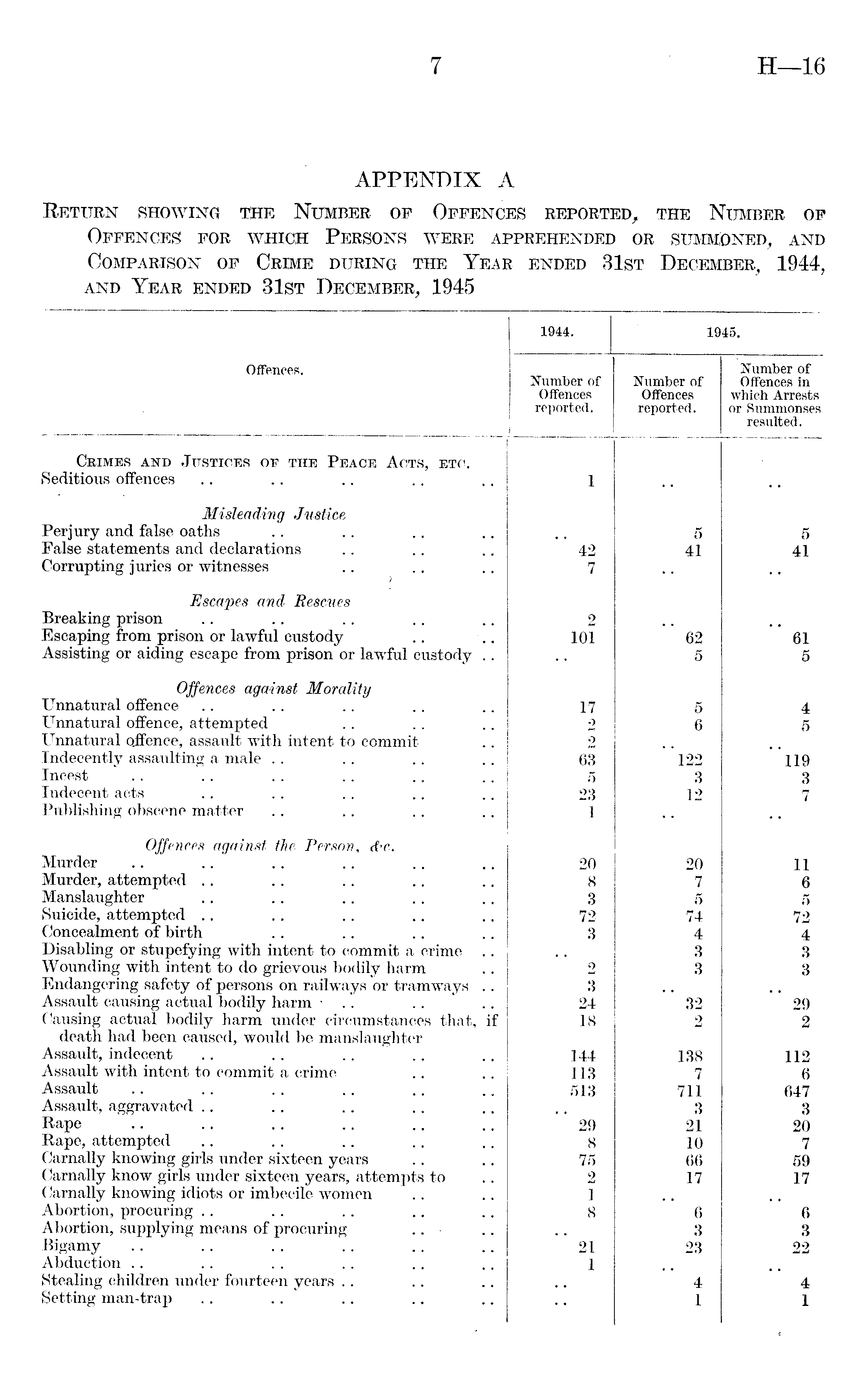APPENDIX A Return showing the Number of Offences reported, the Number of Offences for which Persons were apprehended or summoned, and Comparison of Crime during the Year ended 31st December, 1944, and Year ended 31st December, 1945