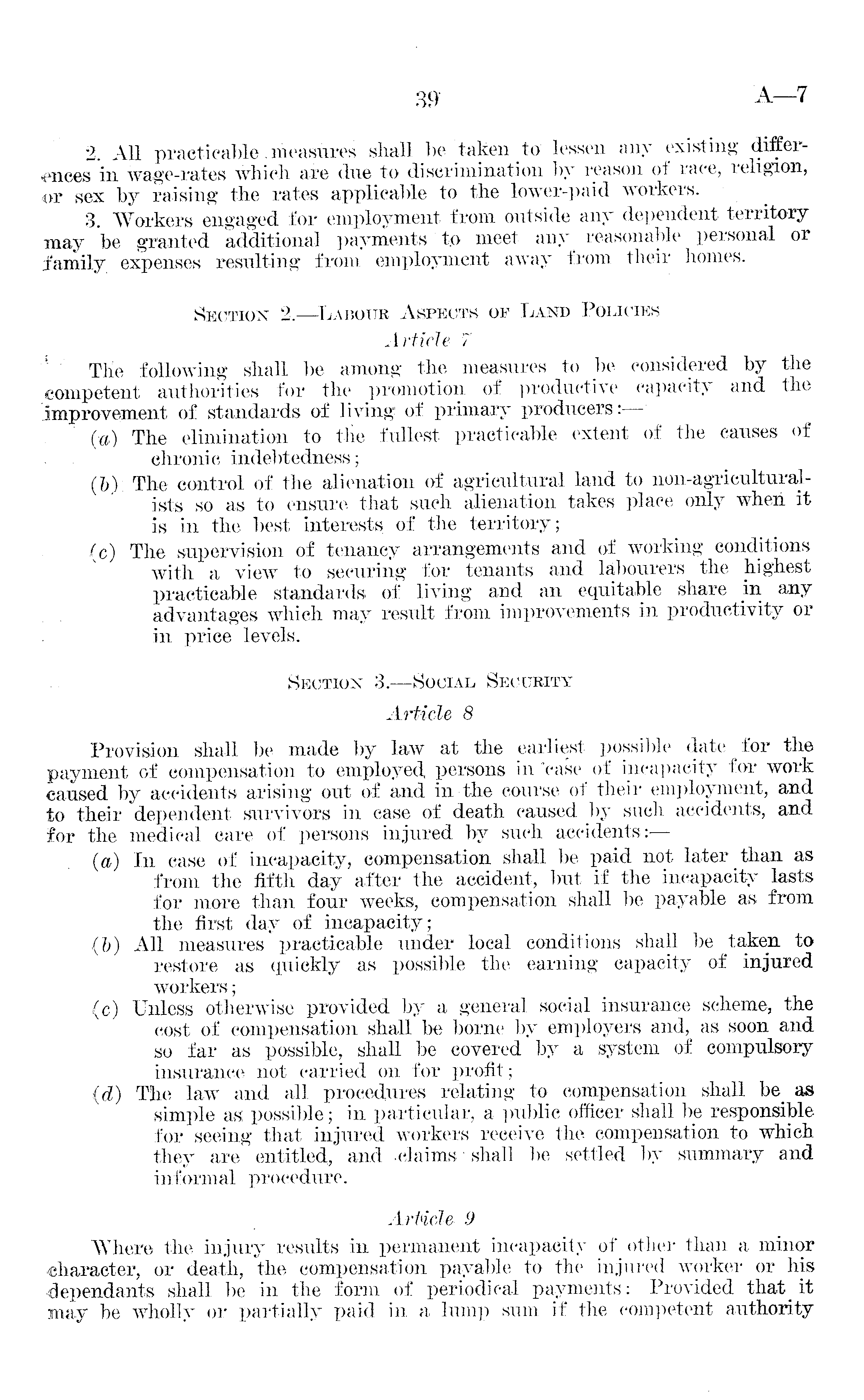 2. All practicable measures shall be taken to lessen any existing differences in wage-rates which are due to discrimination by reason of race, religion, or sex by raising the rates applicable to the lower-paid workers. 3. "Workers engaged for employment from outside any dependent territory may be granted additional payments to meet any reasonable personal or family expenses resulting from employment away from their homes. Section 2.—Labour Aspects of Land Policies Article 7 Tlie following shall be among the measures to be considered by the competent authorities for the promotion of productive capacity and the improvement of standards of living of primary producers : («) The elimination to the fullest practicable extent of the causes of chronic indebtedness; (b) The control of the alienation of agricultural land to non-agricultural-ists so as to ensure that such alienation takes place only when it is in the best interests of the territory; (c) The supervision of tenancy arrangements and of working conditions with a view to securing for tenants and labourers the highest practicable standards of living and an equitable share in any advantages which may result from improvements in productivity or in price levels. Section 3.—Social Security Article 8 Provision shall be made by law at the earliest possible date for the payment of compensation to employed persons in 'case of incapacity for work caused by accidents arising out of and in the course of their employment, and to their dependent survivors in case of death caused by such accidents, and for the medical care of persons injured by such accidents: — (a) In case of incapacity, compensation shall be paid not later than as from the fifth day after the accident, but if the incapacity lasts for more than four weeks, compensation shall be payable as from the first day of incapacity; (b) All measures practicable under local conditions shall be taken to restore as quickly as possible the earning capacity of injured workers; (c) Unless otherwise provided by a general social insurance scheme, the cost of compensation shall be borne by employers and, as soon and so far as possible, shall be covered by a system of compulsory insurance not carried on for profit; (d) T!he law and all procedures relating to compensation shall be as simple as possible; in particular, a public officer shall be responsible for seeing that injured workers receive the compensation to which they are entitled, and .claims • shall be settled by summary and informal procedure. Article* 9 Where the injury results in permanent incapacity of other than a minor character, or death, the compensation payable to the injured worker or his dependants shall be in the form of periodical payments: Provided that_ it may be wholly or partially paid in a lump sum if the competent authority
