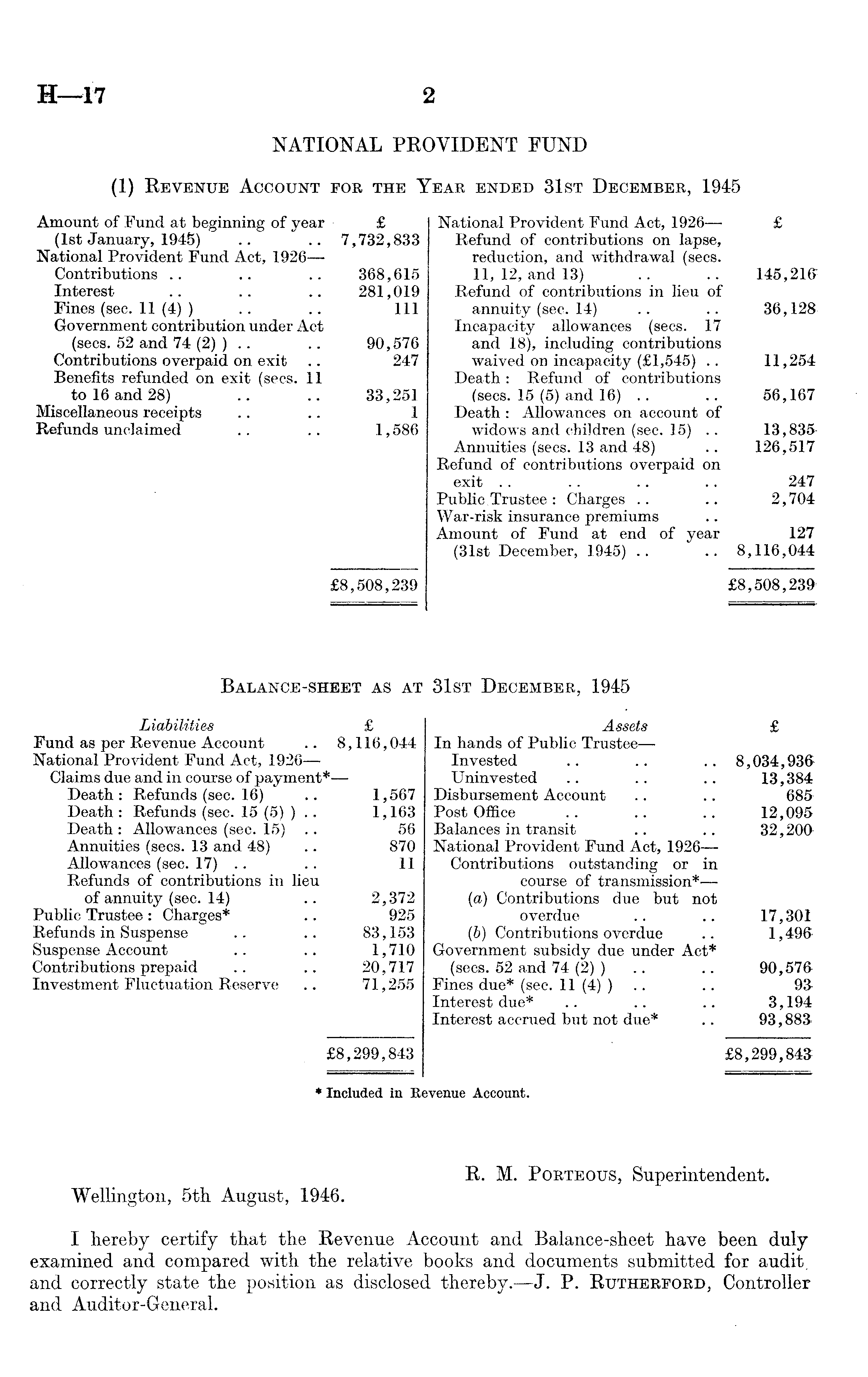 NATIONAL PROVIDENT FUND (1) Revenue Account for the Year ended 31st December, 1945 Amount of Fund at beginning of year £ National Provident Fund Act, 1926 £ (Ist January, 1945) .. .. 7,732,833 Refund of contributions on lapse, National Provident Fund Act, 1926 — reduction, and withdrawal (sees. Contributions.. .. .. 368,615 11, 12, and 13) .. .. 145,216 Interest .. .. .. 281,019 Refund of contributions in lieu of Fines (sec. 11 (4) ) .. .. 11l annuity (sec. 14) .. .. 36,128 Government contribution under Act Incapacity allowances (sees. 17 (sees. 52 and 74 (2) ,) .. .. 90,576 and 18), including contributions Contributions overpaid on exit .. 247 waived on incapacity (£1,545) .. 11,254 Benefits refunded on exit (sees. 11 Death : Refund of contributions to 16 and 28) .. .. 33.,.251 (sees. 15 (5) and 16) 56,167 Miscellaneous receipts .. .. 1 Death: Allowances on account of Refunds unclaimed .. .. 1,586 widows and children (sec. 15) .. 13,835 Annuities (sees. 13 and 48) .. 126,517 Refund of contributions overpaid on exit .. .. .. .. 247 Public Trustee : Charges .. .. 2,704 War-risk insurance premiums Amount of Fund at end of year 127 (31st December, 1945) .. .. 8,116,044 £8,508,239 £8,508,239-Balance-sheet as at 31st December, 1945 Liabilities £ Assets £ Fund as per Revenue Account .. 8,116,044 In hands of Public Trustee— National Provident Fund Act, 1926 Invested .. .. .. 8,034,936Claims due and in course of payment*— Uninvested .. .. .. 13,384 Death: Refunds (sec. 16) .. 1,567 Disbursement Account .. .. 685 Death: Refunds (sec. 15 (5) ).. 1,163 Post Office .. .. .. 12,095 Death: Allowances (sec. 15) .. 56 Balances in transit .. .. 32,200 Annuities (sees. 13 and 48) .. 870 National Provident Fund Act, 1926 Allowances (sec. 17) .. .. 11 Contributions outstanding or in Refunds of contributions in lieu course of transmission*— of annuity (sec. 14) .. 2,372 (a) Contributions due but not Public Trustee: Charges* .. 925 overdue .. .. 17,301 Refunds in Suspense .. .. 83,153 (b) Contributions overdue .. 1,496 Suspense Account .. .. 1,710 Government subsidy due under Act* Contributions prepaid .. .. 20,717 (sees. 52 and 74 (2) ) .. .. 90,570 Investment Fluctuation Reserve .. 71,255 Fines due* (sec. 11 (4) ) .. .. 93 Interest due* .. .. .. 3,194 Interest accrued but not due* .. 93,883 £8,299,843 £8,299,843
