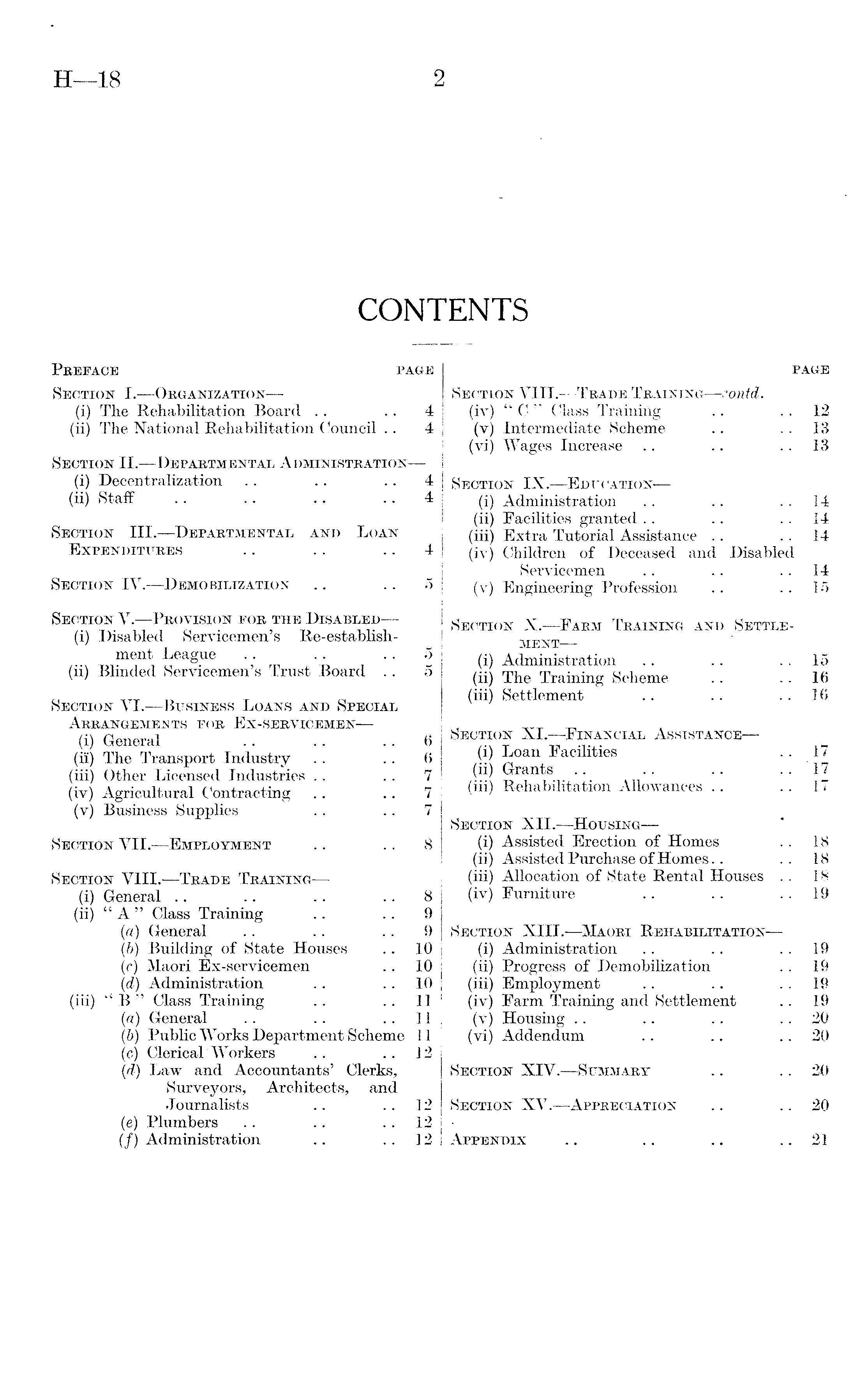 PAGE Section Vlll.—Trade Training— contd. (iv) "C" Class Training .. 12 (v) Intermediate Scheme .. 13 (vi) Wages Increase .. .. ..13 Section IX.—Education(i) Administration .. .. 14 (ii) Facilities granted .. .. 14 (iii) Extra Tutorial Assistance .. . . 14 (iv) Children of Deceased and Disabled Servicemen .. .. 14 (v) Engineering Profession .. .. 15 Section X.—Farm Training and Settlement — (i) Administration . . .. 15 (ii) The Training Scheme .. . . 16 (iii) Settlement .. .. ..16 Section Xl.—Financial Assistance—(i) Loan Facilities .. 17 (ii) Grants .. .. .. .. 17 (iii) Rehabilitation Allowances .. . . 17 Section Xll.—Housing—(i) Assisted Erection of Homes .. 18 (ii) Assisted Purchase of Homes.. .. 18 (iii) Allocation of State Rental Houses .. 18 (iv) Furniture .. .. 19 Section XIII.- —Maori Rehabilitation — (i) Administration .. .. 19 (ii) Progress of Demobilization .. 19 (iii) Employment .. .. 19 (iv) Farm Training and Settlement .. 19 (v) Housing .. .. .. .. 20 (vi) Addendum .. .. .. 20 Section XIV. —Summary .. .. 20 Section XV.—Appreciation .. .. 20 Appendix .. .. .. .. 21