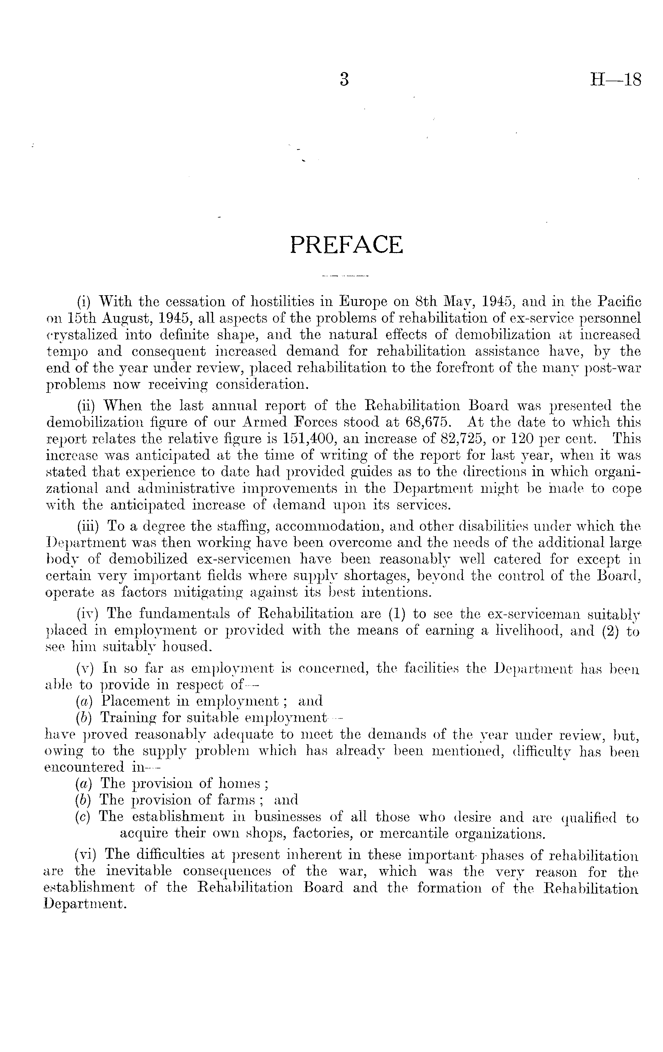 (i) With the cessation of hostilities in Europe on Bth May, 1945, and in the Pacific on 15th August, 1945, all aspects of the problems of rehabilitation of ex-service personnel crystalized into definite shape, and the natural effects of demobilization at increased tempo and consequent increased demand for rehabilitation assistance have, by the end of the year under review, placed rehabilitation to the forefront of the many post-war problems now receiving consideration. (ii) When the last annual report of the Rehabilitation Board was presented the demobilization figure of our Armed Forces stood at 68,675. At the date to which this report relates the relative figure is 151,400, an increase of 82,725, or 120 per cent. This increase was anticipated at the time of writing of the report for last year, when it was stated that experience to date had provided guides as to the directions in which organizational and administrative improvements in the Department might be made to cope with the anticipated increase of demand upon its services. (iii) To a degree the staffing, accommodation, and other disabilities under which the Department was then working have been overcome and the needs of the additional large body of demobilized ex-servicemen have been reasonably well catered for except in certain very important fields where supply shortages, beyond the control of the Board, operate as factors mitigating against its best intentions. (iv) The fundamentals of Rehabilitation are (1) to see the ex-serviceman suitably placed in employment or provided with the means of earning a livelihood, and (2) to see him suitably housed. (v) In so far as employment is concerned, the facilities the Department has been able to provide in respect of — (a) Placement in employment; and (b) Training for suitable employment—have proved reasonably adequate to meet the demands of the year under review, but, owing to the supply problem which has already been mentioned, difficulty has been encountered in—(a) The provision of homes ; (b) The provision of farms ; and (c) The establishment in businesses of all those who desire and are qualified to acquire their own shops, factories, or mercantile organizations. (vi) The difficulties at present inherent in these important- phases of rehabilitation are the inevitable consequences of the war, which was the very reason for the establishment of the Rehabilitation Board and the formation of the Rehabilitation Department.