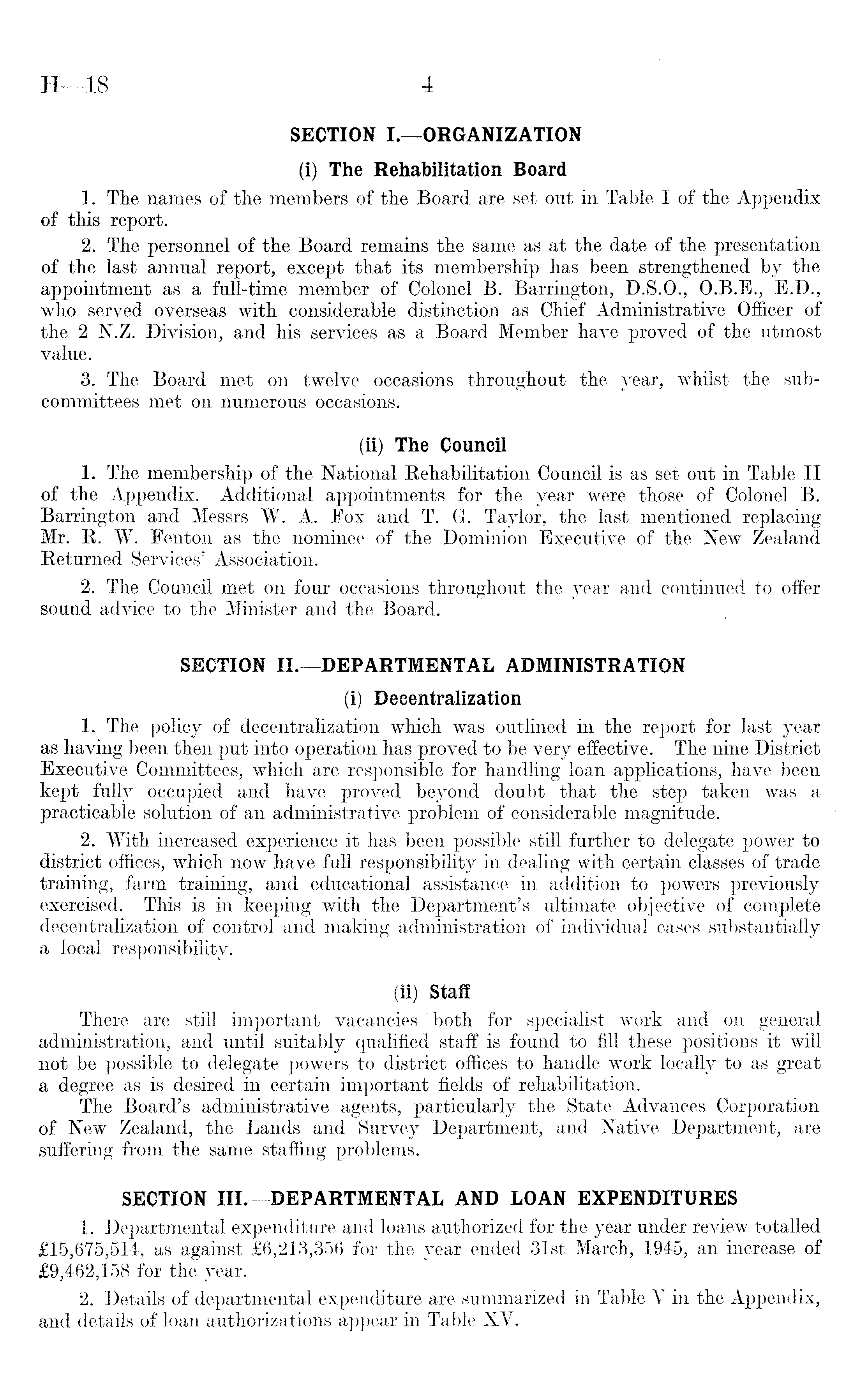 SECTION I.—ORGANIZATION (i) The Rehabilitation Board 1. The names of the members of the Board are set out in Table I of the Appendix of this report. 2. The personnel of the Board remains the same as at the date of the presentation of the last annual report, except that its membership has been strengthened by the appointment as a full-time member of Colonel B. Barrington, D.5.0., 0.8. E., E.D., who served overseas with considerable distinction as Chief Administrative Officer of the 2 N.Z. Division, and his services as a Board Member have proved of the utmost value. 3. The Board met on twelve occasions throughout the year, whilst the subcommittees met on numerous occasions. (ii) The Council 1. The membership of the National Behabilitation Council is as set out in Table II of the Appendix. Additional appointments for the year were those of Colonel B. Barrington and Messrs W. A. Fox and T. G. Taylor, the last mentioned replacing Mr. R. W. Fenton as the nominee of the Dominion Executive of the New Zealand Returned Services' Association. 2. The Council met on four occasions throughout the year and continued to offer sound advice to the Minister and the Board. SECTION lI.—DEPARTMENTAL ADMINISTRATION (i) Decentralization 1. The policy of decentralization which was outlined in the report for last year as having been then put into operation has proved to be very effective. The nine District Executive Committees, which are responsible for handling loan applications, have been kept fully occupied and have proved beyond doubt that the step taken was a practicable solution of an administrative problem of considerable magnitude. 2. With increased experience it has been possible still further to delegate power to district offices, which now have full responsibility in dealing with certain classes of trade training, farm training, and educational assistance in addition to powers previously exercised. This is in keeping with the Department's ultimate objective of complete decentralization of control and making administration of individual cases substantially a local responsibility. (ii) Staff There are still important vacancies ' both for specialist work and on general administration, and until suitably qualified staff is found to fill these positions it will not be possible to delegate powers to district offices to handle work locally to as great a degree as is desired in certain important fields of rehabilitation. The Board's administrative agents, particularly the State Advances Corporation of New Zealand, the Lands and Survey Department, and Native Department, are suffering from the same staffing problems. SECTION 111.-DEPARTMENTAL AND LOAN EXPENDITURES 1. Departmental expenditure and loans authorized for the year under review totalled £15,675,514, as against £6,213,356 for the vear ended 31st March, 1945, an increase of £9,462,158 for the year. 2. Details of departmental expenditure are summarized in Table V in the Appendix, and details of loan authorizations appear in Table XV.