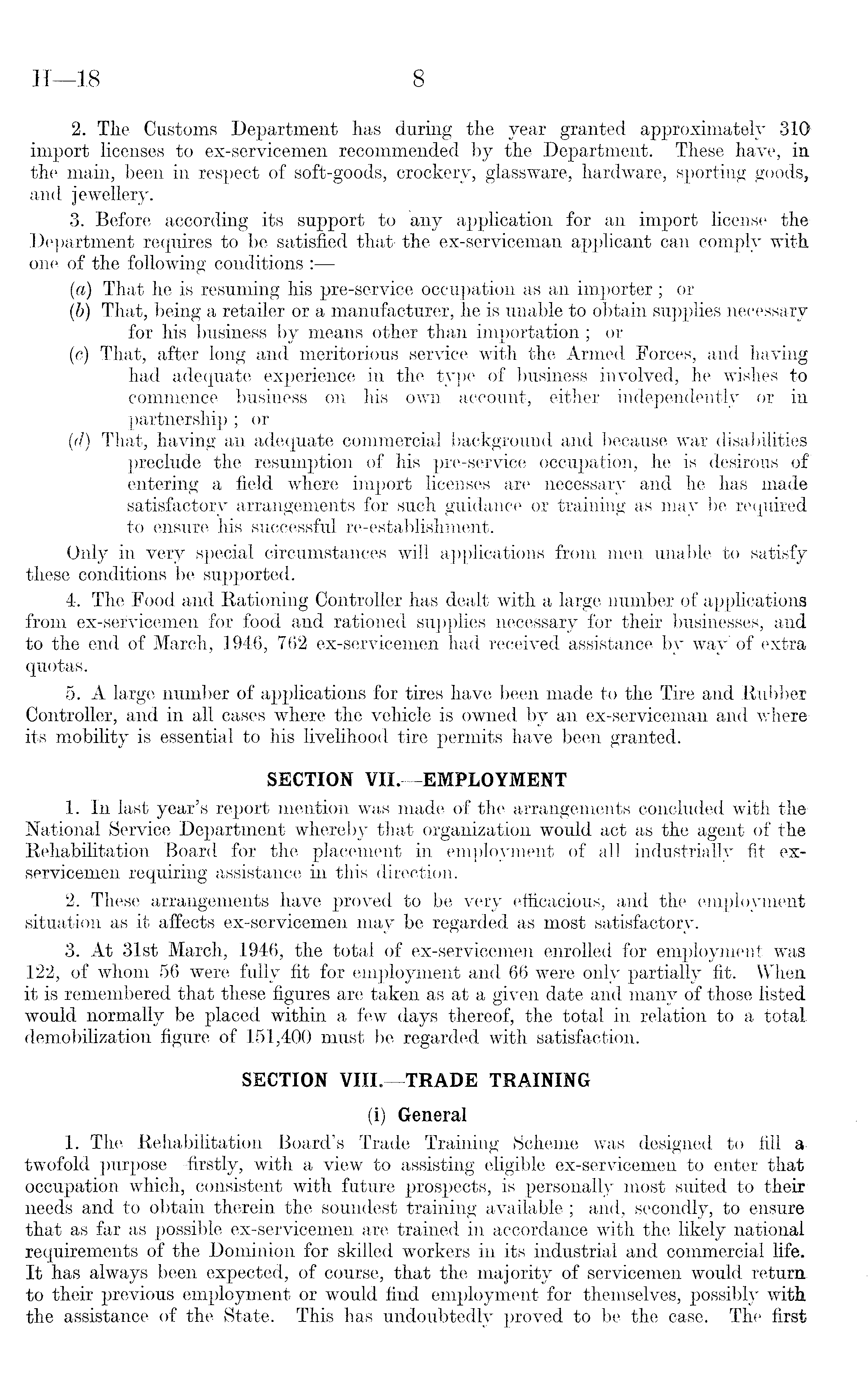 2. The Customs Department has during the year granted approximately 310 import licenses to ex-servicemen recommended by the Department. These have, in the main, been in respect of soft-goods, crockery, glassware, hardware, sporting goods, and jewellery. 3. Before according its support to any application for an import license the Department requires to be satisfied that the ex-serviceman applicant can comply with one of the following conditions : (a) That he is resuming his pre-service occupation as an importer ; or (b) That, being a retailer or a manufacturer, he is unable to obtain supplies necessary for his business by means other than importation ; or (c) That, after long and meritorious service with the Armed Forces, and having had adequate experience in the type of business involved, he wishes to commence business on his own account, either independently or in partnership ; or ((/) That, having an adequate commercial background and because war disabilities preclude the resumption of his pre-service occupation, he is desirous of entering a field where import licenses are necessary and he has made satisfactory arrangements for such guidance or training as may be required to ensure his successful re-establishment. Only in very special circumstances will applications from men unable to satisfy these conditions be supported. 4. The Food and Rationing Controller has dealt with a large number of applications from ex-servicemen for food and rationed supplies necessary for their businesses, and to the end of March, 1946, 762 ex-servicemen had received assistance by way of extra quotas. 5. A large number of applications for tires have been made to the Tire and Rubber Controller, and in all cases where the vehicle is owned by an ex-serviceman and where its mobility is essential to his livelihood tire permits have been granted. SECTION VII.—EMPLOYMENT 1. In last year's report mention was made of the arrangements concluded with the National Service Department whereby that organization would act as the agent of the Rehabilitation Board for the placement in employment of all industrially fit exservicemen requiring assistance in this direction. 2. These arrangements have proved to be very efficacious, and the employment situation as it affects ex-servicemen may be regarded as most satisfactory. 3. At 31st March, 1946, the total of ex-servicemen enrolled for employment was 122, of whom 56 were fully fit for employment and 66 were only partially fit. When it is remembered that these figures are taken as at a given date and many of those listed would normally be placed within a few days thereof, the total in relation to a total, demobilization figure of 151,400 must be regarded with satisfaction. SECTION VIII.—TRADE TRAINING (i) General 1. The Rehabilitation Board's Trade Training Scheme was designed to fill a twofold purpose —firstly, with a view to assisting eligible ex-servicemen to enter that occupation which, consistent with future prospects, is personally most suited to their needs and to obtain therein the soundest training available ; and, secondly, to ensure that as far as possible ex-servicemen are trained in accordance with the likely national requirements of the Dominion for skilled workers in its industrial and commercial life. It has always been expected, of course, that the majority of servicemen would return to their previous employment or would find employment for themselves, possibly with the assistance of the State. This has undoubtedly proved to be the case. The first