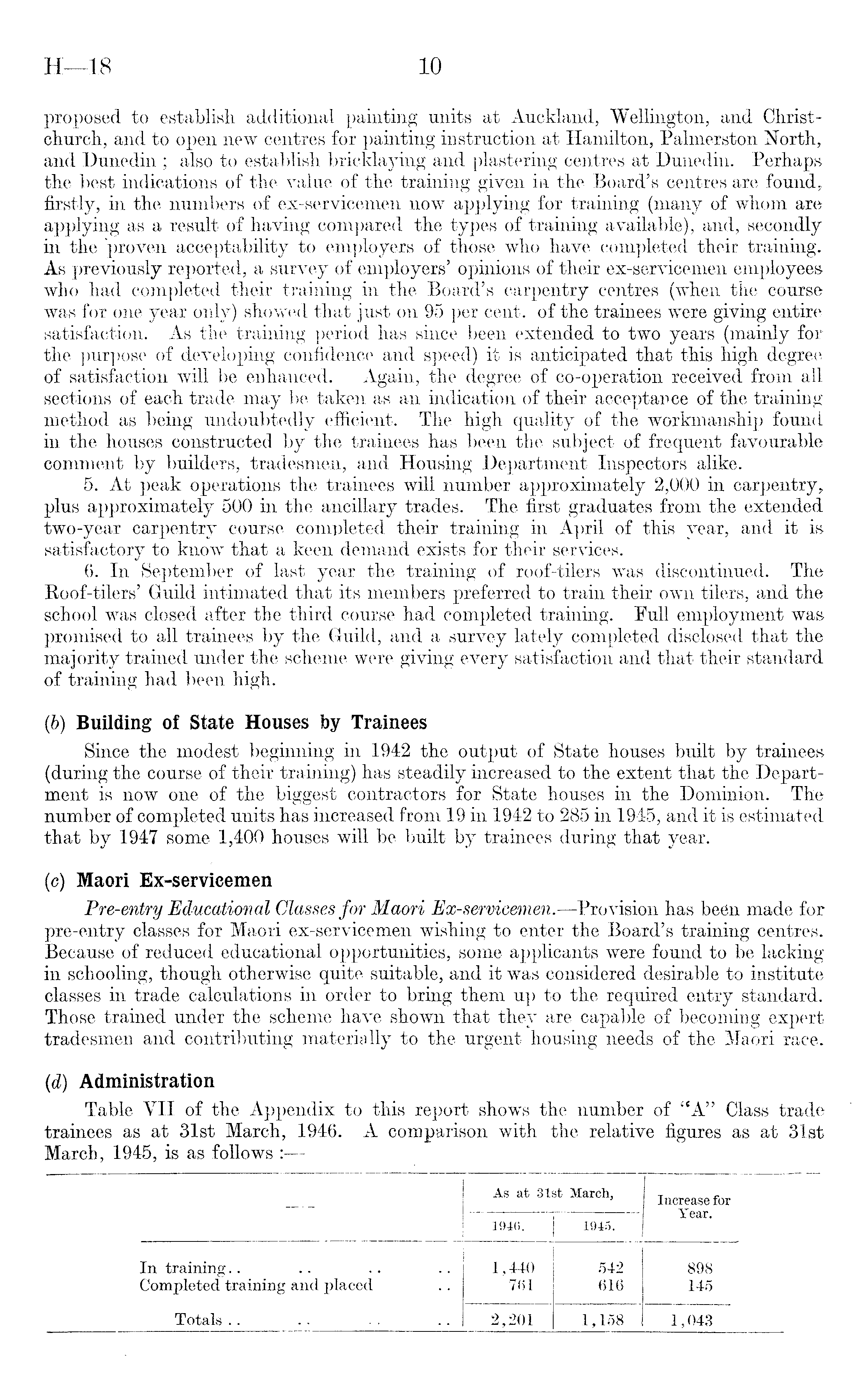 proposed to establish additional painting units at Auckland, Wellington, and Christchurch, and to open new centres for painting instruction at Hamilton, Palmerston North, and Dunedin ; also to establish bricklaying and plastering centres at Dunedin. Perhaps the best indications of the value of the training given in the Board's centres are found, firstly, in the numbers of ex-servicemen now applying for training (many of whom are applying as a result of having compared the types of training available), and, secondly in the "proven acceptability to employers of those who have completed their training. As previously reported, a survey of employers' opinions of their ex-servicemen employees who had completed their training in the Board's carpentry centres (when the course was for one year only) showed that just on 95 per cent, of the trainees were giving entire satisfaction. As the training period has since been extended to two years (mainly for the purpose of developing confidence and speed) it is anticipated that this high degree of satisfaction will be enhanced. Again, the degree of co-operation received from all sections of each trade may be taken as an indication of their acceptance of the training method as being undoubtedly efficient. The high quality of the workmanship found in the houses constructed by the trainees has been the subject of frequent favourable comment by builders, tradesmen, and Housing Department Inspectors alike. 5. At peak operations the trainees will number approximately 2,000 in carpentry, plus approximately 500 in the ancillary trades. The first graduates from the extended two-year carpentry course completed their training in April of this year, and it is satisfactory to know that a keen demand exists for their services. 6. In September of last year the training of roof-tilers was discontinued. The Koof-tilers' Guild intimated that its members preferred to train their own tilers, and the school was closed after the third course had completed training. Full employment was promised to all trainees by the Guild, and a survey lately completed disclosed that the majority trained under the scheme were giving every satisfaction and that their standard of training had been high. (6) Building of State Houses by Trainees Since the modest beginning in 1942 the output of State houses built by trainees (during the course of their training) has steadily increased to the extent that the Department is now one of the biggest contractors for State houses in the Dominion. The number of completed units has increased from 19 in 1942 to 285 in 1945, and it is estimated that by 1947 some 1,400 houses will be built by trainees during that year. (c) Maori Ex-servicemen Pre-entry Educational Classes for Maori Ex-servicemen. —Provision has been made for pre-entry classes for Maori ex-servicemen wishing to enter the Board's training centres. Because of reduced educational opportunities, some applicants were found to be lacking in schooling, though otherwise quite suitable, and it was considered desirable to institute classes in trade calculations in order to bring them up to the required entry standard. Those trained under the scheme have shown that they are capable of becoming expert tradesmen and contributing materially to the urgent housing needs of the Maori race.