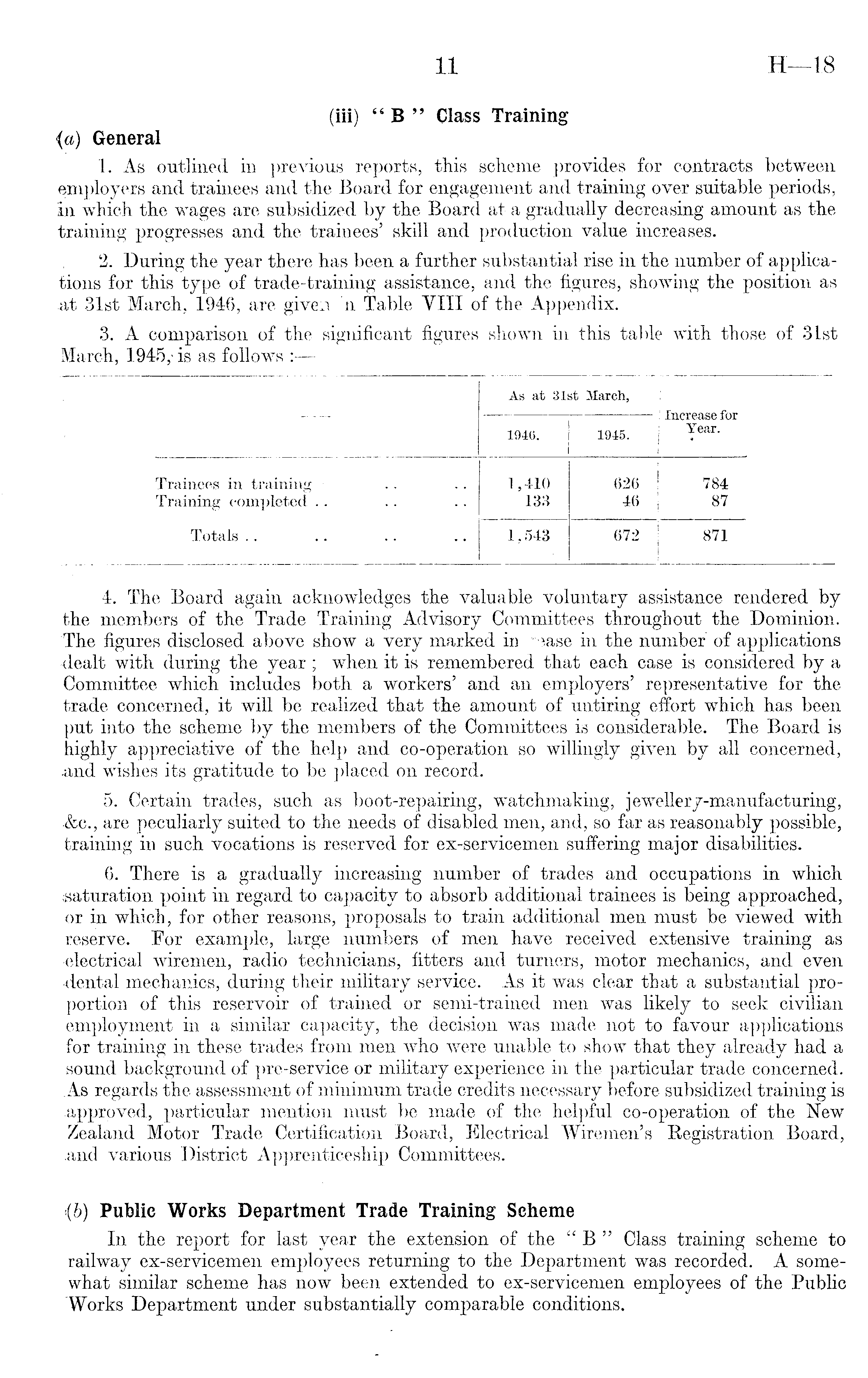 4. The Board again acknowledges the valuable voluntary assistance rendered by the members of the Trade Training Advisory Committees throughout the Dominion. The figures disclosed above show a very marked in in the number of applications •dealt with during the year ; when it is remembered that each case is considered by a •Committee which includes both a workers' and an employers' representative for the trade concerned, it will be realized that the amount of untiring effort which has been put into the scheme by the members of the Committees is considerable. The Board is highly appreciative of the help and co-operation so willingly given by all concerned, and wishes its gratitude to be placed on record. 5. Certain trades, such as boot-repairing, watchmaking, jewellery-manufacturing, •&c, are peculiarly suited to the needs of disabled men, and, so far as reasonably possible, training in such vocations is reserved for ex-servicemen suffering major disabilities. 6. There is a gradually increasing number of trades and occupations in which saturation point in regard to capacity to absorb additional trainees is being approached, •or in which, for other reasons, proposals to train additional men must be viewed with reserve. For example, large numbers of men have received extensive training as •electrical wiremen, radio technicians, fitters and turners, motor mechanics, and even •dental mechanics, during their military service. As it was clear that a substantial proportion of this reservoir of trained or semi-trained men was likely to seek civilian •employment in a similar capacity, the decision was made not to favour applications for training in these trades from men who were unable to show that they already had a sound background of pre-service or military experience in the particular trade concerned. As regards the assessment of minimum trade credits necessary before subsidized training is approved, particular mention must be made of the helpful co-operation of the New Zealand Motor Trade Certification Board, Electrical Wiremen's Registration Board, .and various District Apprenticeship Committees. (b) Public Works Department Trade Training Scheme In the report for last year the extension of the " B " Class training scheme to railway ex-servicemen employees returning to the Department was recorded. A somewhat similar scheme has now been extended to ex-servicemen employees of the Public "Works Department under substantially comparable conditions.