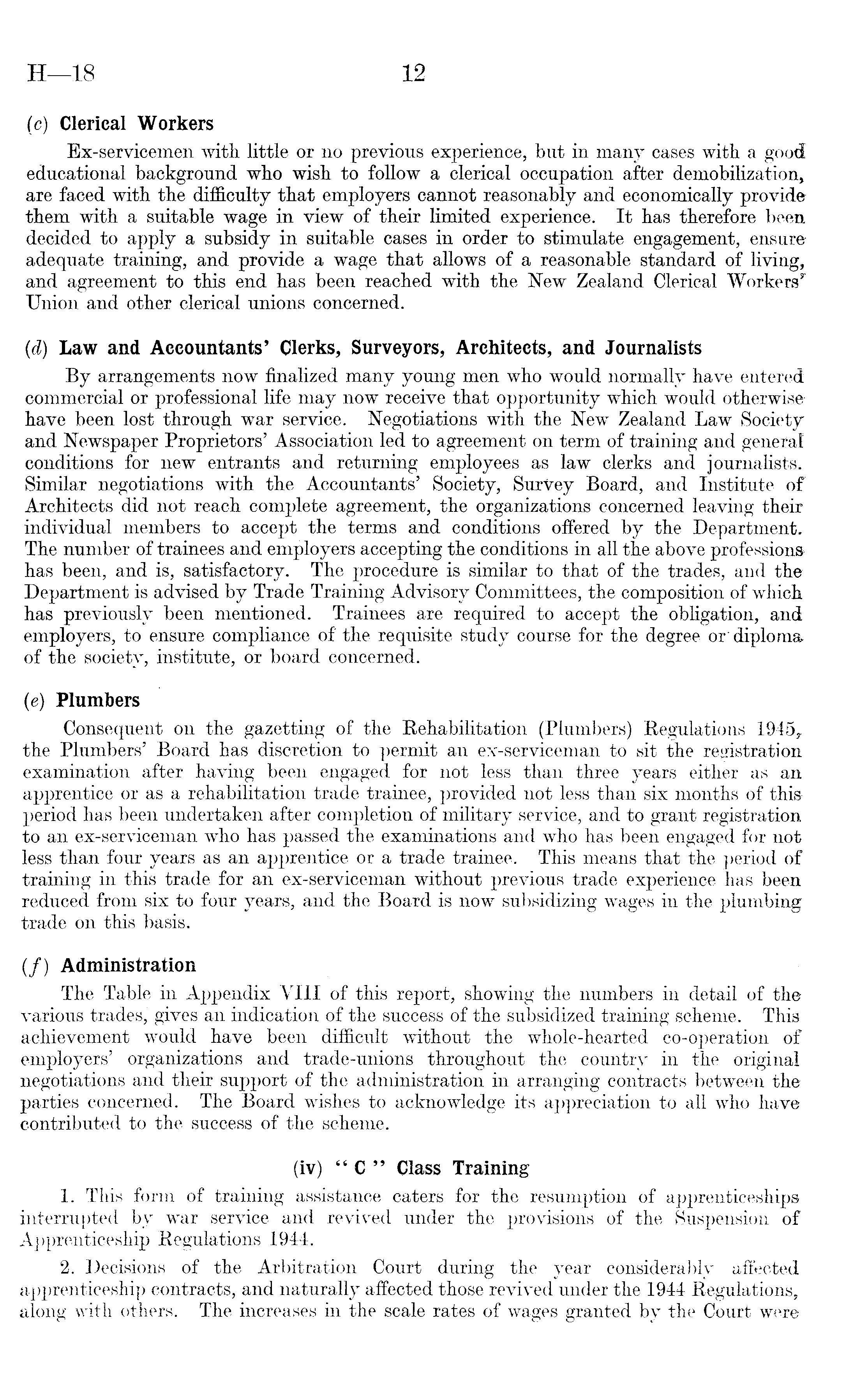 (c) Clerical Workers Ex-servicemen with little or no previous experience, but in many cases with a good educational background who wish to follow a clerical occupation after demobilization, are faced with the difficulty that employers cannot reasonably and economically provide them with a suitable wage in view of their limited experience. It has therefore been decided to apply a subsidy in suitable cases in order to stimulate engagement, ensure adequate training, and provide a wage that allows of a reasonable standard of living, and agreement to this end has been reached with the New Zealand Clerical Workers* Union and other clerical unions concerned. (d) Law and Accountants' Clerks, Surveyors, Architects, and Journalists By arrangements now finalized many young men who would normally have entered commercial or professional life may now receive that opportunity which would otherwise have been lost through war service. Negotiations with the New Zealand Law Society and Newspaper Proprietors' Association led to agreement on term of training and general conditions for new entrants and returning employees as law clerks and journalists. Similar negotiations with the Accountants' Society, Survey Board, and Institute of Architects did not reach complete agreement, the organizations concerned leaving their individual members to accept the terms and conditions offered by the Department. The number of trainees and employers accepting the conditions in all the above professions has been, and is, satisfactory. The procedure is similar to that of the trades, and the Department is advised by Trade Training Advisory Committees, the composition of which has previously been mentioned. Trainees are required to accept the obligation, and employers, to ensure compliance of the requisite study course for the degree or' diploma of the society, institute, or board concerned. (e) Plumbers Consequent on the gazetting of the Kehabilitation (Plumbers) Begulations 1945, the Plumbers' Board has discretion to permit an ex-serviceman to sit the registration examination after having been engaged for not less than three years either as an apprentice or as a rehabilitation trade trainee, provided not less than six months of this period has been undertaken after completion of military service, and to grant registration to an ex-serviceman who has passed the examinations and who has been engaged for not less than four years as an apprentice or a trade trainee. This means that the period of training in this trade for an ex-serviceman without previous trade experience has been reduced from six to four years, and the Board is now subsidizing wages in the plumbing trade on this basis. (/) Administration The Table in Appendix VIII of this report, showing the numbers in detail of the various trades, gives an indication of the success of the subsidized training scheme. This achievement would have been difficult without the whole-hearted co-operation of employers' organizations and trade-unions throughout the country in the original negotiations and their support of the administration in arranging contracts between the parties concerned. The Board wishes to acknowledge its appreciation to all who have contributed to the success of the scheme. (iv) " C " Class Training 1. This form of training assistance caters for the resumption of apprenticeships interrupted by war service and revived under the provisions of the Suspension of Apprenticeship Begulations 1944. 2. Decisions of the Arbitration Court during the year considerably affected apprenticeship contracts, and naturally affected those revived under the 1944 Regulations, along with others. The increases in the scale rates of wages granted by the Court were