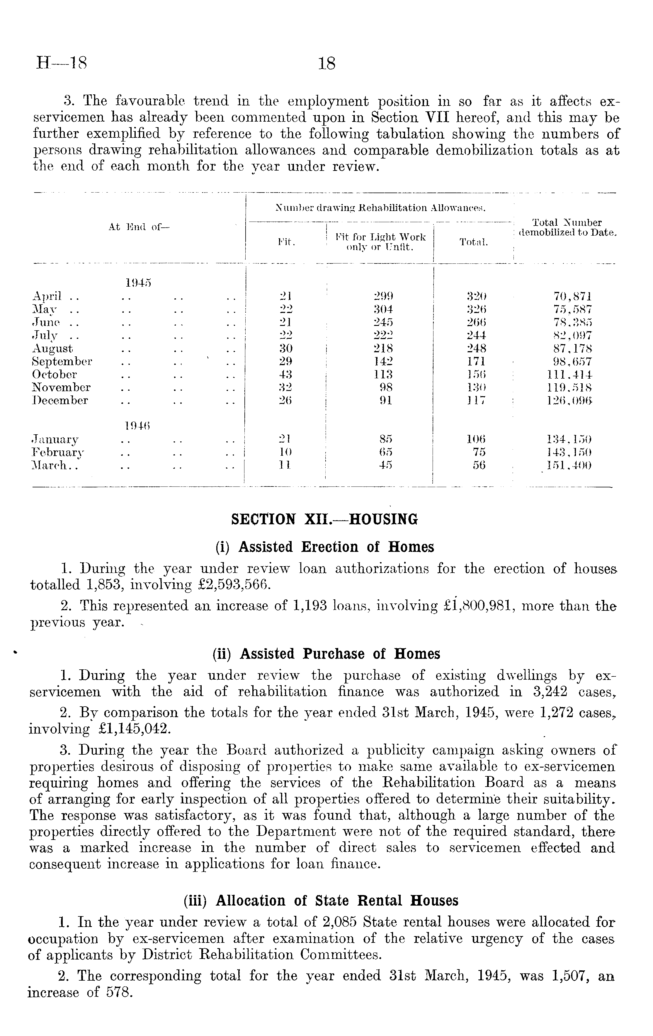 SECTION XII.—HOUSING (i) Assisted Erection of Homes 1. During the year under review loan authorizations for the erection of houses totalled 1,853, involving £2,593,566. 2. This represented an increase of 1,193 loans, involving £1,800,981, more than the previous year. - (ii) Assisted Purchase of Homes 1. During the year under review the purchase of existing dwellings by exservicemen with the aid of rehabilitation finance was authorized in 3,242 cases, 2. Bv comparison the totals for the year ended 31st March, 1945, were 1,272 cases., involving £1,145,042. 3. During the year the Board authorized a publicity campaign asking owners of properties desirous of disposing of properties to make same available to ex-servicemen requiring homes and offering the services of the Rehabilitation Board as a means of arranging for early inspection of all properties offered to determine their suitability. The response was satisfactory, as it was found that, although a large number of the properties directly offered to the Department were not of the required standard, there was a marked increase in the number of direct sales to servicemen effected and consequent increase in applications for loan finance. (iii) Allocation of State Rental Houses 1. In the year under review a total of 2,085 State rental houses were allocated for occupation by ex-servicemen after examination of the relative urgency of the cases of applicants by District Rehabilitation Committees. 2. The corresponding total for the year ended 31st March, 1945, was 1,507, an increase of 578.